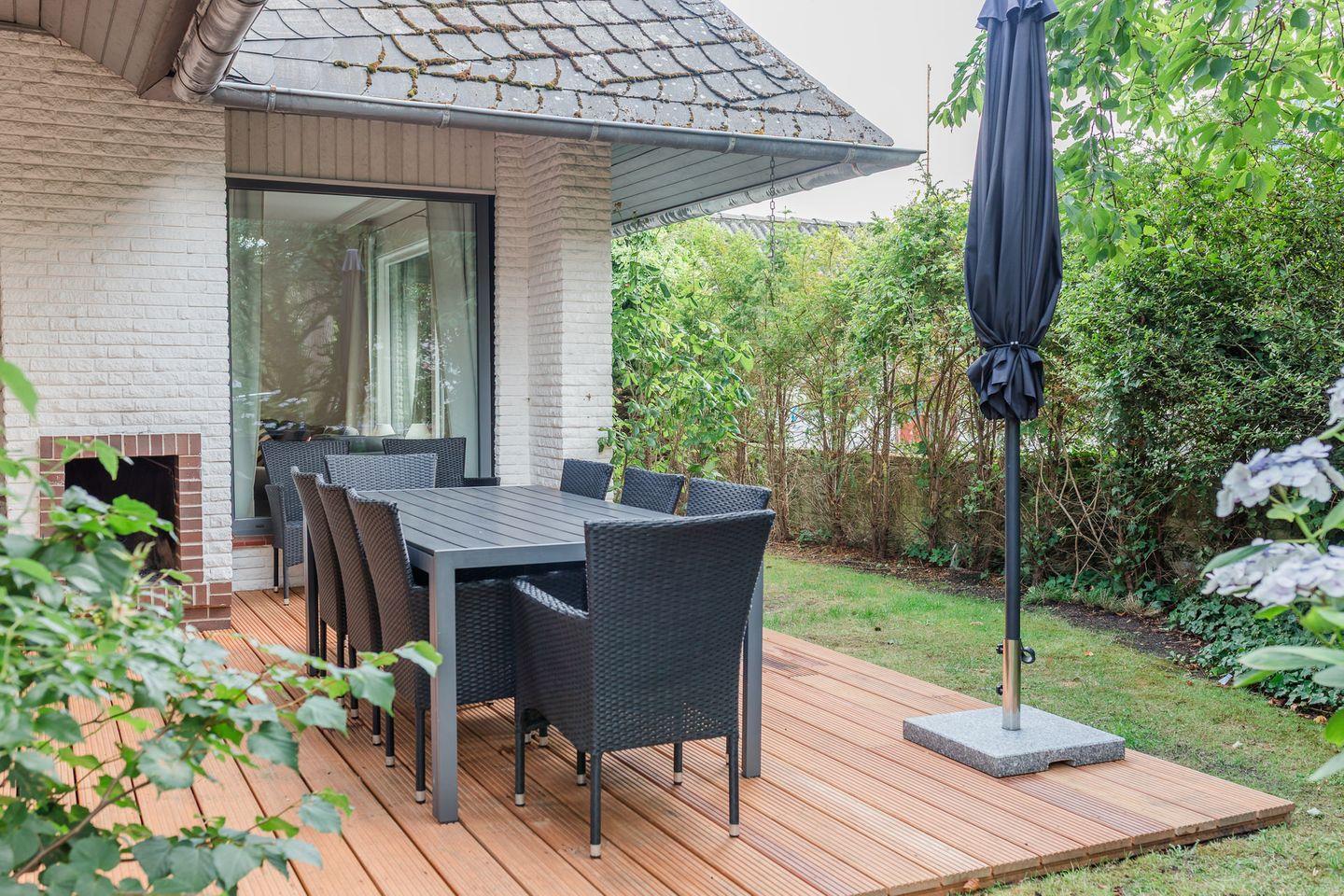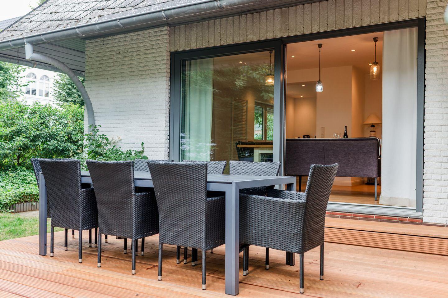 Die große Terrasse und der Garten laden zum Relaxen ein.