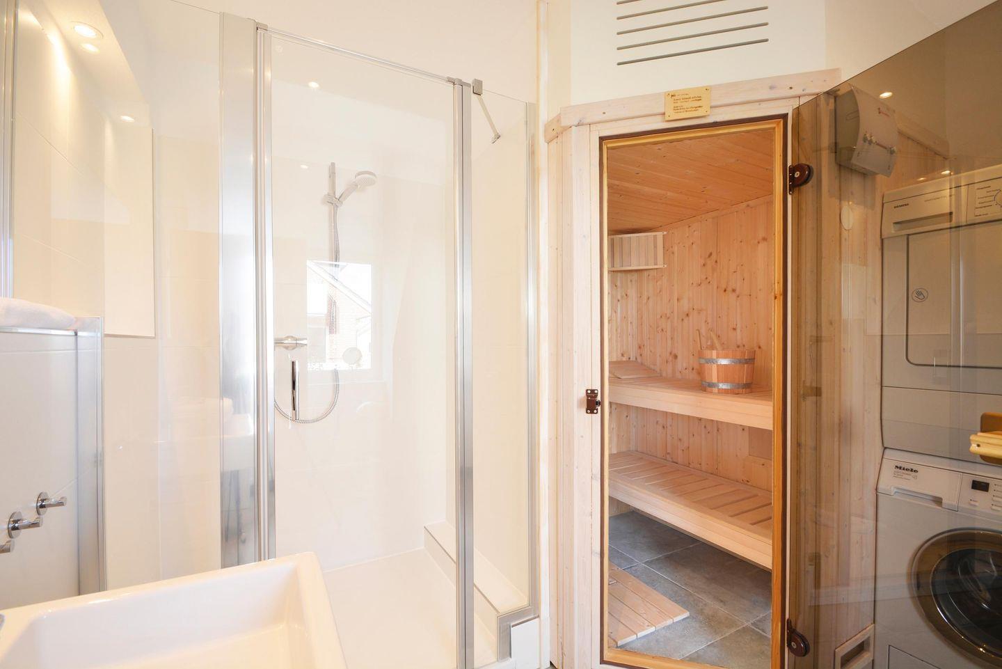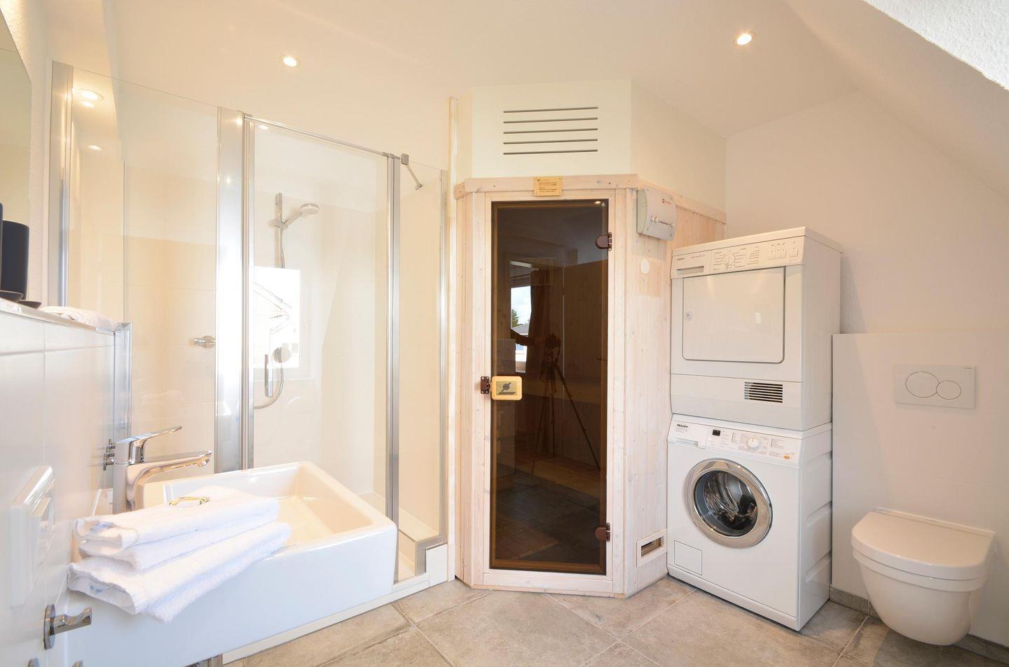 Im Erdgeschoss befindet sich das sehr großzügige, kombinierte Wohn-Esszimmer mit Küche, ein zweites Wohnzimmer sowie ein Schlafzimmer mit abgehendem Bad und Ankleidezimmer. Das Obergeschoss verfügt über vier weitere Schlafzimmer und 2 Bäder.