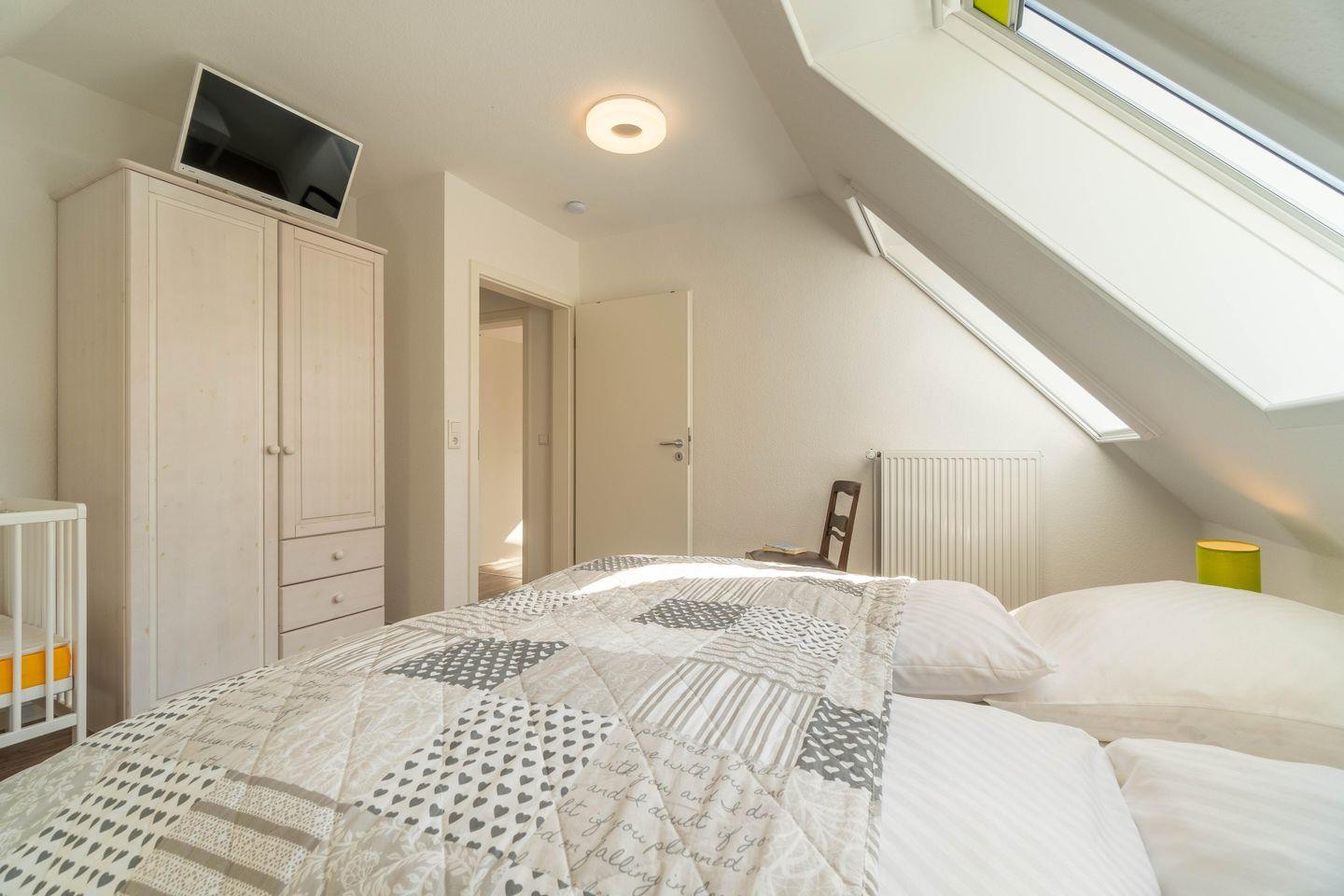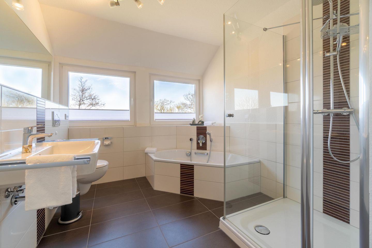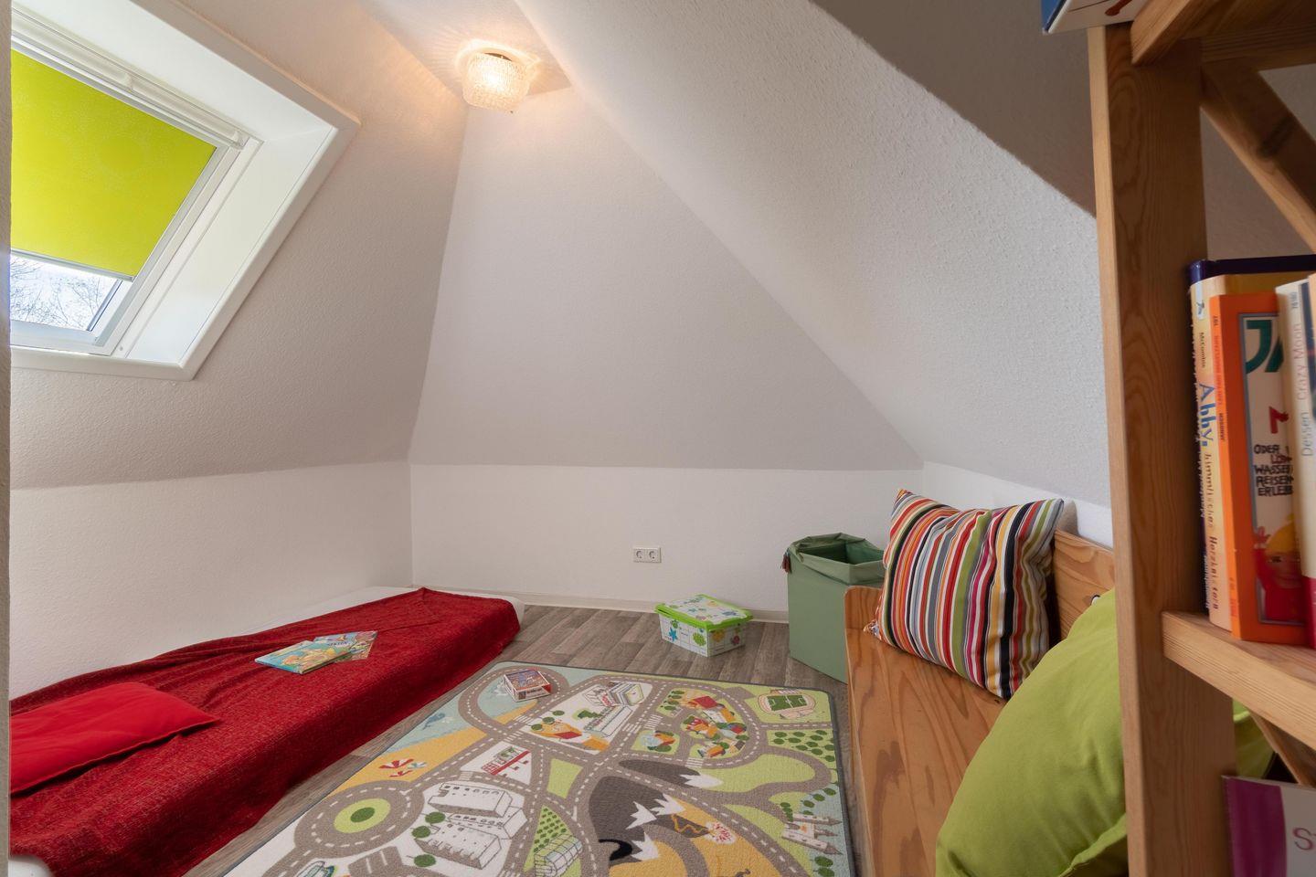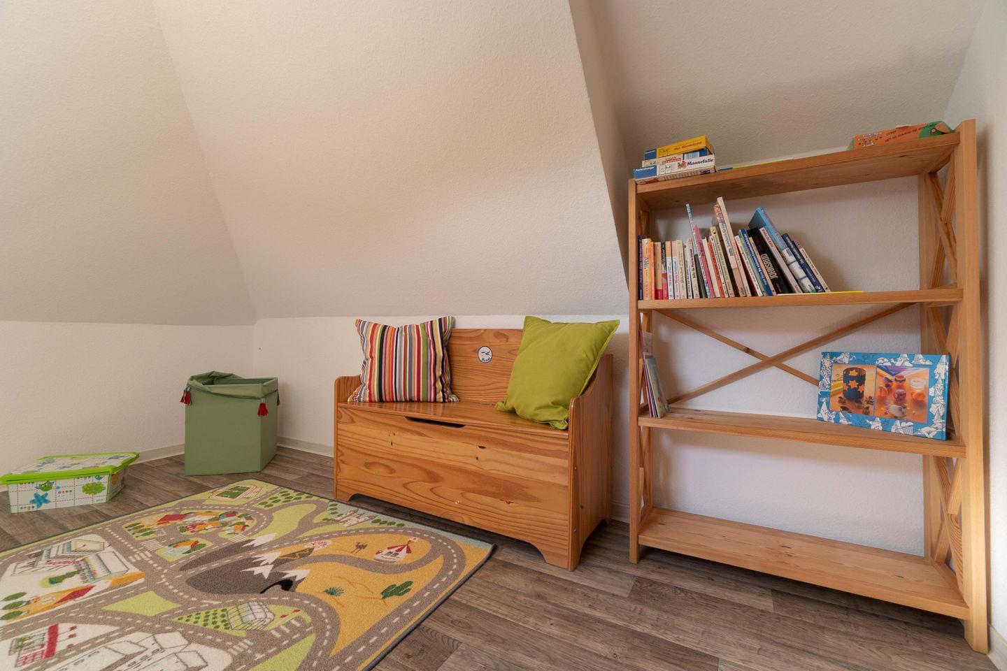 Die Obergeschosswohnung bietet Platz für bis zu 6 Personen und verfügt über ein schönes Wohn-Esszimmer, neue Küche, 3 Schlafzimmer und 2 Badezimmer. Über eine weitere Treppe gelangen Sie in das Dachgeschoss, in welchem sich ein Spielzimmer für die Kleinen befindet. Der Waschraum mit Waschmaschine und Trockner im Keller können von den Gästen beider Ferienwohnungen gemeinschaftlich kostenlos genutzt werden.