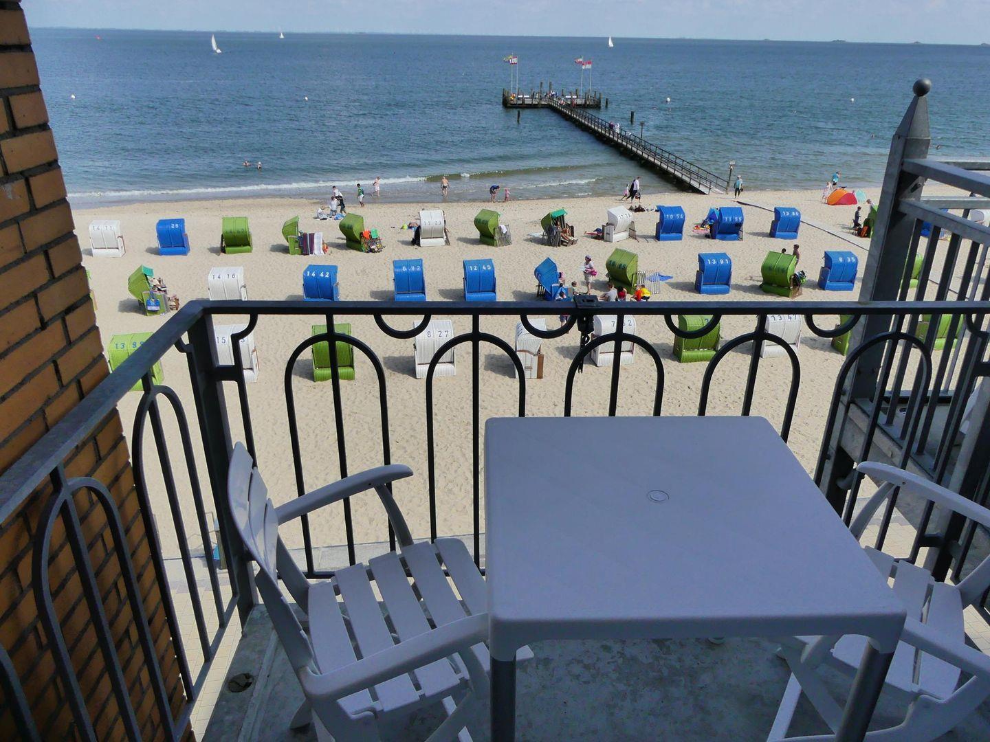 Die Wohnung befindet sich im 2.OG mit besonders guter Aussicht auf den Strand und das Meer. Einmalig ist der weite Blick aus den südöstlich zum Meer ausgerichteten, bodentiefen Fensterflächen in Küche und Wohnzimmer mit den beiden davor liegenden Balkonen in geschützter Lage. Bei offenen Fenstern können Sie das Meeresrauschen hören.