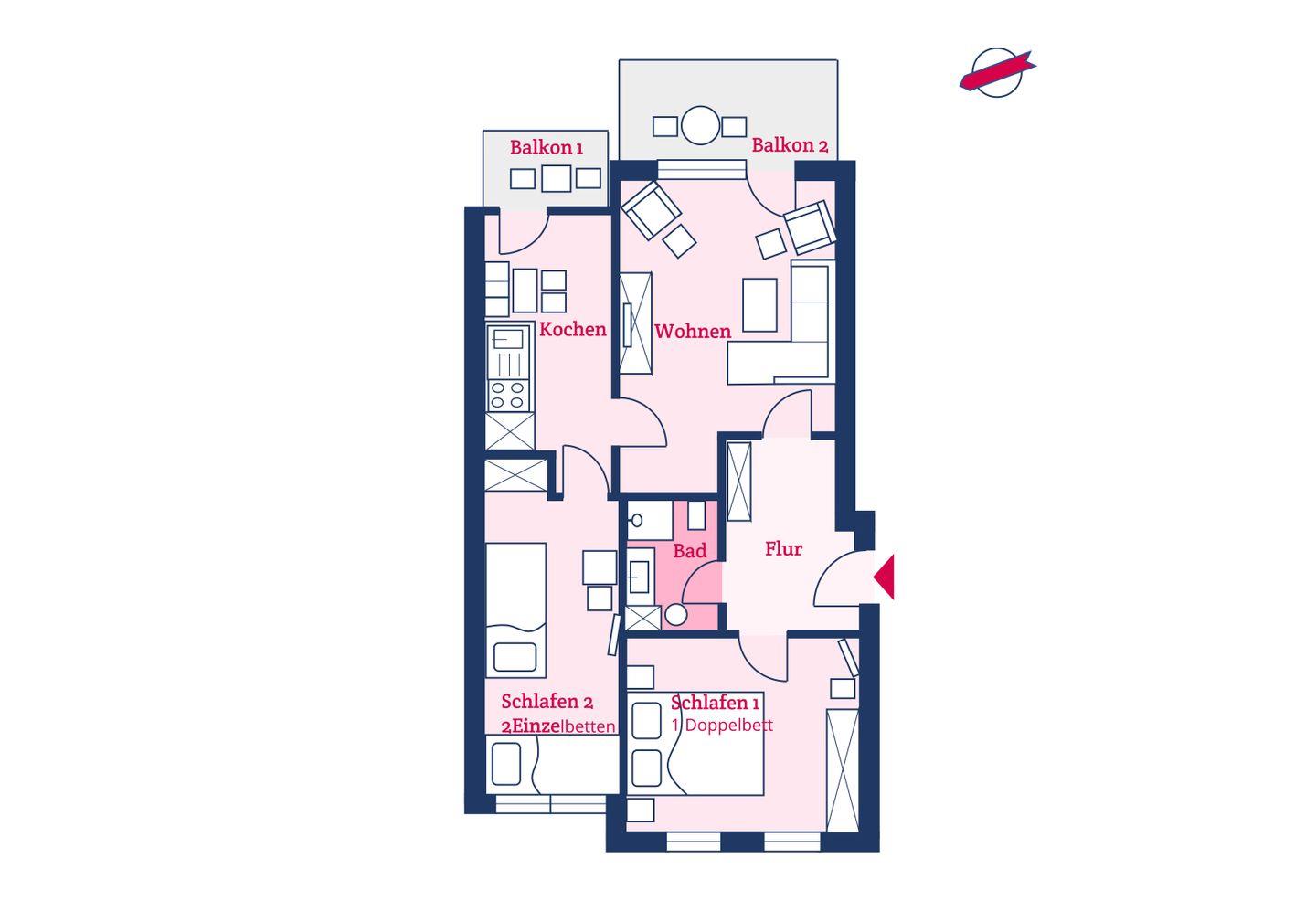 Die Wohnung Bornholm bietet Ihnen auf ca. 69 m² Grundfläche ein bequem eingerichtetes Wohnzimmer, zwei Schlafzimmer - eins mit Doppelbett, eins mit zwei Einzelbetten -, einen großzügigen Flur und eine voll ausgestattete Küche mit großem Esstisch. In diesem 3-Raum-Appartement finden vier erwachsene Personen ausreichend Platz. Zudem verfügt die Wohnung über eine Fußbodenheizung.