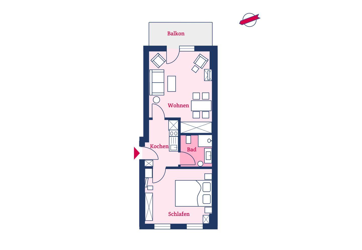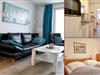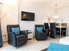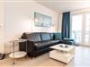 Das 2-Zimmer-Quartier Jütland für bis zu drei Personen (plus evtl. Haustier) mit ca. 46 m² Grundfläche besteht aus einem großen Wohnzimmer mit Echtleder-Schlafsofa und Essecke, einer separaten, kleinen Küche und einem Schlafzimmer mit Vollholzmöbeln aus Wildbuche. Zudem verfügt die Wohnung über eine Fußbodenheizung.