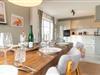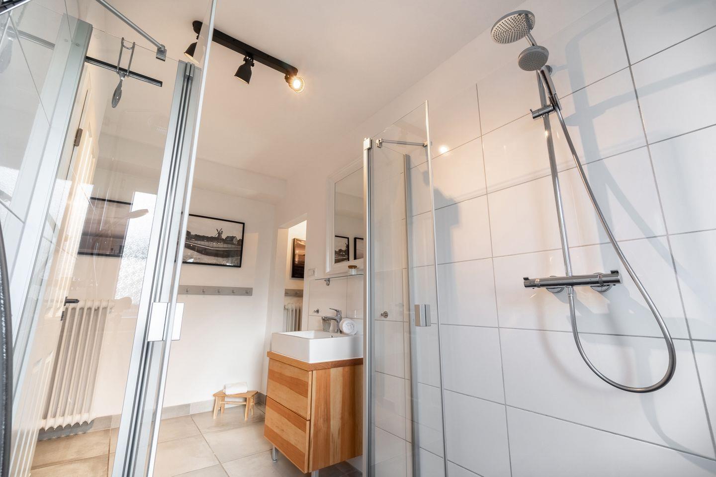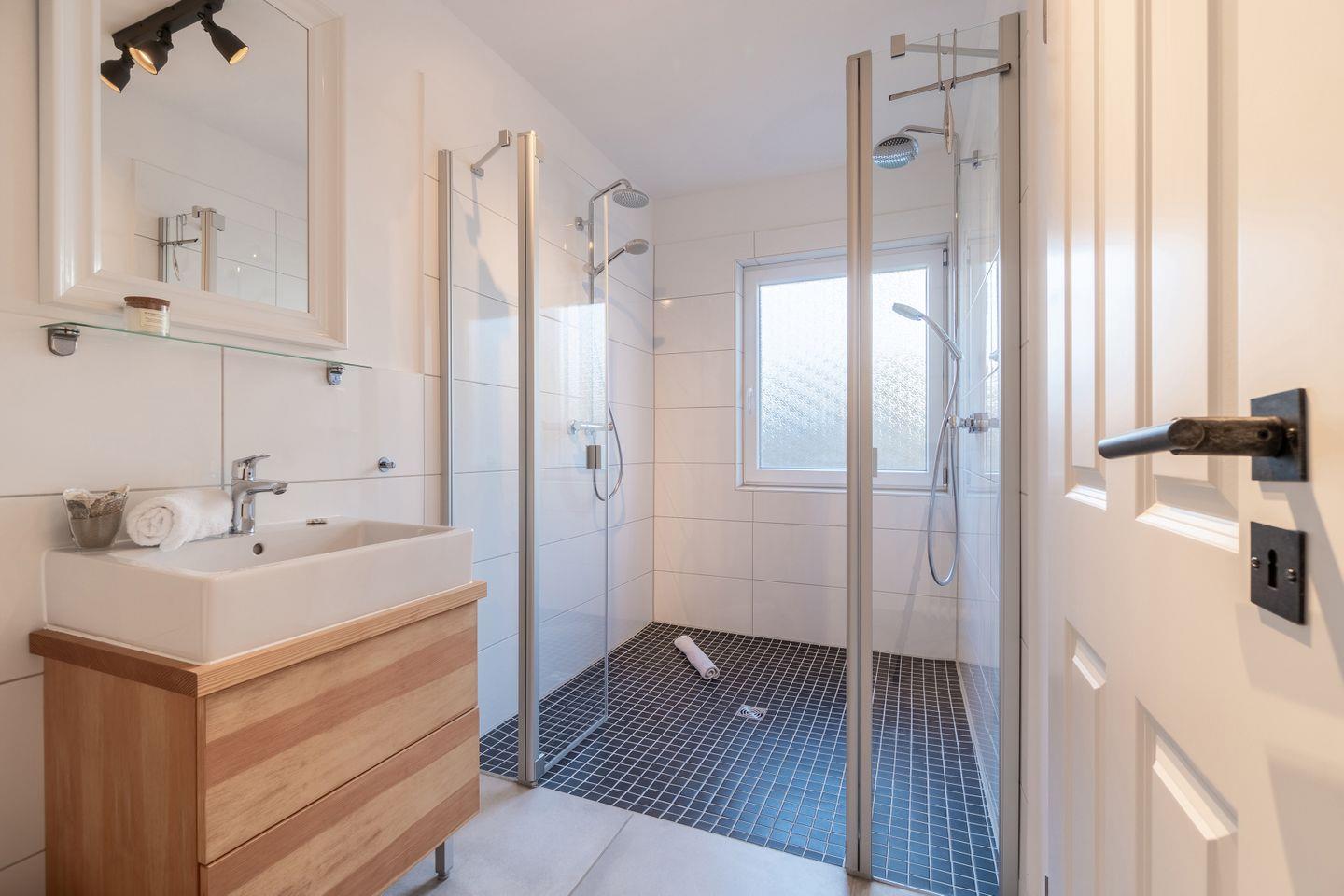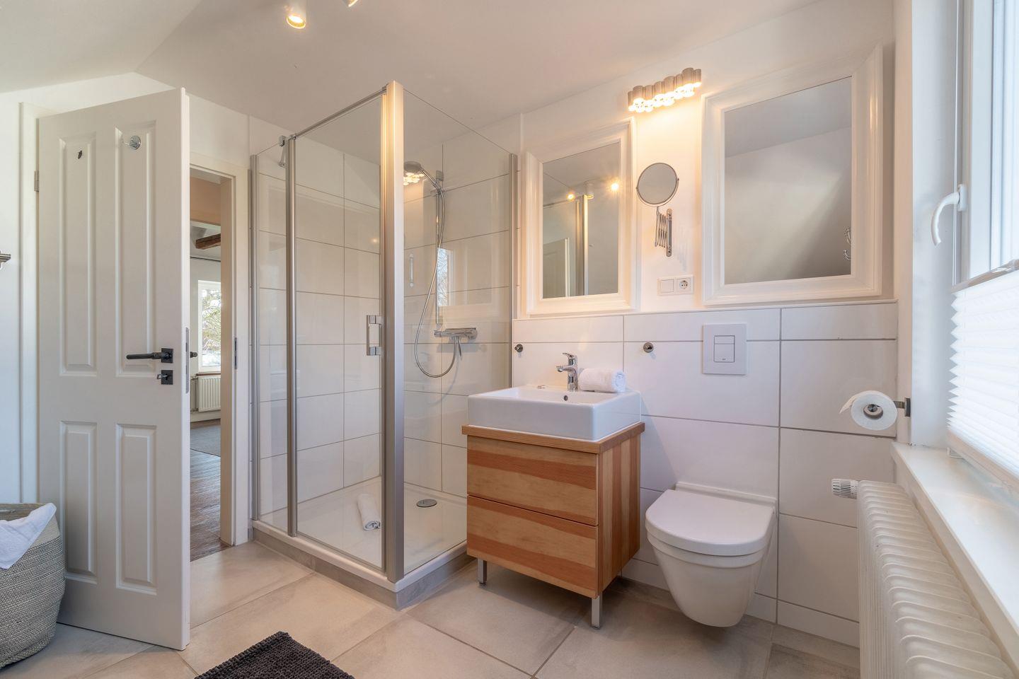 Im Erdgeschoss befindet sich der große, lichtdurchströmte Wohn- und Essbereich sowie die offene Landhausküche. Ebenfalls im Erdgeschoss gelegen ist die Sauna, ein Schlafzimmer mit Schlafsofa, ein Badezimmer mit Doppeldusche als auch ein Gäste-WC im Eingangsbereich des Ferienhauses.