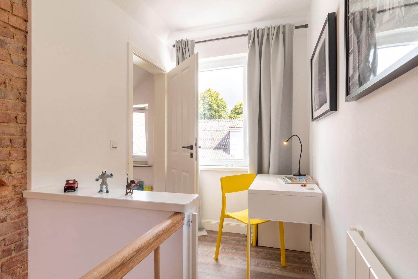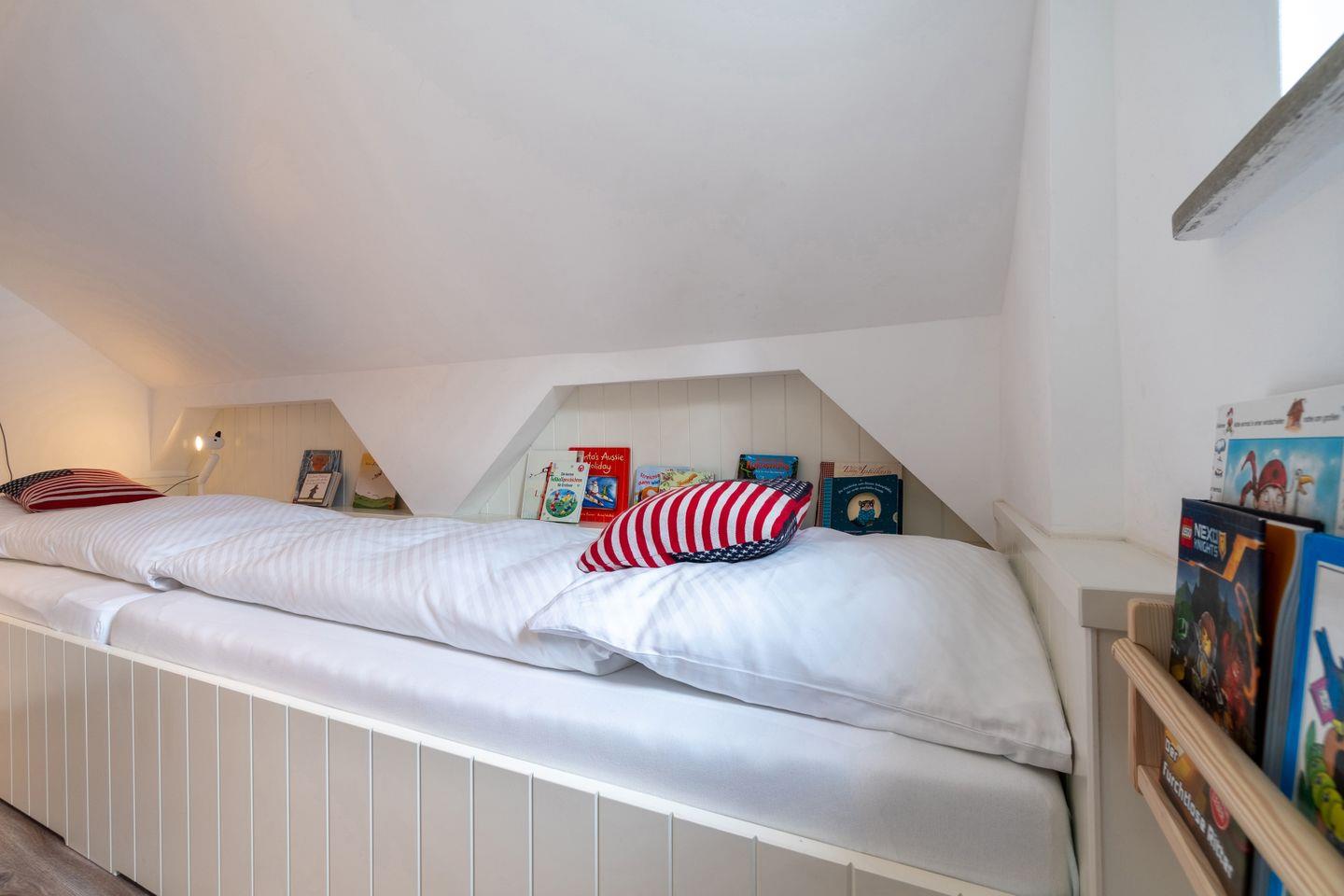 Über die antik wirkende, aufgearbeitete Holztreppe gelangt man in das Zwischengeschoss, in welchem sich ein Kinderzimmer mit zwei Einzelbetten befindet. Im Obergeschoss angekommen, befinden sich hier zwei Schlafräume - jeweils mit Boxspringbett ausgestattet - und ein sehr großes Badezimmer mit Dusche. Die Eigentümer weisen als Eltern kleiner Kinder darauf hin, dass sich im oberen Treppen-/ Flurbereich eine sog. Stiege befindet, welche für Kinder eine besondere Vorsicht gebietet und auf eigene Gefahr hin zu nutzen ist.