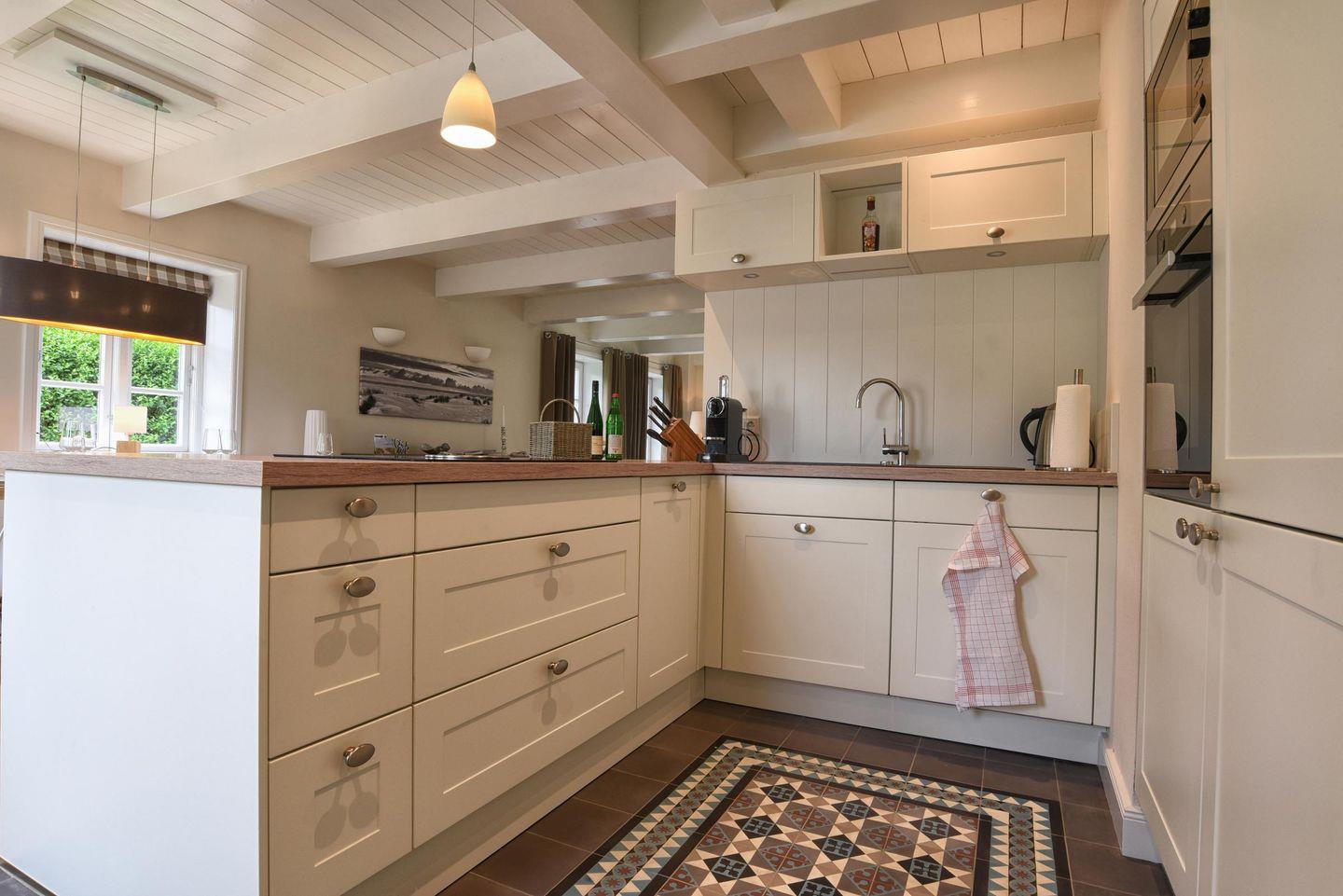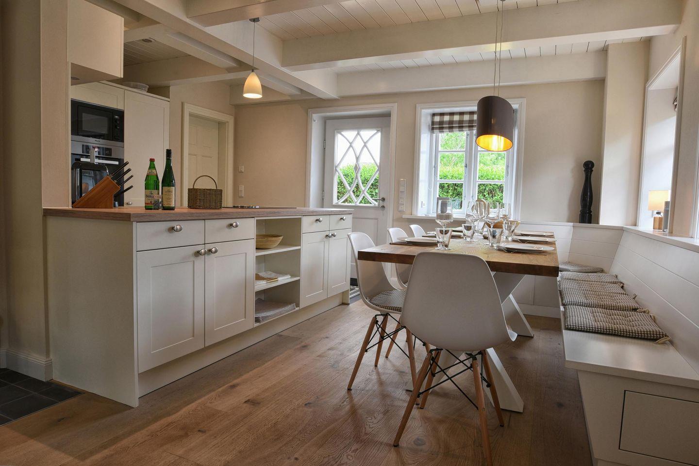 Sie betreten das Haus und befinden sich nun in dem großzügigen Eingangsbereich, der gefliesten Diele. Von hier aus gelangen Sie in das OG, zu einem Duschbad und zu dem eigentlichen Herzstück des Hauses, dem großzügigen Wohn-, Ess- und Küchenbereich. Ein großer Flachbildfernseher, eine Sofalandschaft, ein echter Mylin-Kachelofen und die große Küche mit den modernen Markengeräten, wie etwa eine Nespressomaschine, stellen nur einige der Highlights dar, die im Krabbenhus auf Sie warten. Eine Außentür verbindet den Küchenbereich direkt mit dem PKW-Stellplatz des Hauses, sodass Einkäufe kurzerhand in die Küche oder auch in die Speisekammer getragen werden können.
