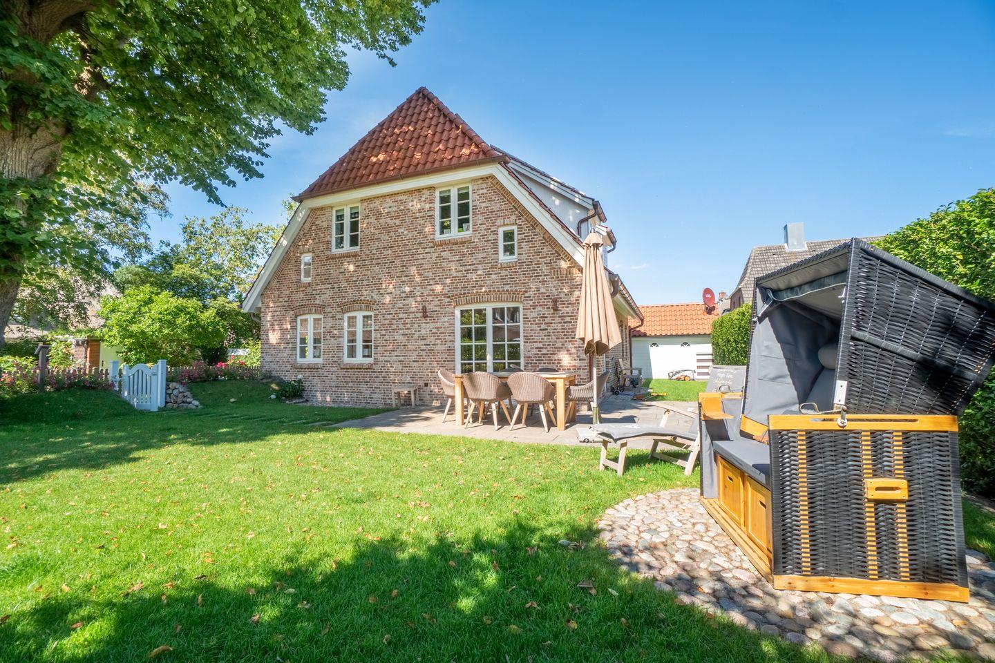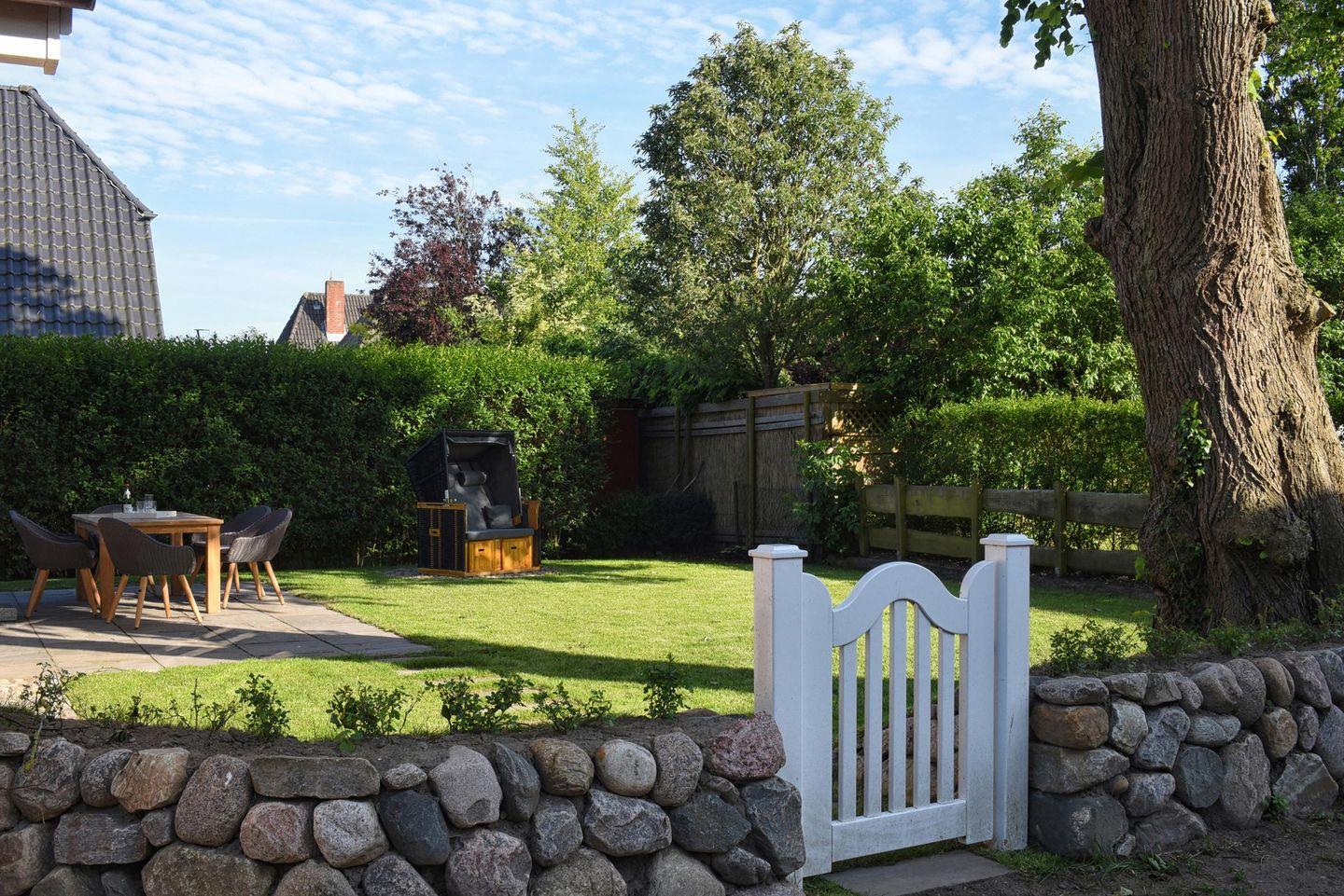 Der Außenbereich birgt neben einem PKW-Stellplatz mit E-Auto-Ladestation (kostenfrei nutzbar), einem Gartenhäuschen (Unterstellmöglichkeit für Fahrräder in den Sommermonaten), einem Terrassenplatz und großen Garten auch einen Strandkorb. Hier lässt sich die Sonne auch an stürmischeren Tagen des Jahres genießen.