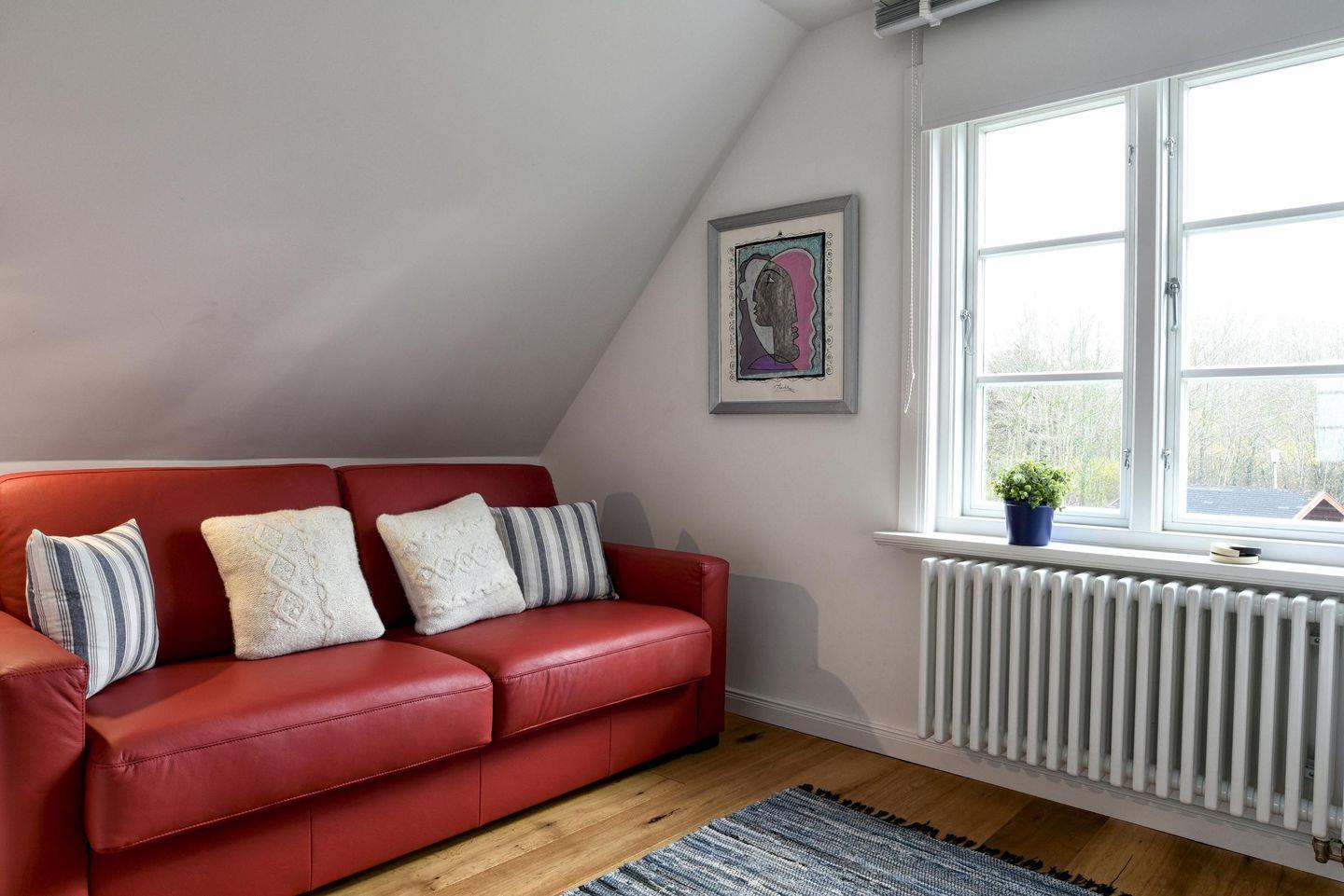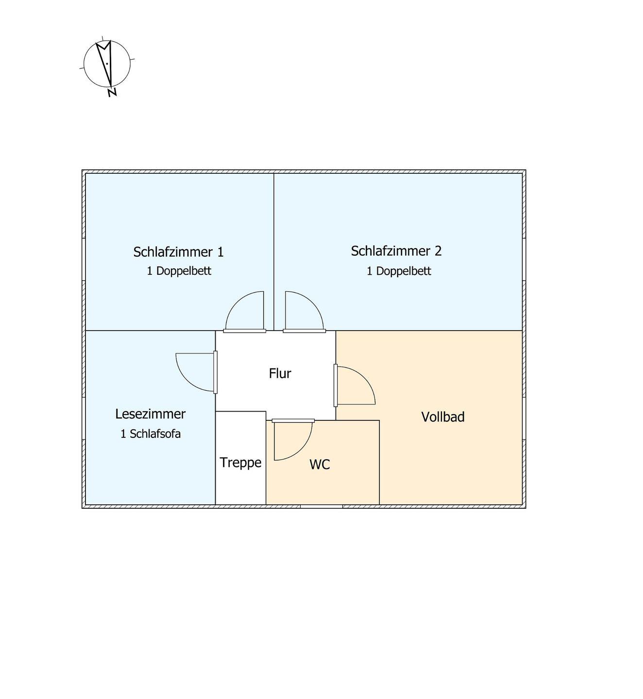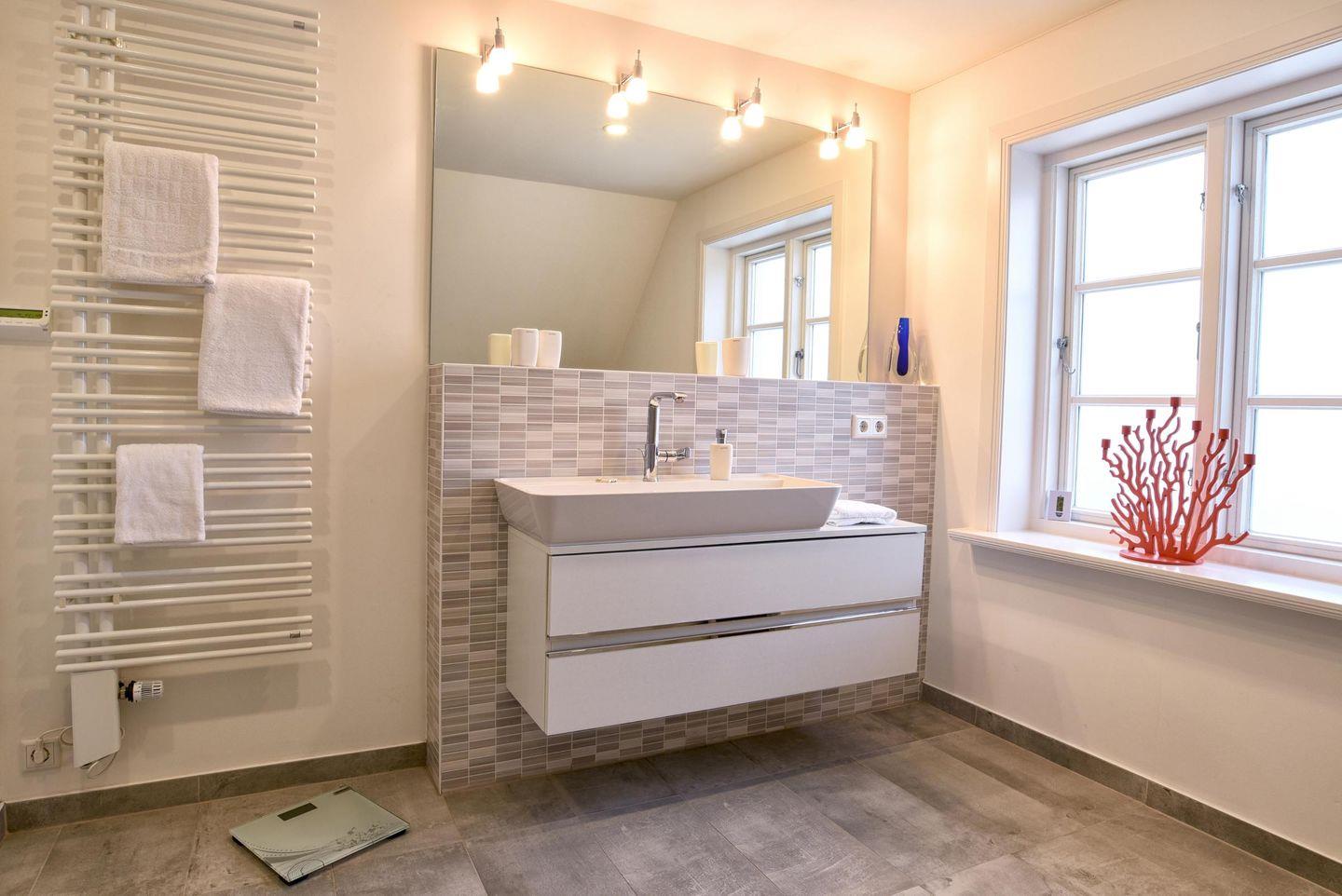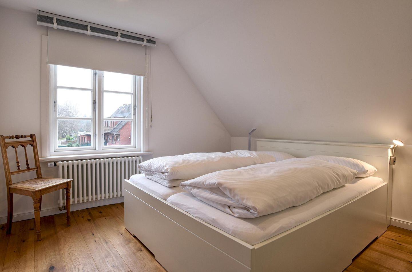 Im Obergeschoss liegen beide Schlafzimmer sowie ein weiteres Zimmer, indem sich eine Schlafcouch und ein Smart-TV befinden. Ebenfalls finden Sie ein Badezimmer mit einer Dusche und einer Badewanne und einer separaten Toilette im Obergeschoss. Die beiden Schlafzimmer sind jeweils mit einem Doppelbett und einem Einbauschrank möbliert. Sämtliche Einbauten wurden von einem Tischler der Insel Föhr handgefertigt.