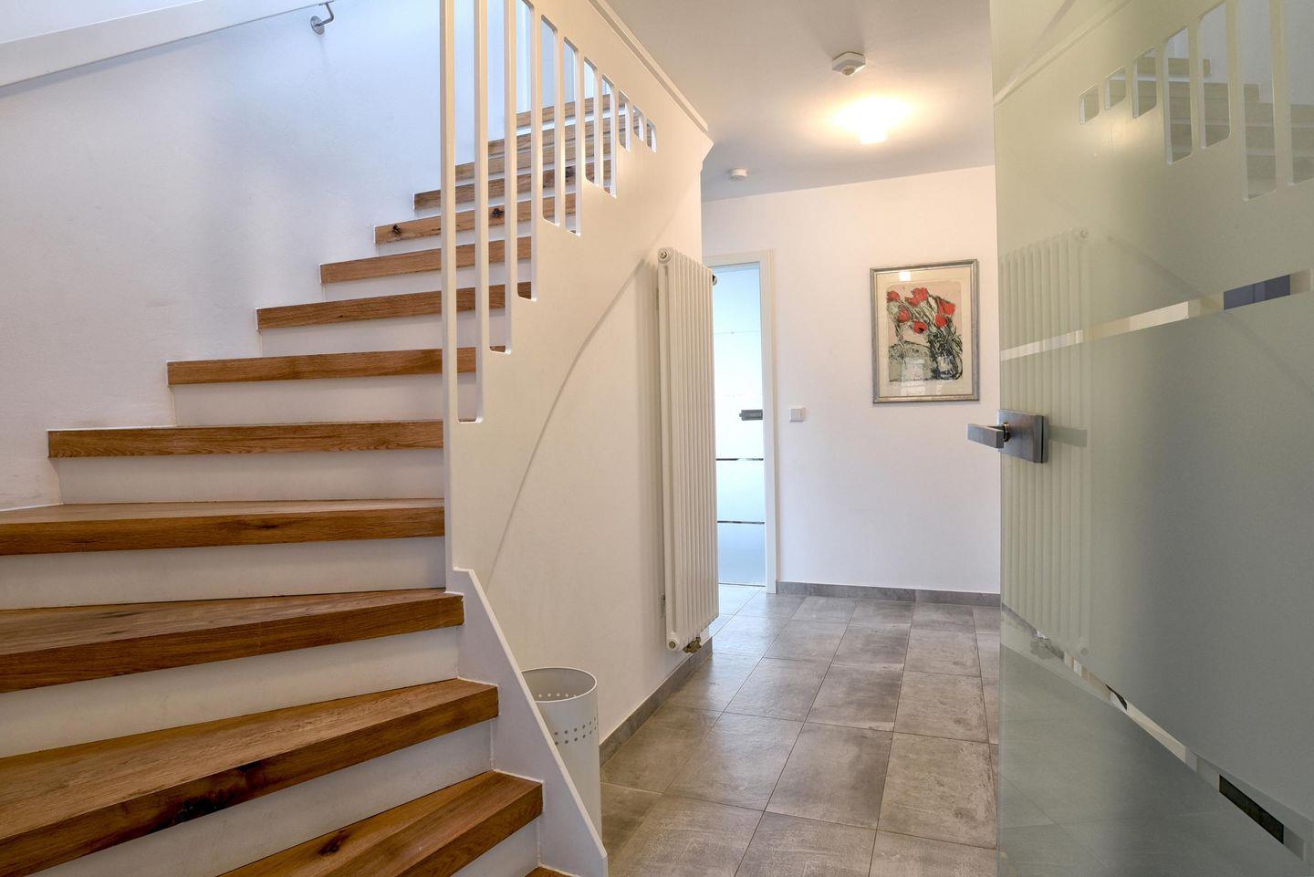 Im Erdgeschoss befindet sich ein offener Wohn- und Essbereich mit einer Küche, ein Gäste-WC und ein Wintergarten. Die moderne Küche ist mit allem was das Herz begehrt ausgestattet, wie zum Beispiel einer Nespresso-Maschine, hochwertigen Markengeräten und einer Echtholz-Arbeitsplatte. Der großzügige Wohn- und Essbereich wird Sie begeistern. Zur Ausstattung des Wohnzimmer wird ein großer Smart-TV mit Soundanlage gezählt. An kalten Tagen kann wunderbar im Wintergarten entspannt werden. Von dort aus gelangen Sie auch direkt auf die Terrasse und in den großen Garten. Im EG befindet sich des Weiteren ein separates Arbeitszimmer sowie ein Gäste-WC.