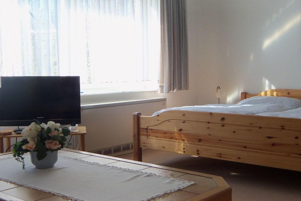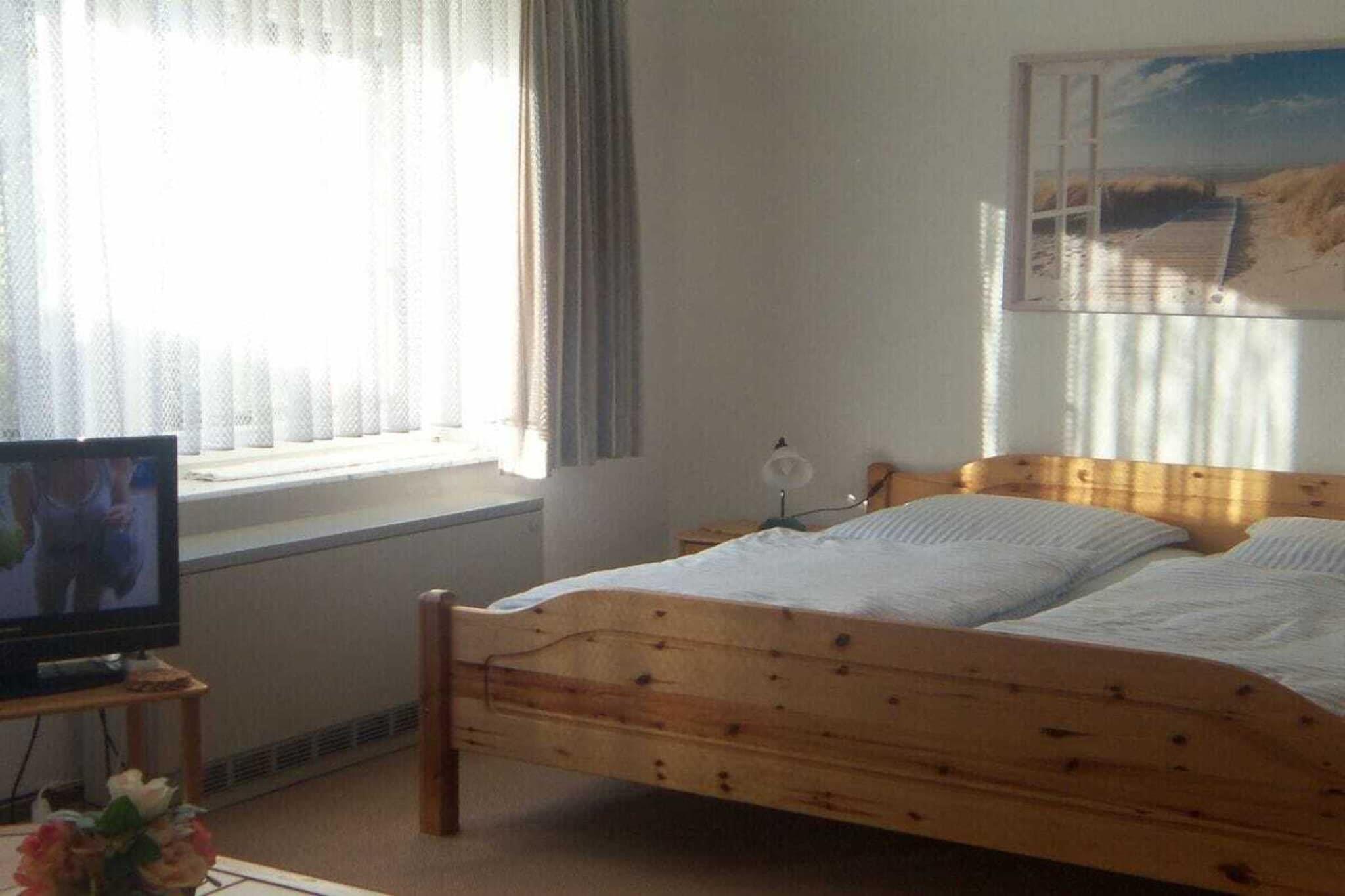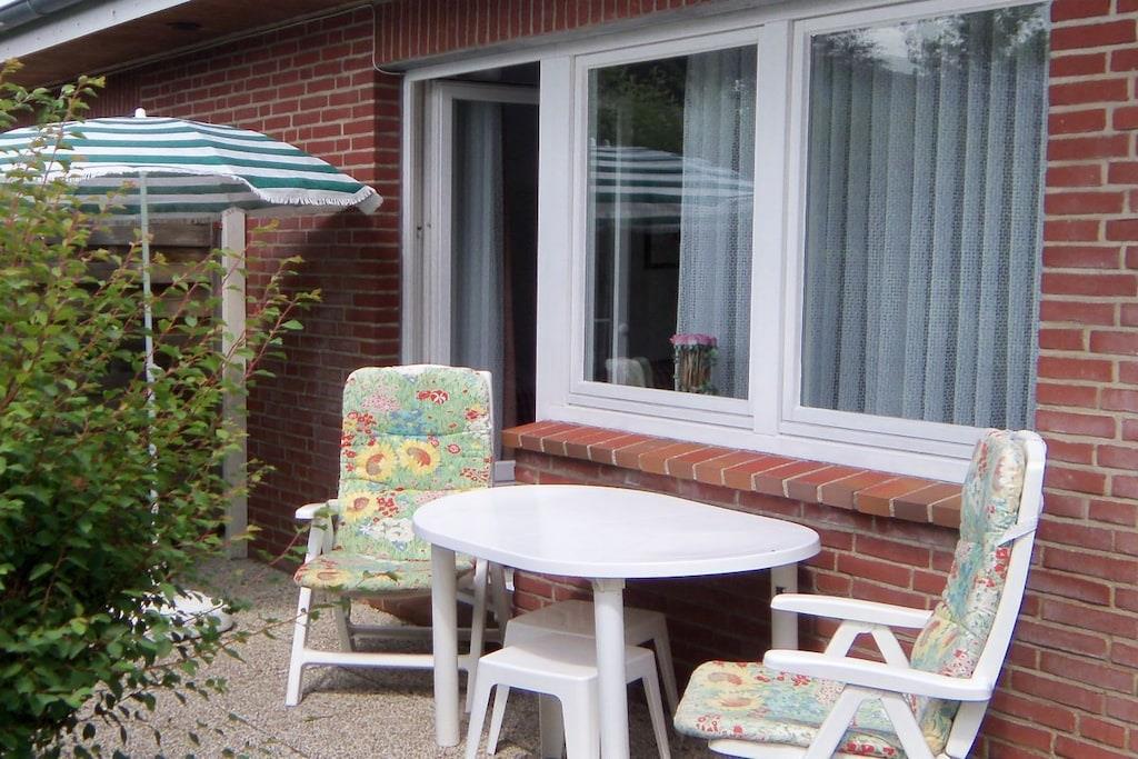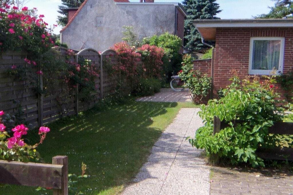 Www.foehrurlaub.info. The bungalow has a combined living and sleeping area with a double bed (1.80 m x 2 m) with orthopedic mattresses, a sofa, a dining table with two chairs, a flat-screen color TV, and a radio. There is a separate kitchen, a shower and toilet, and a bedroom with a single bed (0.90 m x 1.90 m) – not suitable for a third person. Our non-smoking bungalows are located on Knudtsenweg in the center of Wyk, in a green, non-smoking setting. The bungalow is rented for a maximum of two adults (non-smokers) for a minimum of two weeks. The property is fenced and accessible only to us and our guests. Located in the center of Wyk. The Edeka supermarket with bakery is approximately 100 meters away. All shopping facilities, the pedestrian zone, restaurants, cafes, doctors, a bus stop, bicycle rental, the promenade, and the beach are right outside the door. Ferry terminal, wave pool, hospital, approximately 400 m away. The non-smoking bungalows are approximately 45 sq m. They feature a combined living and sleeping area with a double bed (1.80 m x 2.00 m) with orthopedic mattresses, upholstered furniture, a dining table with two chairs, satellite TV (flat screen), and a radio. There is a separate bedroom with a single bed (0.90 m x 1.90 m) – suitable for early risers or snorers – and not intended for a third person. The bungalows also include a kitchenette, shower, and toilet. Bicycle parking and a small car parking space are available. Sunny south-facing terraces with garden furniture and a parasol are provided. Visitors are not permitted.