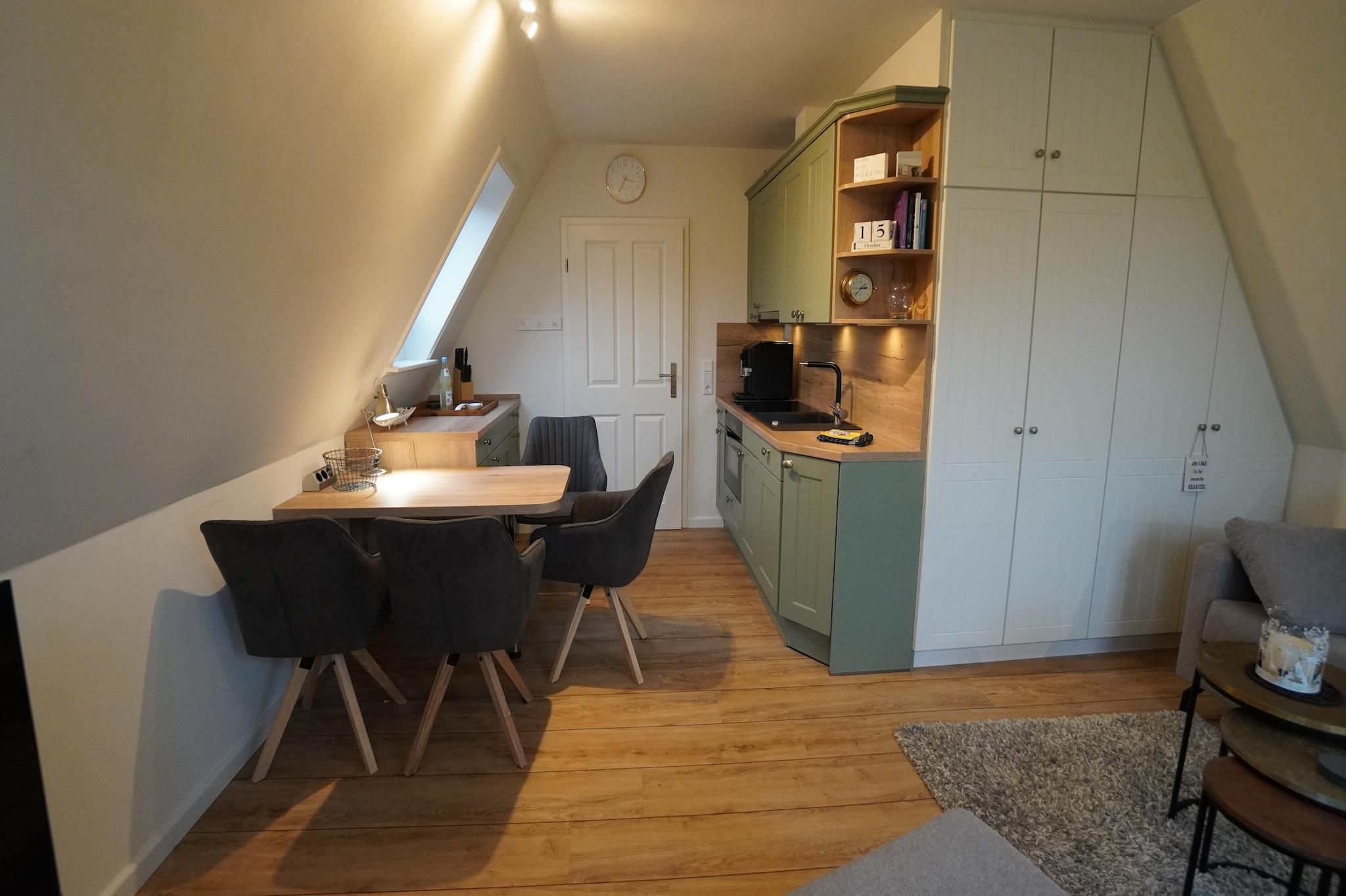 Idyllisk beliggende, komfortabelt indrettet og renoveret lejlighed. Det velholdte, rummelige lejlighedshus ligger mellem landbyerne Boldixum og Wrixum. Centrum af Wyk og stranden er også inden for gåafstand. Bybilledet i Wyk auf Föhr er præget af hyggelige frisiske huse og snoede gader. Utallige restauranter og caféer med havudsigt giver mulighed for at nyde den vidunderlige ro på en ø. Den lille havneby med sin kilometerlange sandstrand og parker med til tider eksotiske planter er et perfekt sted at flygte fra hverdagen og lade op. Aktiviteter i nærheden: Den frisiske nordsøluft på Föhr vækker indre styrke og får dig til at længes efter virkelig at træne. Tendensen her går mod aktiv ferieplanlægning: På Föhr kan sportsentusiaster vælge mellem mange forskellige sports- og aktivitetsprogrammer. Ikke egnet til personer med nedsat mobilitet