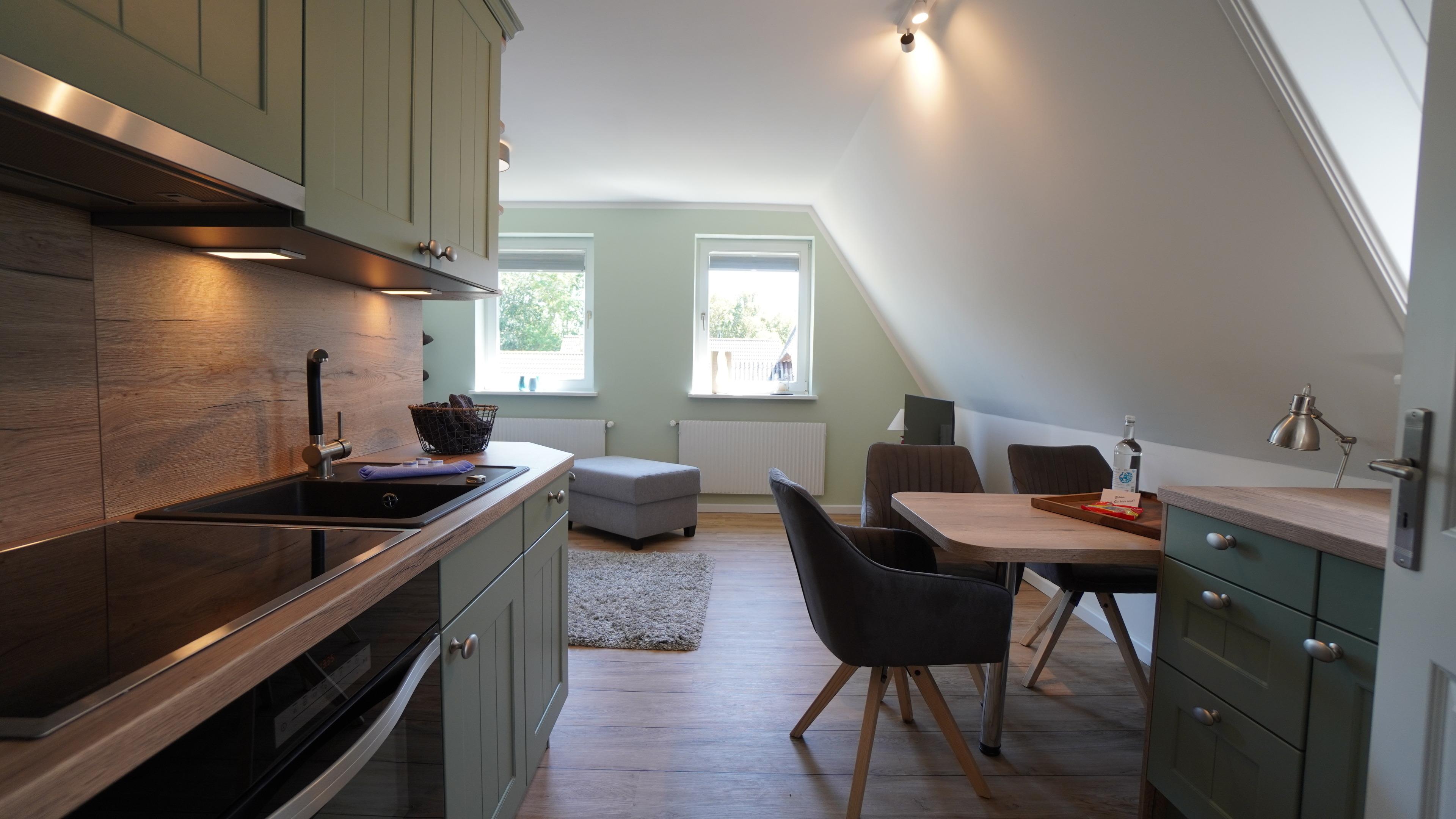 Die offene, voll ausgestattete Küche fügt sich harmonisch in den Wohnbereich und lädt zum Kochen ein.