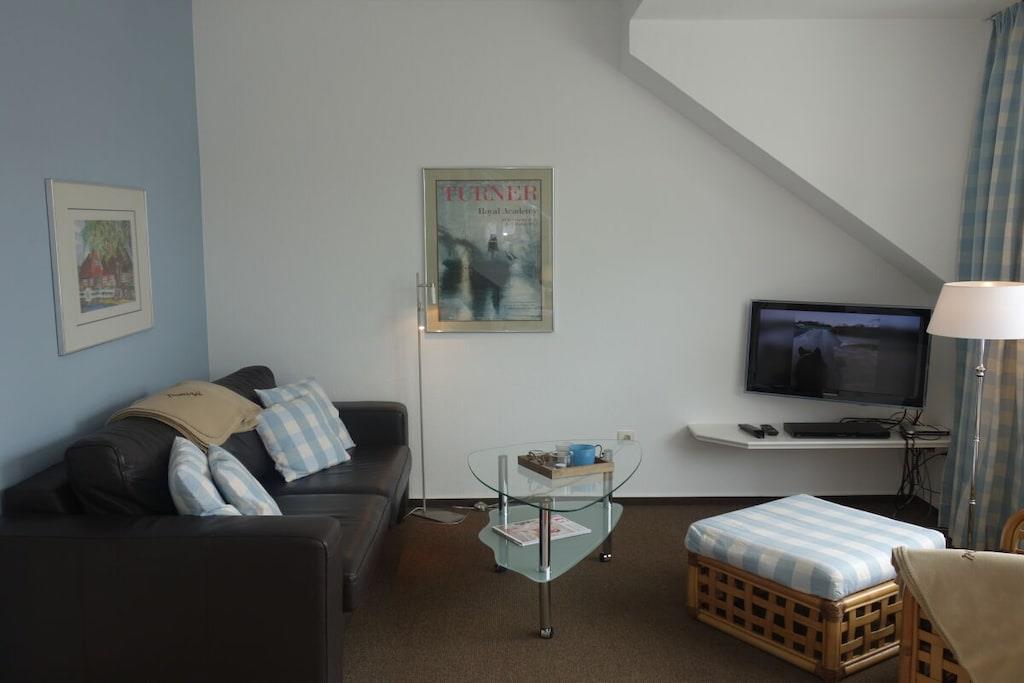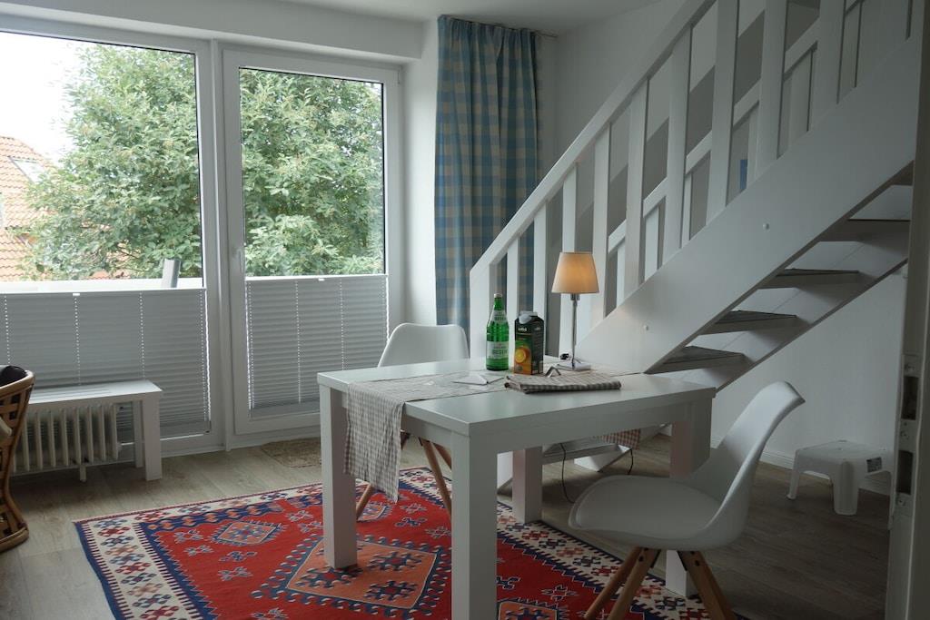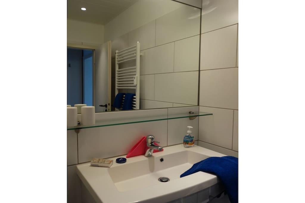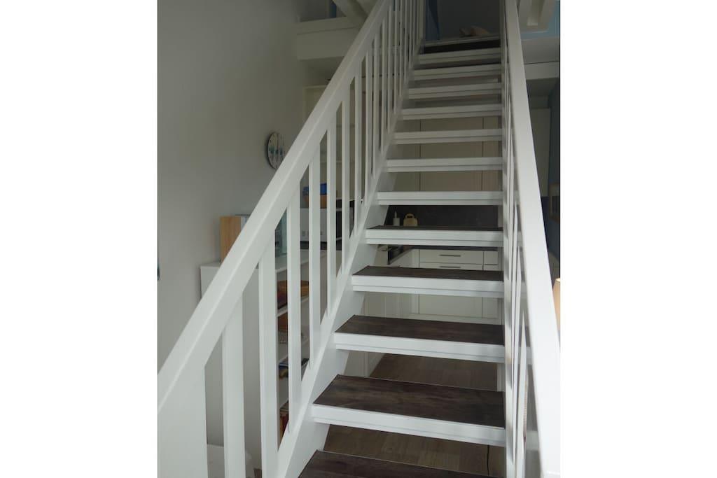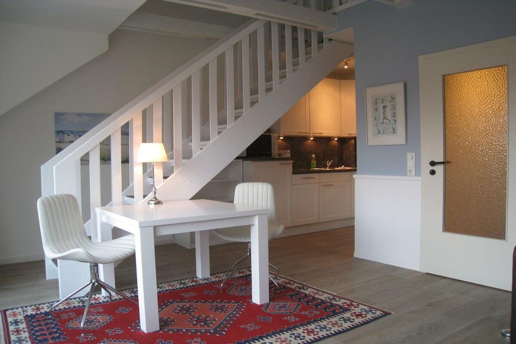 På 1. etage: (entre(, ), Stue(, , Fjernsyn), Køkken(, spisebord, kogeplade, elkedel, brødrister, kaffemaskine, ovn, mikrobølgeovn, opvaskemaskine , køleskab, fryser), badeværelse(, toilet, bruser, håndvask, varme)) På 2. etage: (soveværelse(, , dobbeltseng)) , , Internetadgang, Internetadgang, tørretumbler, vaskemaskine, balkon(, balkon), varme, parkering, strygebræt, strygejern, tørreskab, Vaskeripakke mod et gebyr