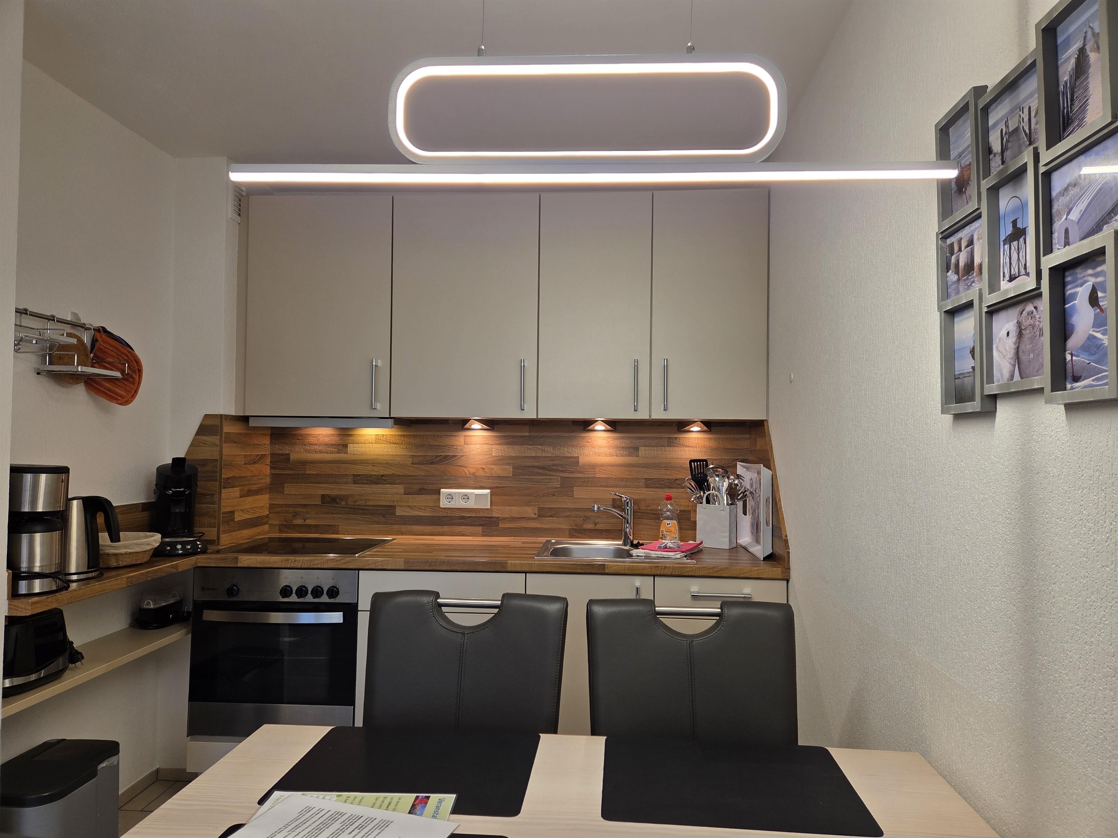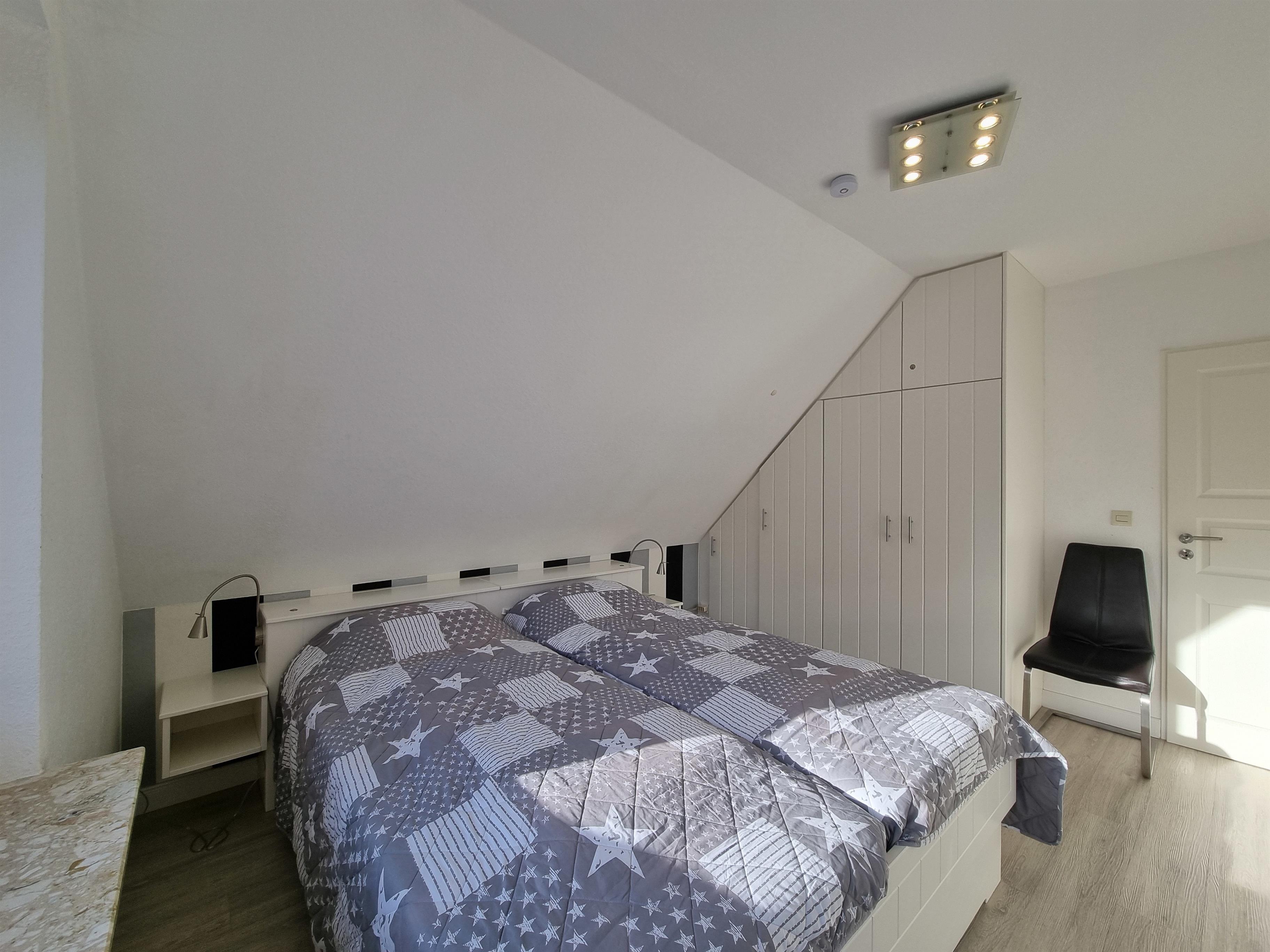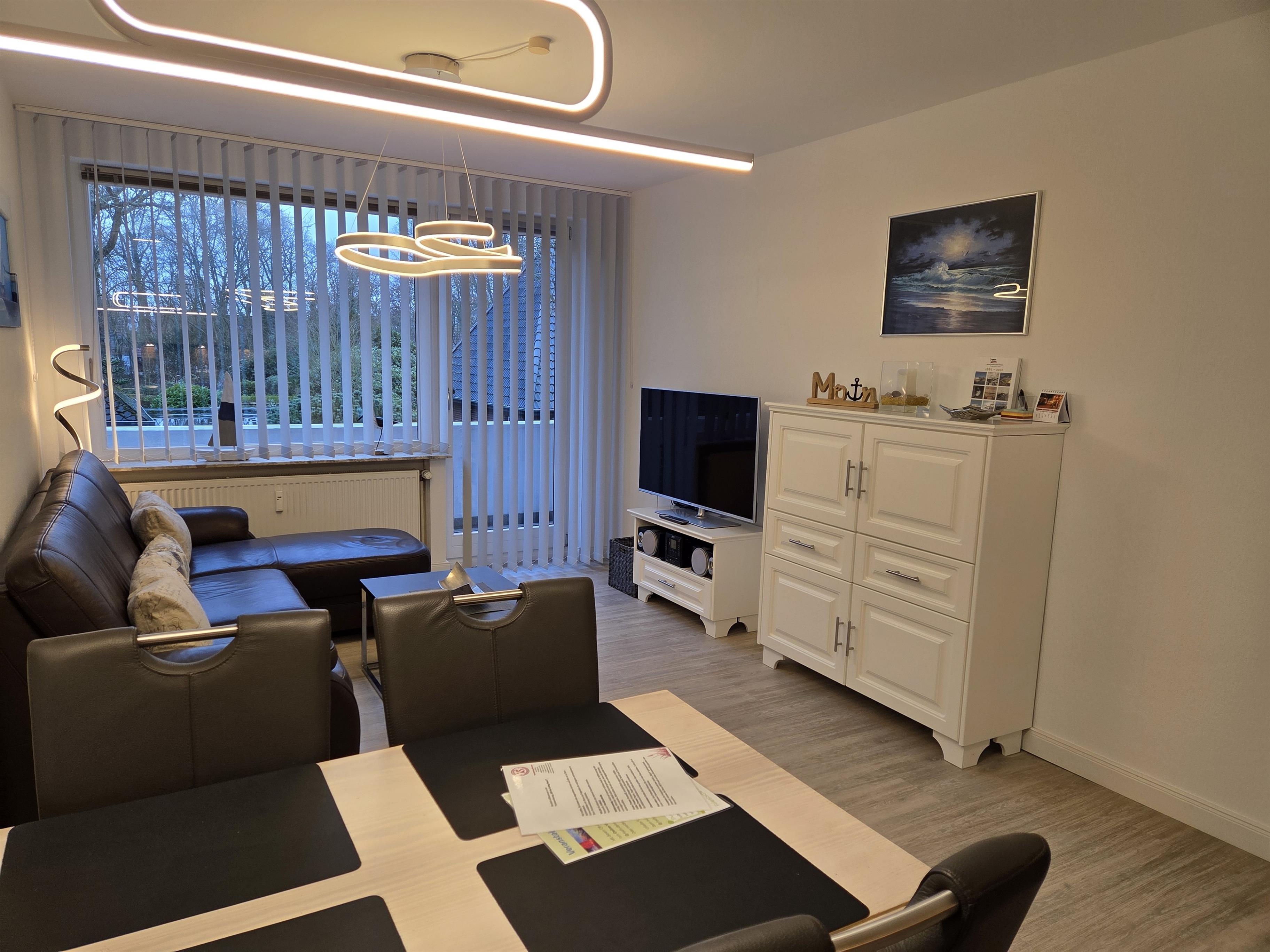 Die moderne Drei-Zimmer-Ferienwohnung in Wyk auf Föhr befindet sich im ersten Obergeschoss und bietet mit zwei Balkonen viel Raum zum Entspannen. Vom großzügigen Wohn- und Essbereich mit gut ausgestatteter Einbauküche gelangen Sie direkt auf den sonnigen Südbalkon, ideal für gemütliche Stunden nach einem Tag am Strand. Das Schlafzimmer, ausgestattet mit einem komfortablen Einbaubett (1,80 x 2,00 m) und offenem Fußende, bietet Zugang zum Ostbalkon, wo Sie die Morgensonne genießen können. In den Einbauschränken finden Sie reichlich Platz für Ihr Gepäck.