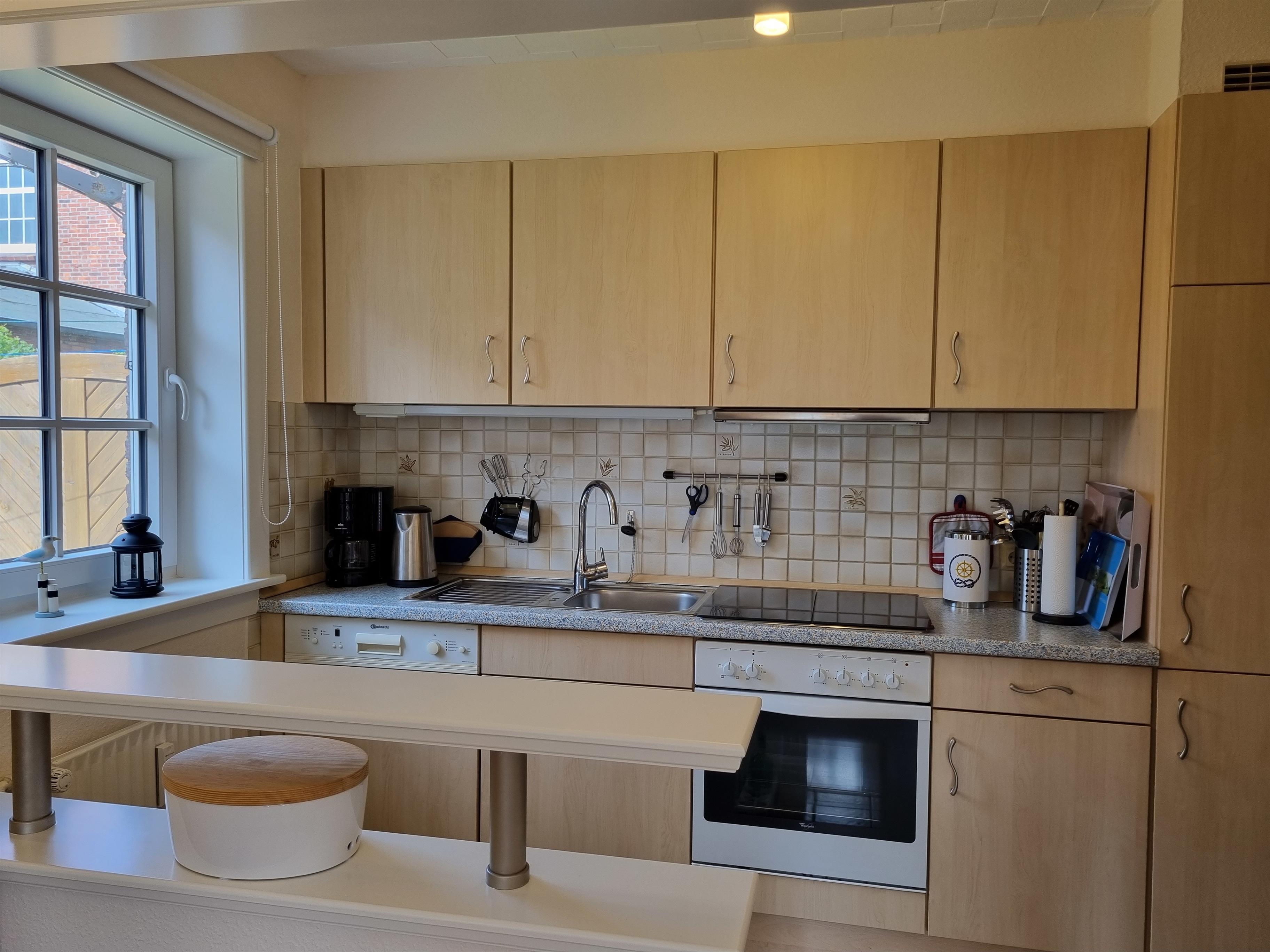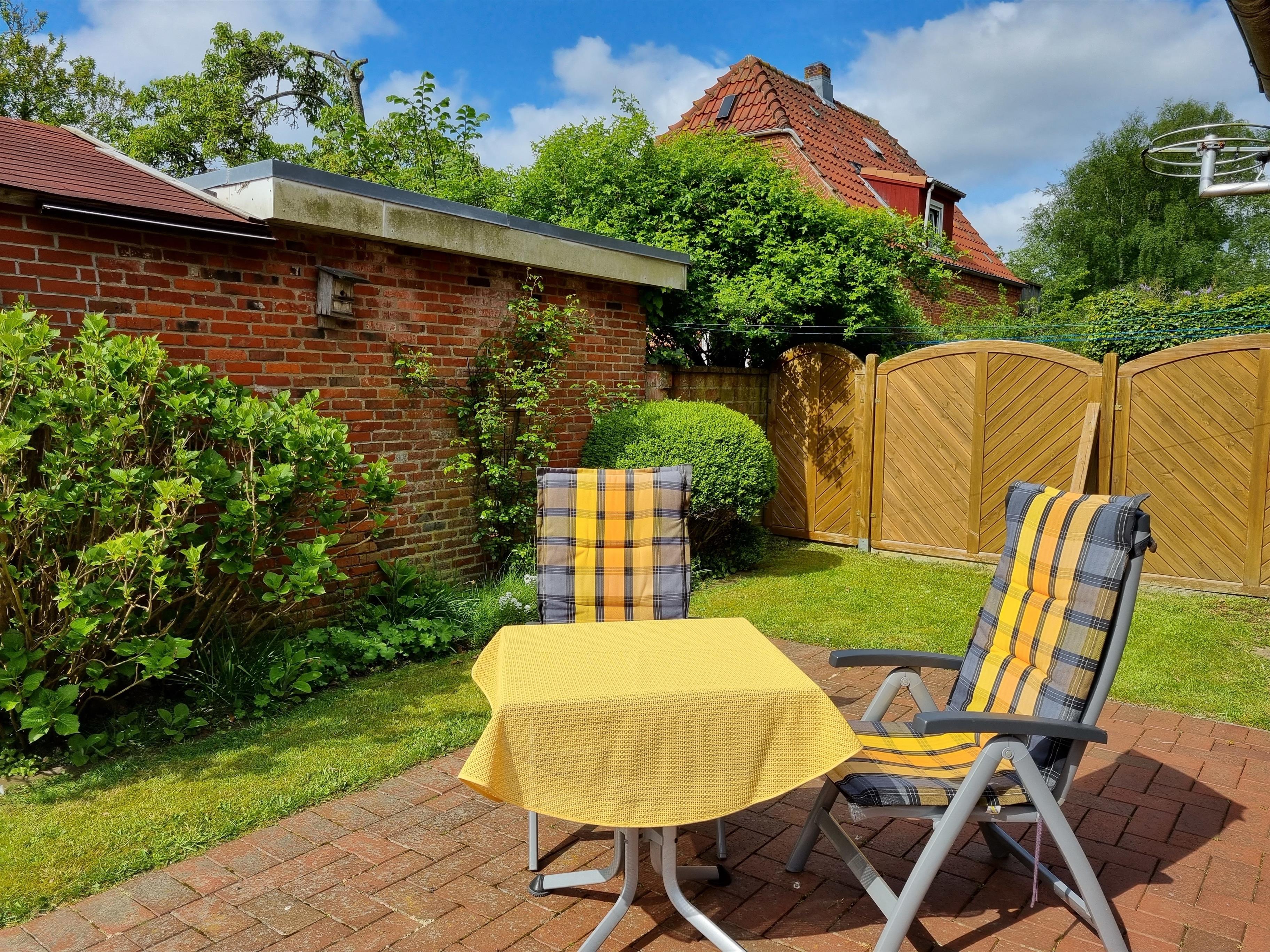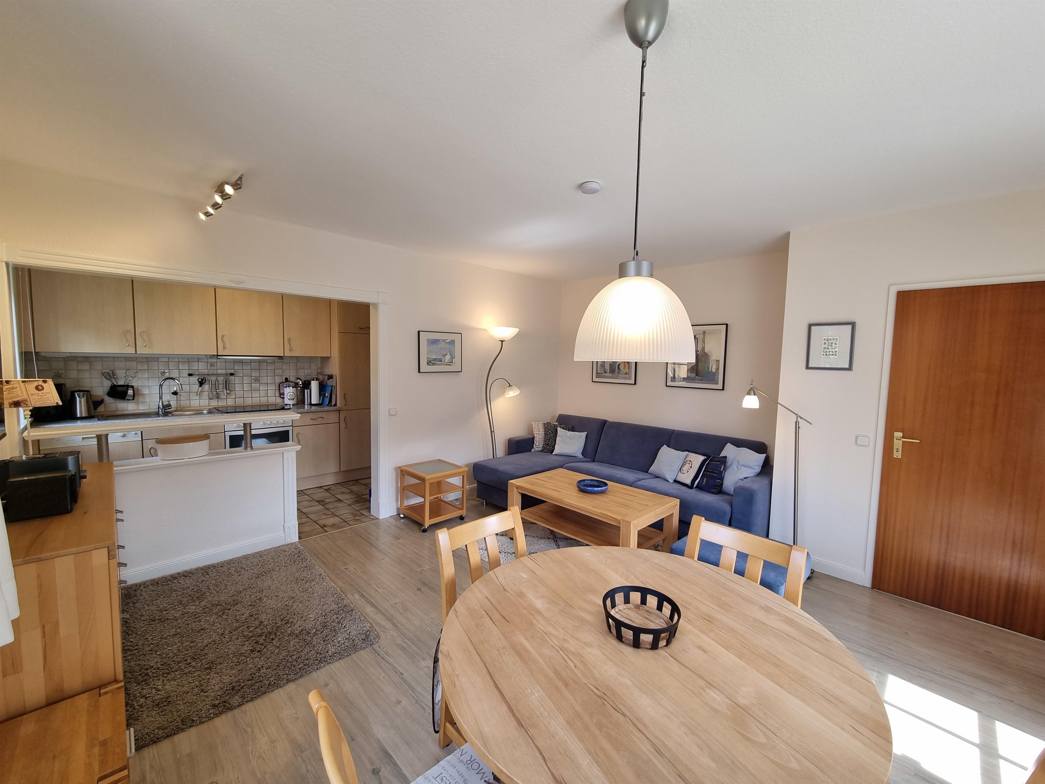 Die ca. 50 m² große und gemütliche Ferienwohnung bietet Platz für 2 Personen. Diese Wohnung ist eine von vier Wohneinheiten im Haus und befindet sich auf der Rückseite des Hauses. Der helle offene Wohnbereich integriert eine moderne Einbauküche mit sämtlichem Komfort für Selbstversorger, gemütlichen Essbereich und eine Kuschel-Sitzecke. Im Badezimmer befindet sich eine Dusche, WC und ein großzügiges Waschbecken mit Ablagefläche, sowie eine Waschmaschine, ein Handtuchhalter und Föhn. Im Schlafzimmer befindet sich ein Doppelbett in der Größe 1,80 × 2,00 m und geschlossenen Fußende und ein großzügiger Kleiderschrank. Auf der eigenen Terrasse können Sie entspannt in den Tag starten und die Sonne genießen. Ihre Fahrräder können Sie unter dem gemeinsamen Fahrradunterstand abstellen.