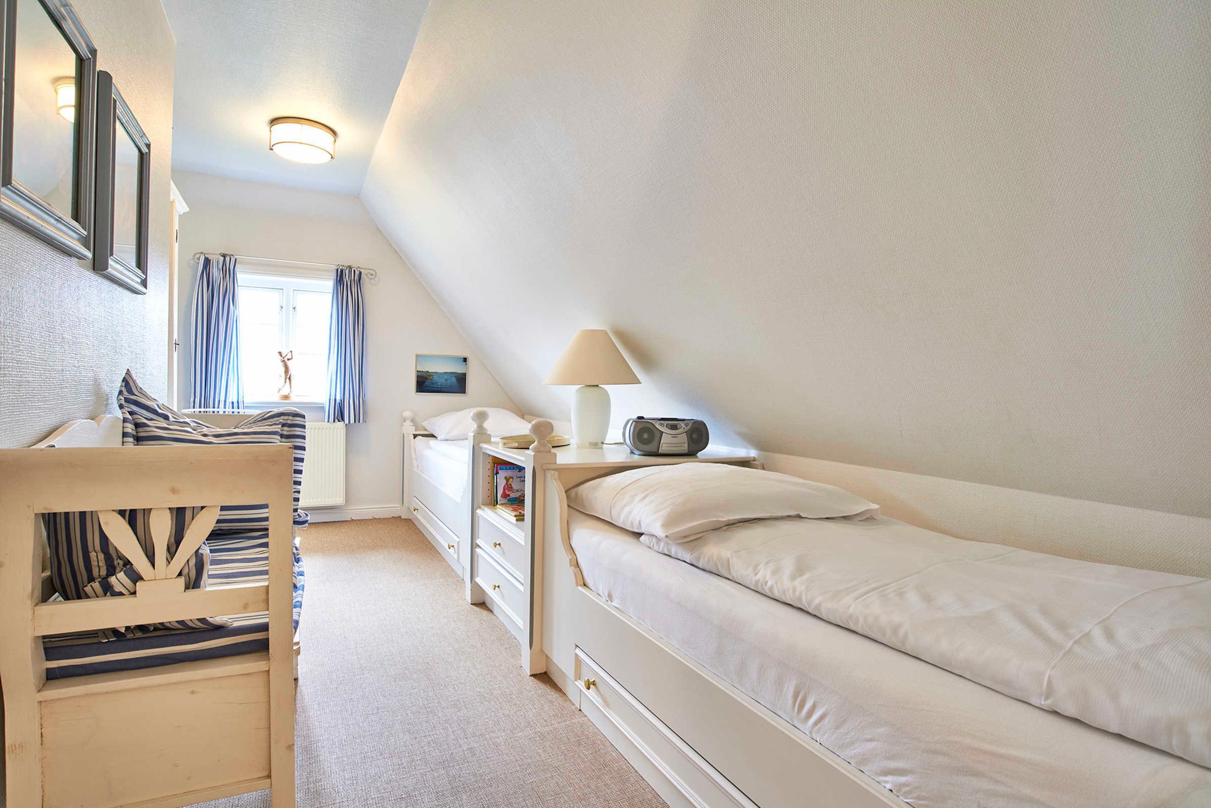 Das Obergeschoss verfügt über zwei Schlafzimmer: 1 Doppelbett im Elternschlafzimmer, 2 Einzelbetten im Stil von Alkoven im Kinderzimmer sowie eine kleine Spielgalerie im Flur laden zum Verweilen ein. Das Duschbad ist mit WC ausgestattet. Das gesamte Mobiliar ist hochwertig und sehr liebevoll zusammengestellt. Auf der Süd-Terrasse, mit bequemen Möbeln und Strandkorb, kann man die Stunden im Freien genießen. Dabei wünschen wir Ihnen bereits jetzt viel Vergnügen und hoffen, dass die Nordseeluft und das Wetter dazu beitragen!