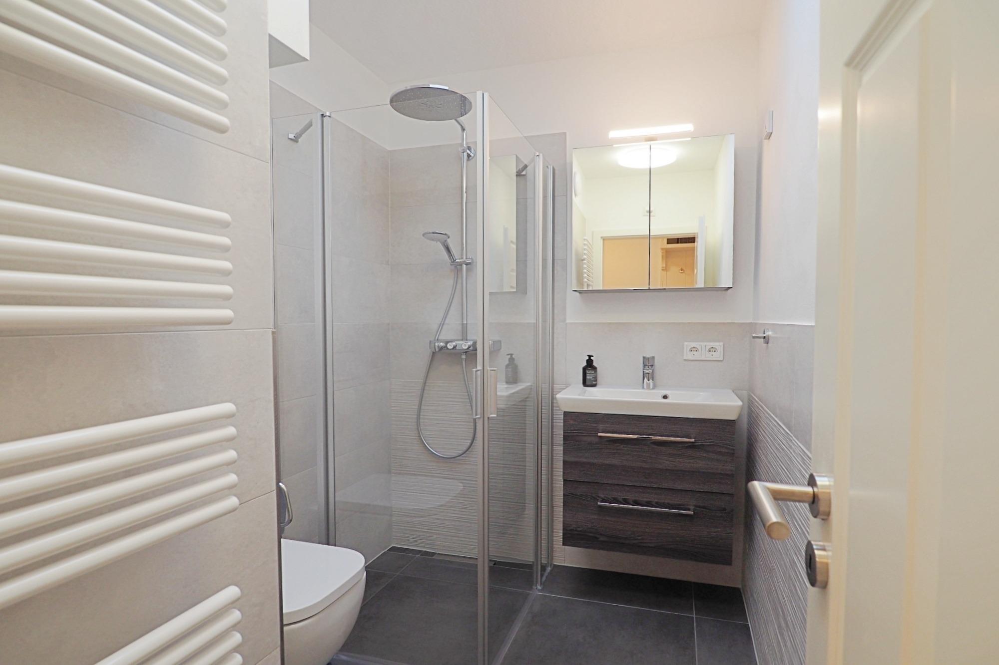 Das helle Badezimmer besticht mit einer Regendusche und elektrischem Kuppelfenster.
