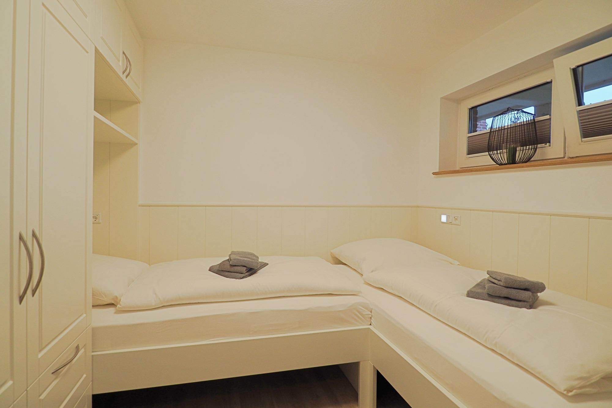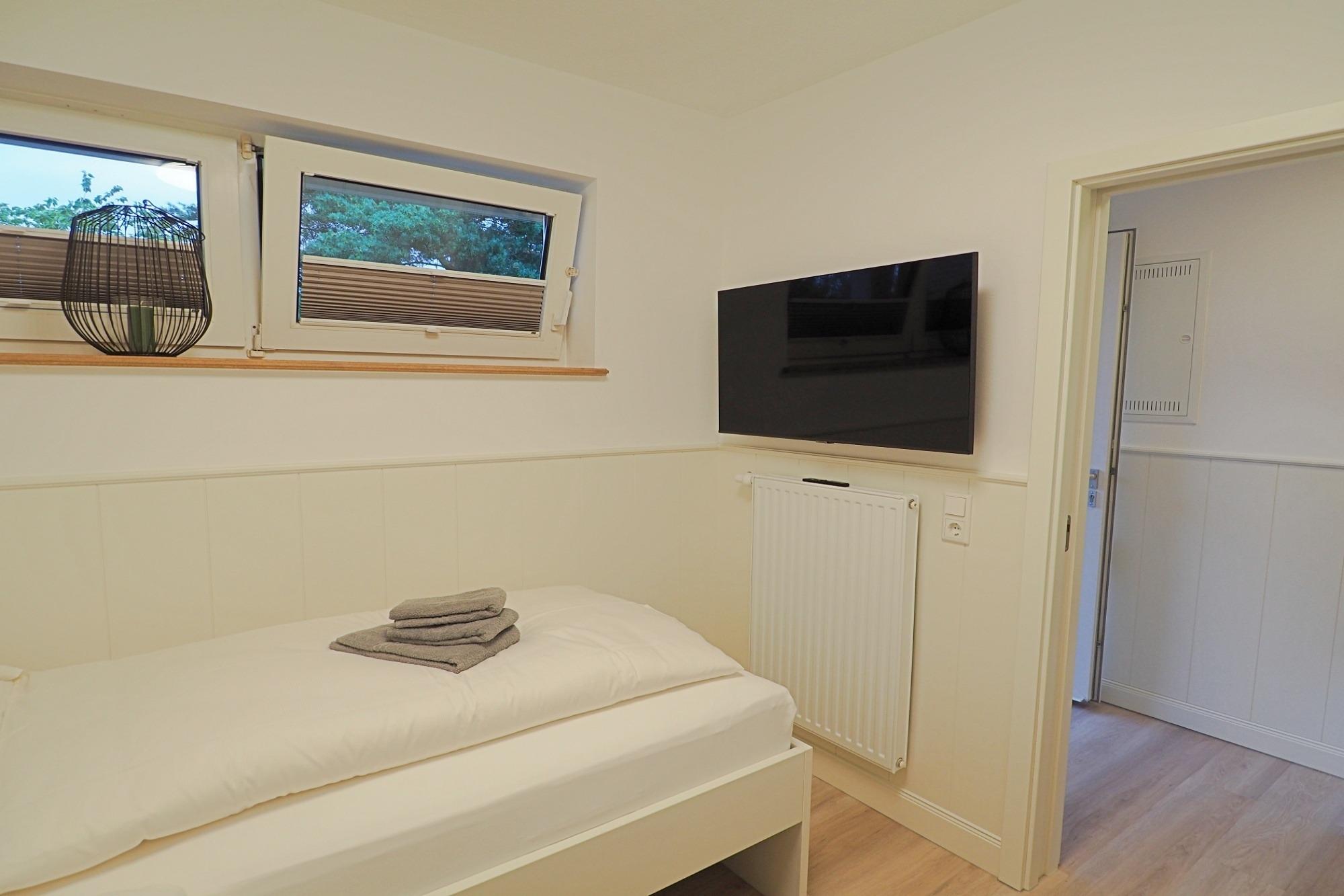 Ihnen steht ein Schlafzimmer mit zwei Einzelbetten (0,90m x 2,00m) über Eck, ein Einbaukleiderschrank mit ausreichend Stauraum und ein 43" Smart-TV zur Verfügung.