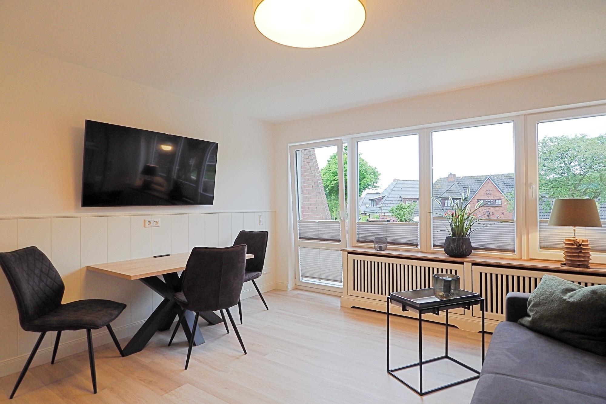 Ein gemütliches 2er-Sofa, ein extra Sessel, der 56" Smart TV im Wohnbereich, der Südbalkon mit Markise und Balkonmöbeln laden zum Verweilen ein.
