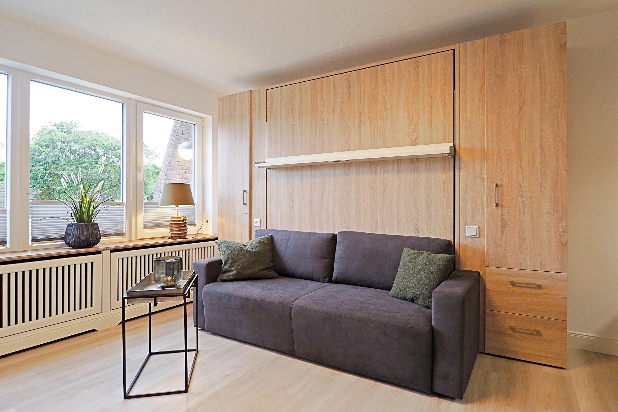 Der "Clou" im Wohnzimmer ist das versteckte Schrankbett (1,60m x 2,00m) hinter dem Sofa für eine eventuell dritte Person.