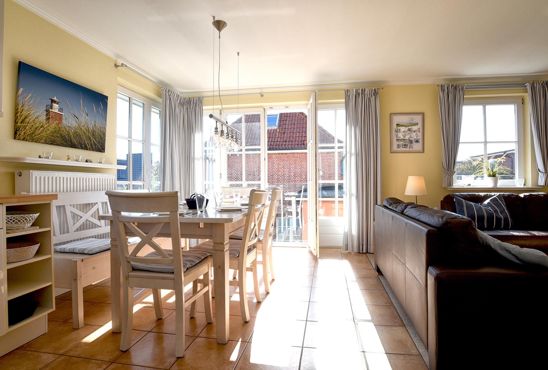 Diese exklusive Unterkunft befindet sich in der Innenstadt von Wyk, wenige Fußminuten vom Sandwall und vom Strand entfernt. Die Wohnung liegt im 1. OG und verteilt sich über 2 Etagen. Im 1. OG befindet sich ein großes Schlafzimmer mit Doppelbett, das Wannenbad und die offene Wohnküche mit großem Esstisch, dem französischen Balkon und der gemütlichen Sitzecke zum verweilen.