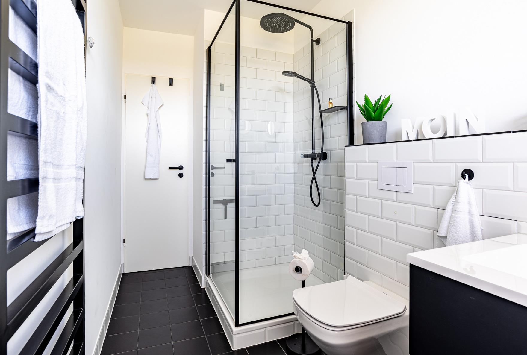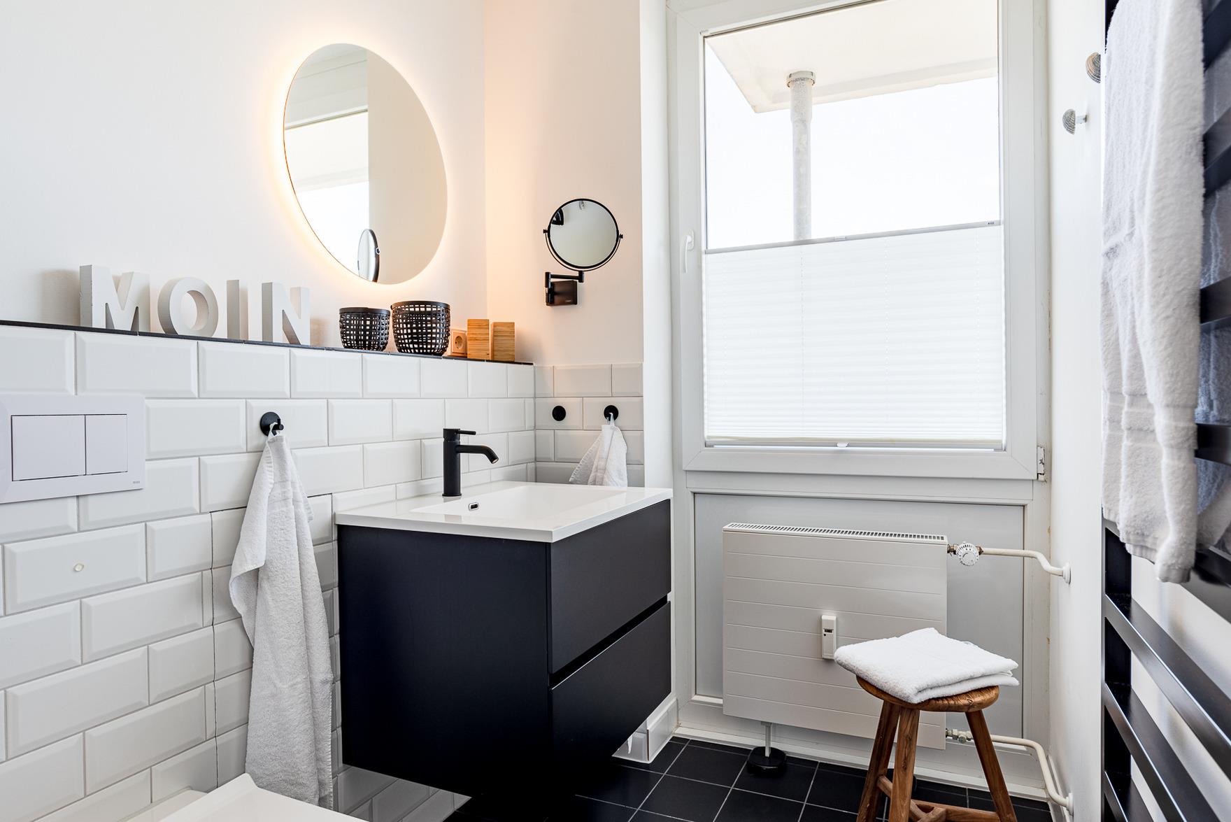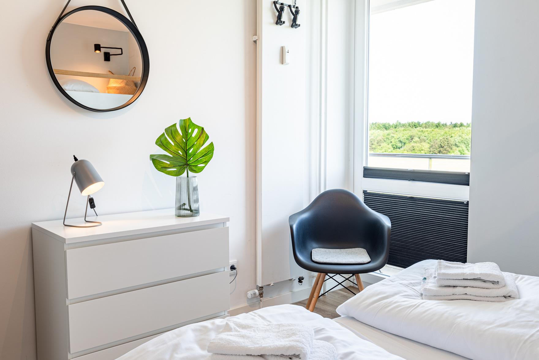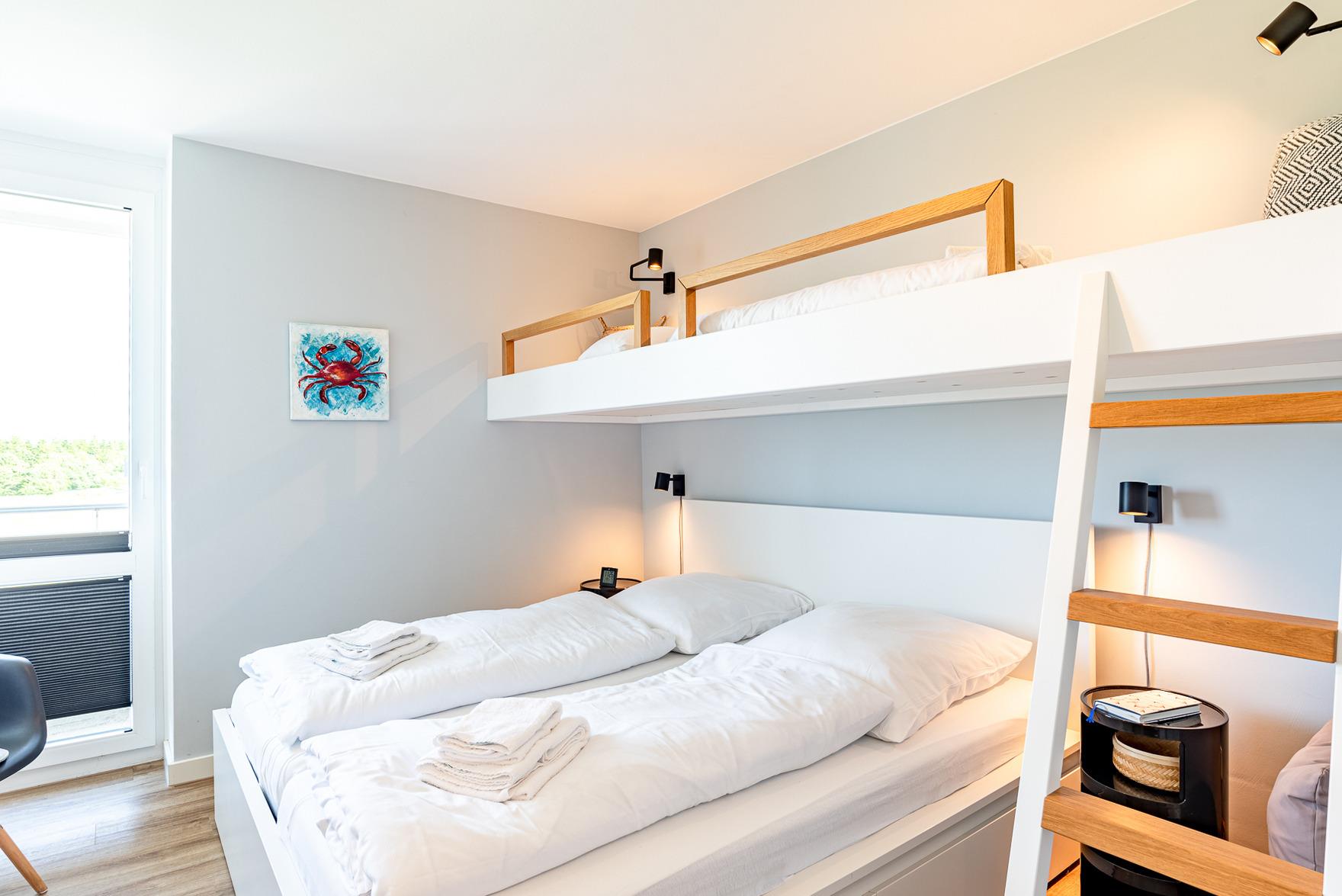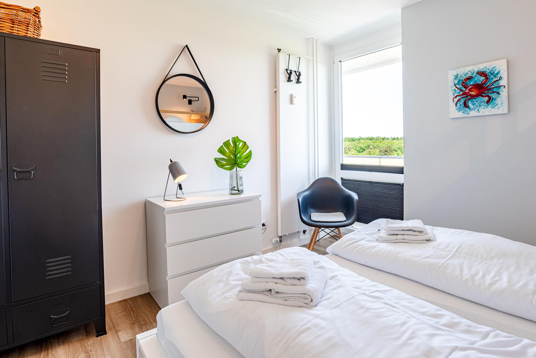 Die Wohnung verfügt über ein separates Schlafzimmer mit einem Doppelbett (1,80m x 2,00m) und einem Einzelbett (0,80m x 2,00m), das als zusätzliche Ebene über dem Doppelbett angebracht ist. Von hier aus haben Sie einen herrlichen Blick auf den Flugplatz von Wyk. Das Badezimmer ist stilvoll in passenden Farben gehalten und bietet eine große Dusche mit Regendusche sowie eine Toilette.