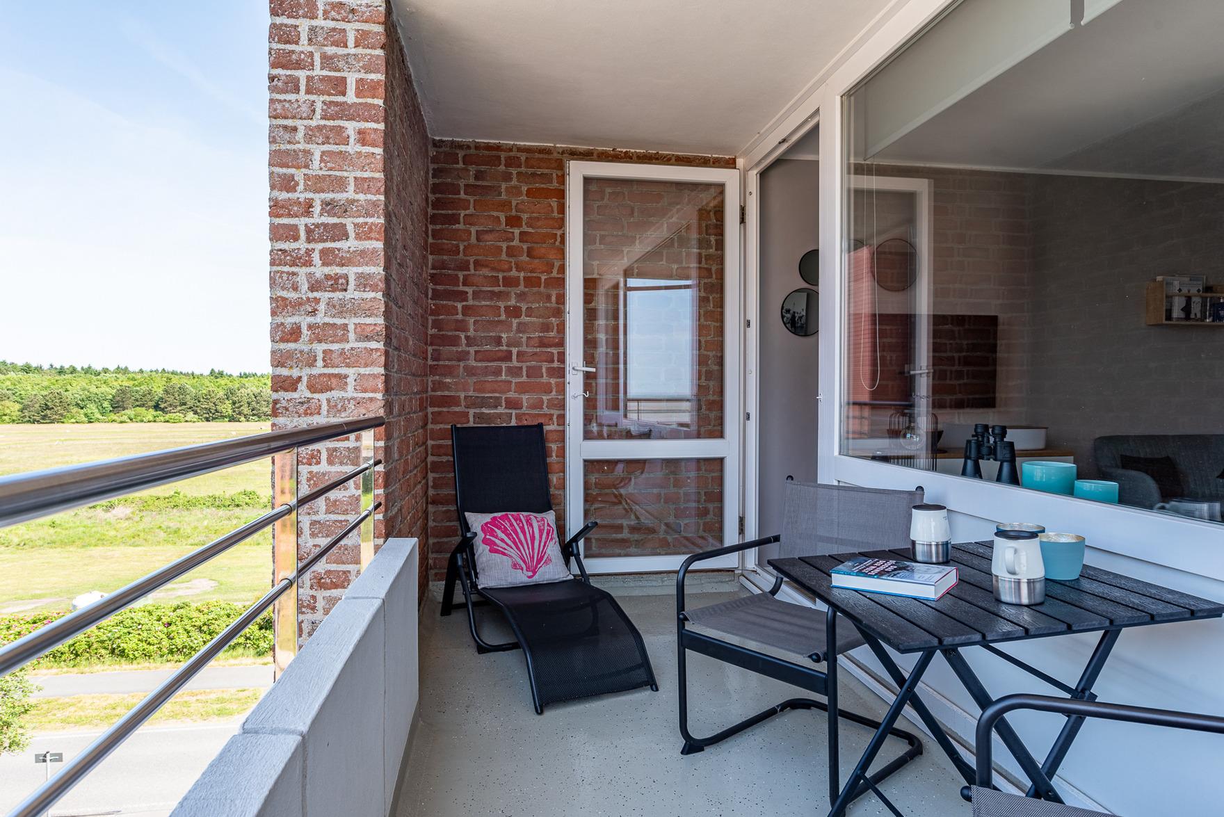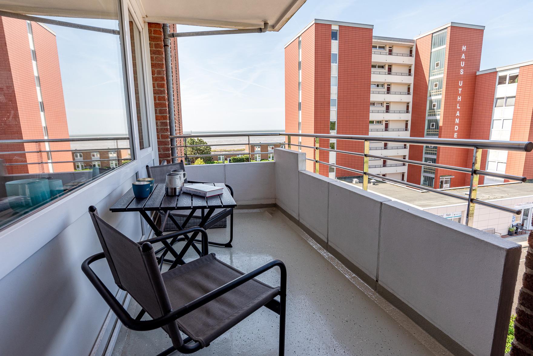 Im großzügigen Wohn- und Essbereich finden Sie eine voll ausgestattete, moderne Küchenzeile mit Induktionskochfeld, Backofen-Mikrowellen-Kombigerät, Nespresso-Kapselmaschine und weiteren technischen Geräten vor. Eine bequeme Sitzgelegenheit, ein 42" Smart-TV und eine Bose-Bluetooth-Box sorgen für Unterhaltung und Entspannung. Der zweite Balkon bietet einen Blick auf die Nordsee und lädt mit einem Lounge-Sessel zum Verweilen ein oder zum gemütlichen Frühstücken.