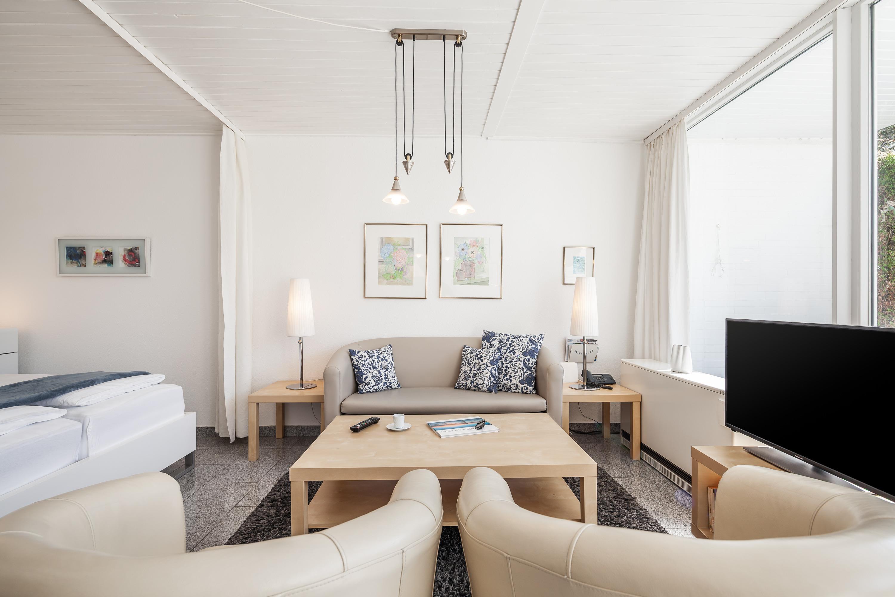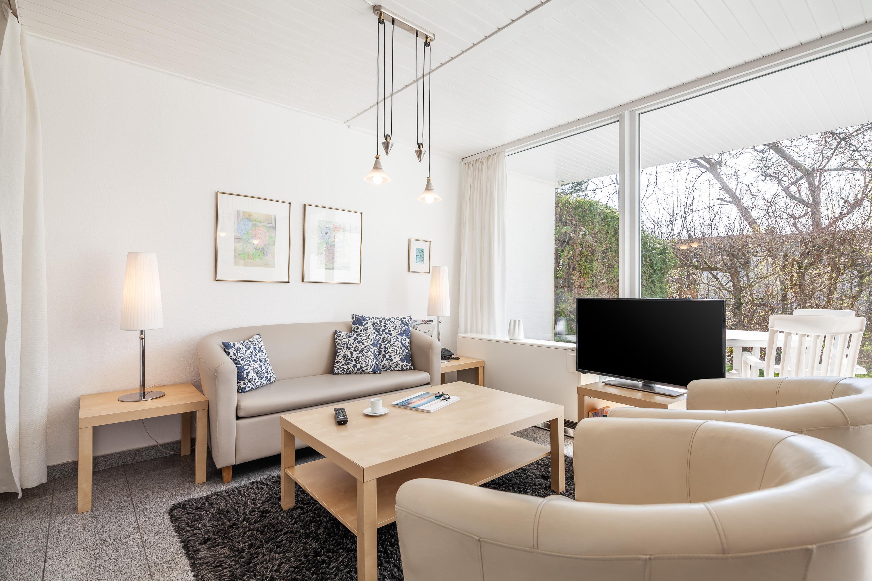 Probiers mal mit Gemütlichkeit: Der gemütliche Wohnbereich bietet neben SAT-TV auch Möglichkeiten z.B. zum Lesen oder Ausruhen. Der Schlafbereich ist vom Wohnbereich durch einen Vorhang getrennt.