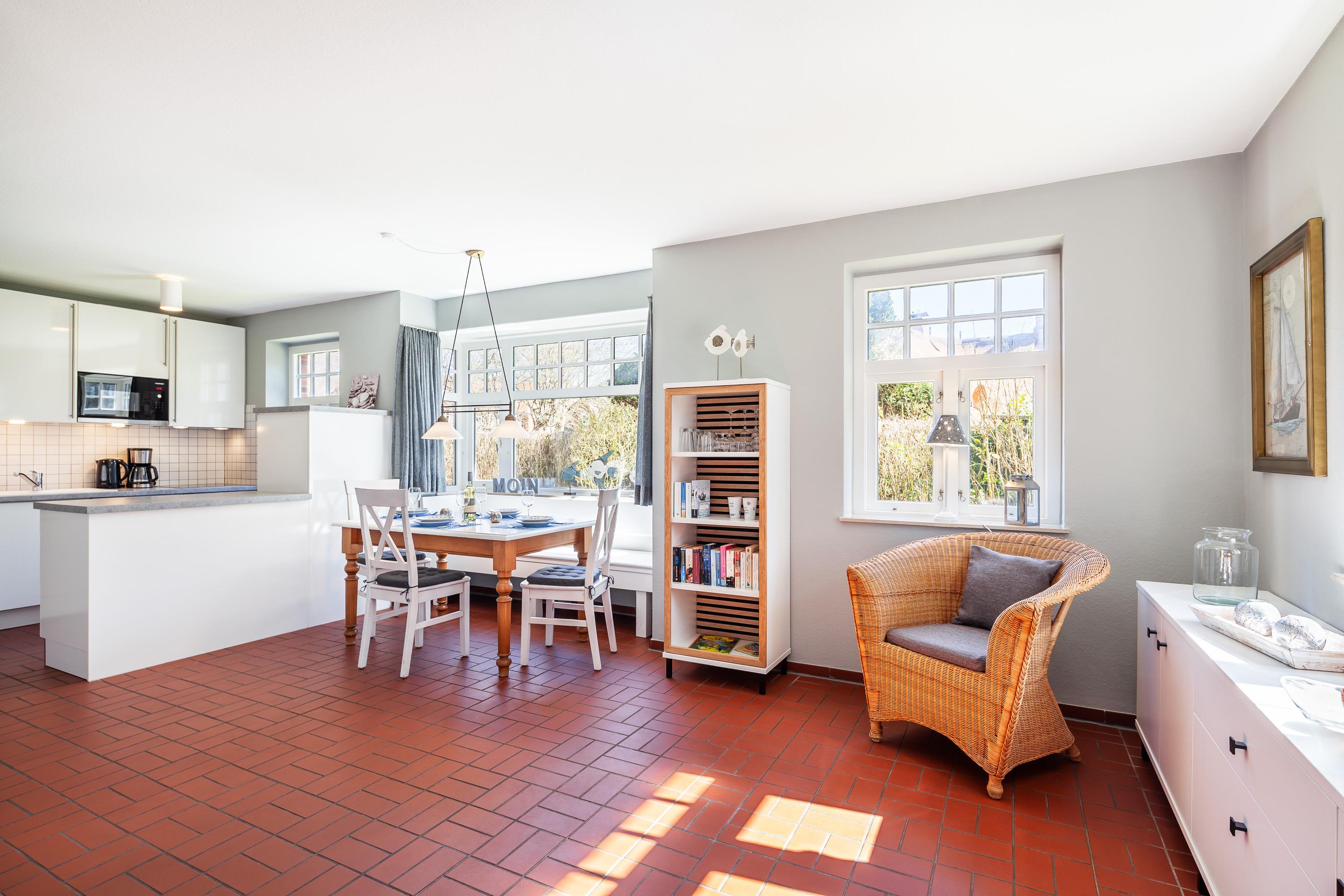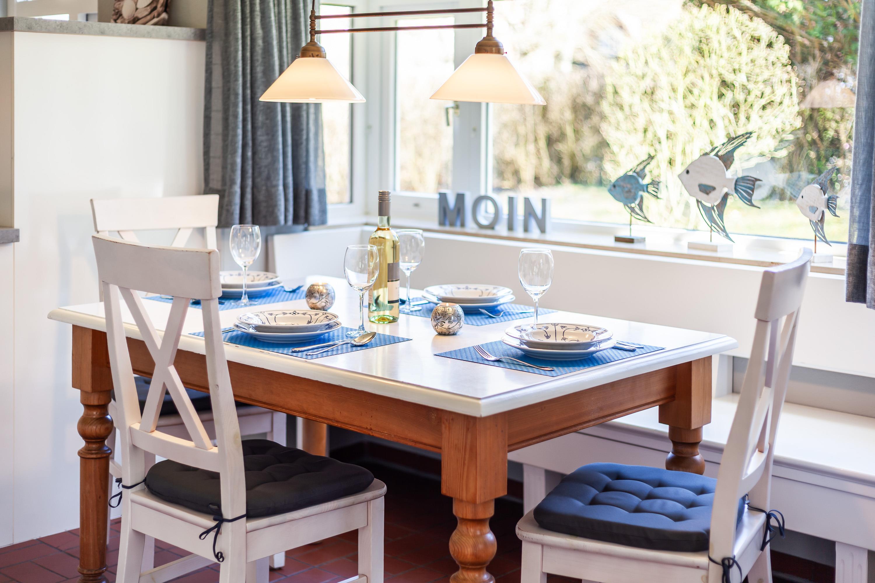 Der lichtdurchflutete Wohnraum mit einer gemütlichen Sitzgruppe und einem Esstisch lädt zum Verweilen ein. Fernseher (Flachbildschirm), Blue Ray-Player, Kaminofen und Internetanschluss sind selbstverständlich vorhanden.
