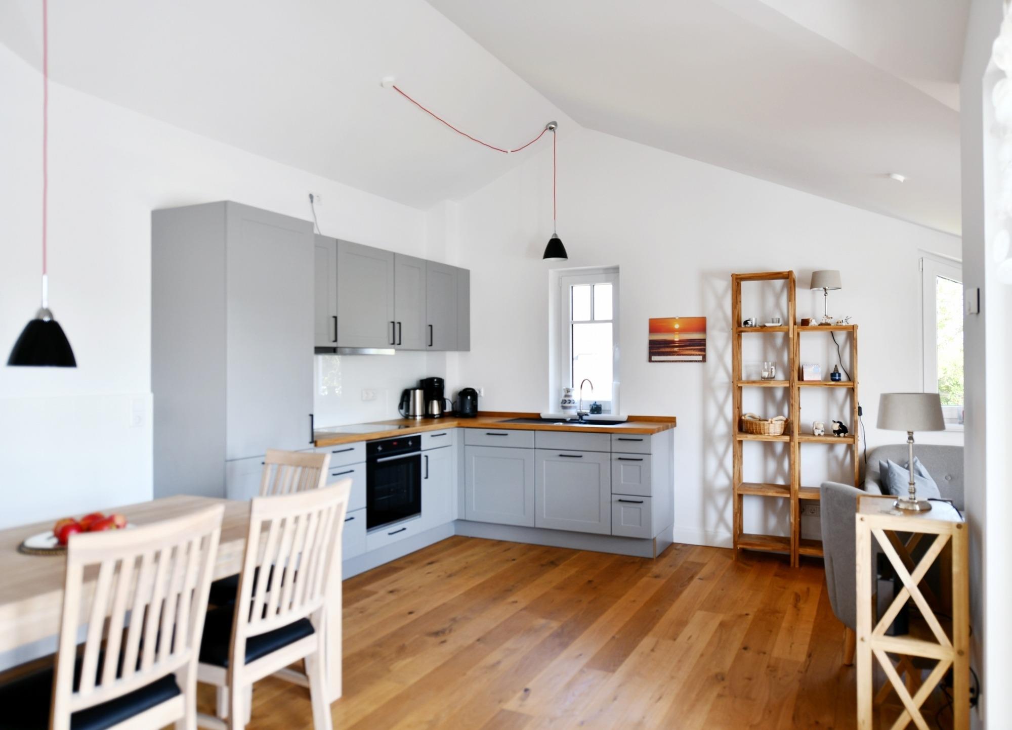 Die hochwertige, moderne Küche mit offenem Ess- und Wohnbereich bilden das Herzstück der Wohnung.