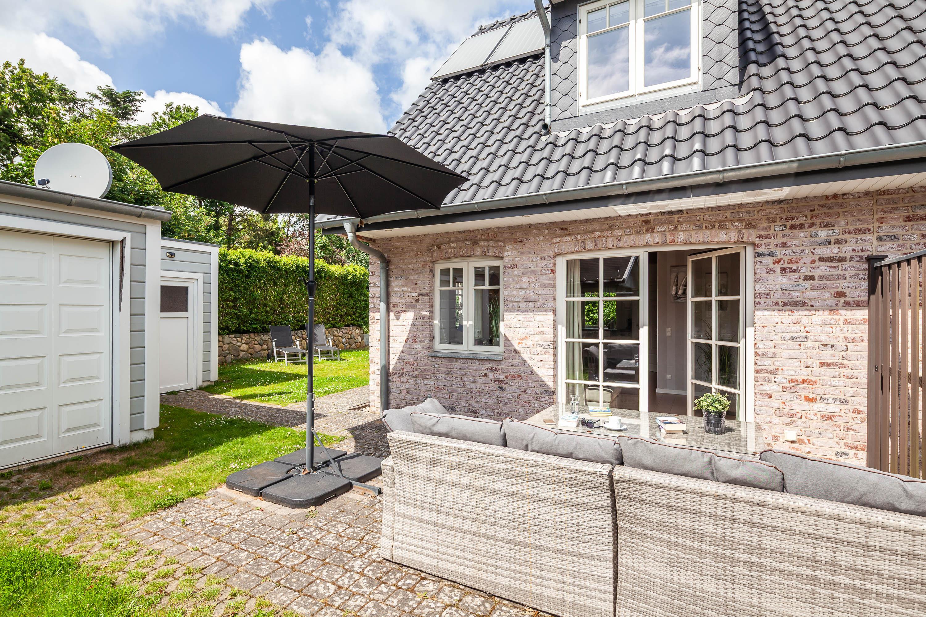 Zu der DHH gehört eine eigene Sonnenterrasse mit Launchmöbeln sowie ein Carport.