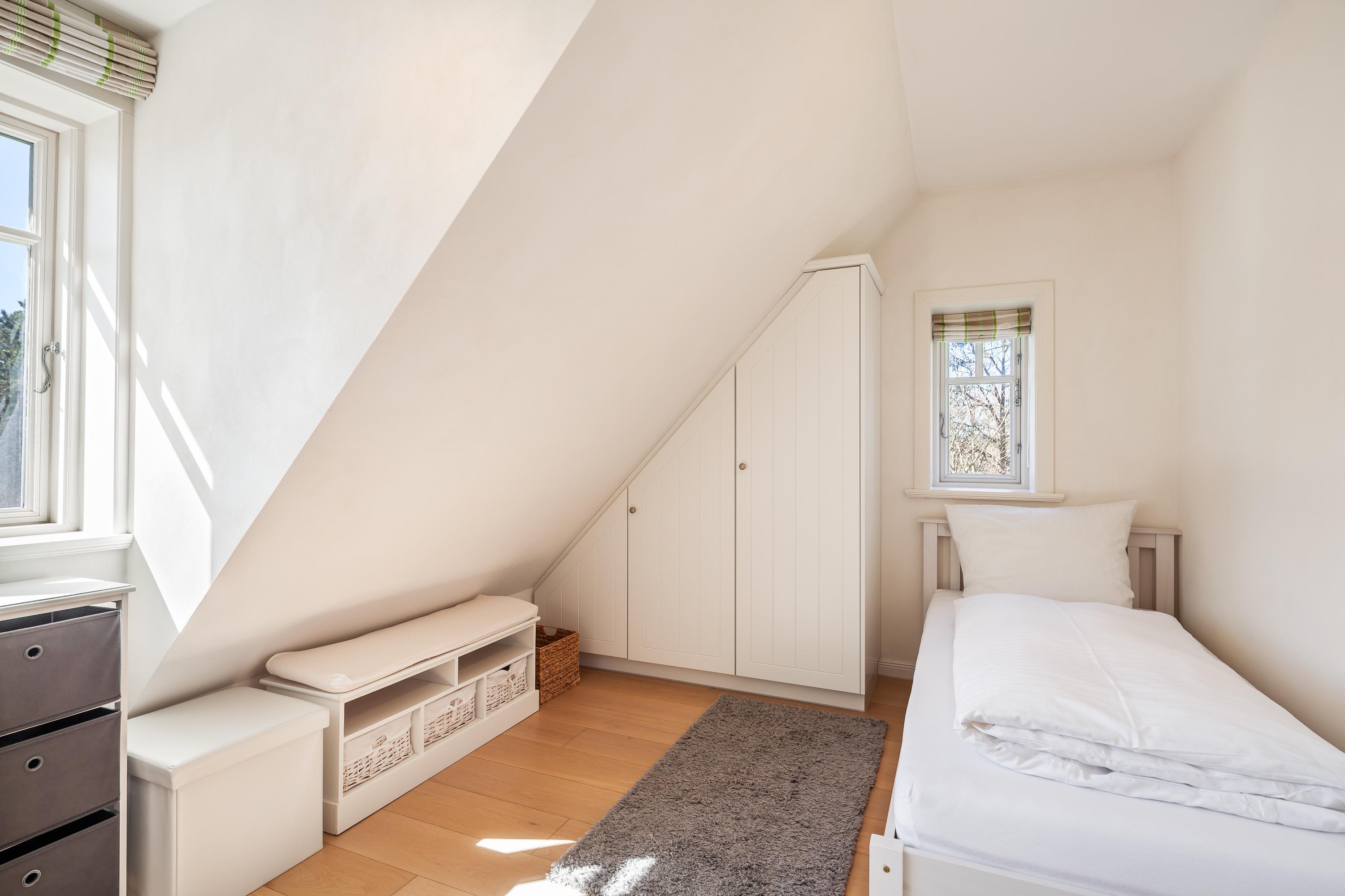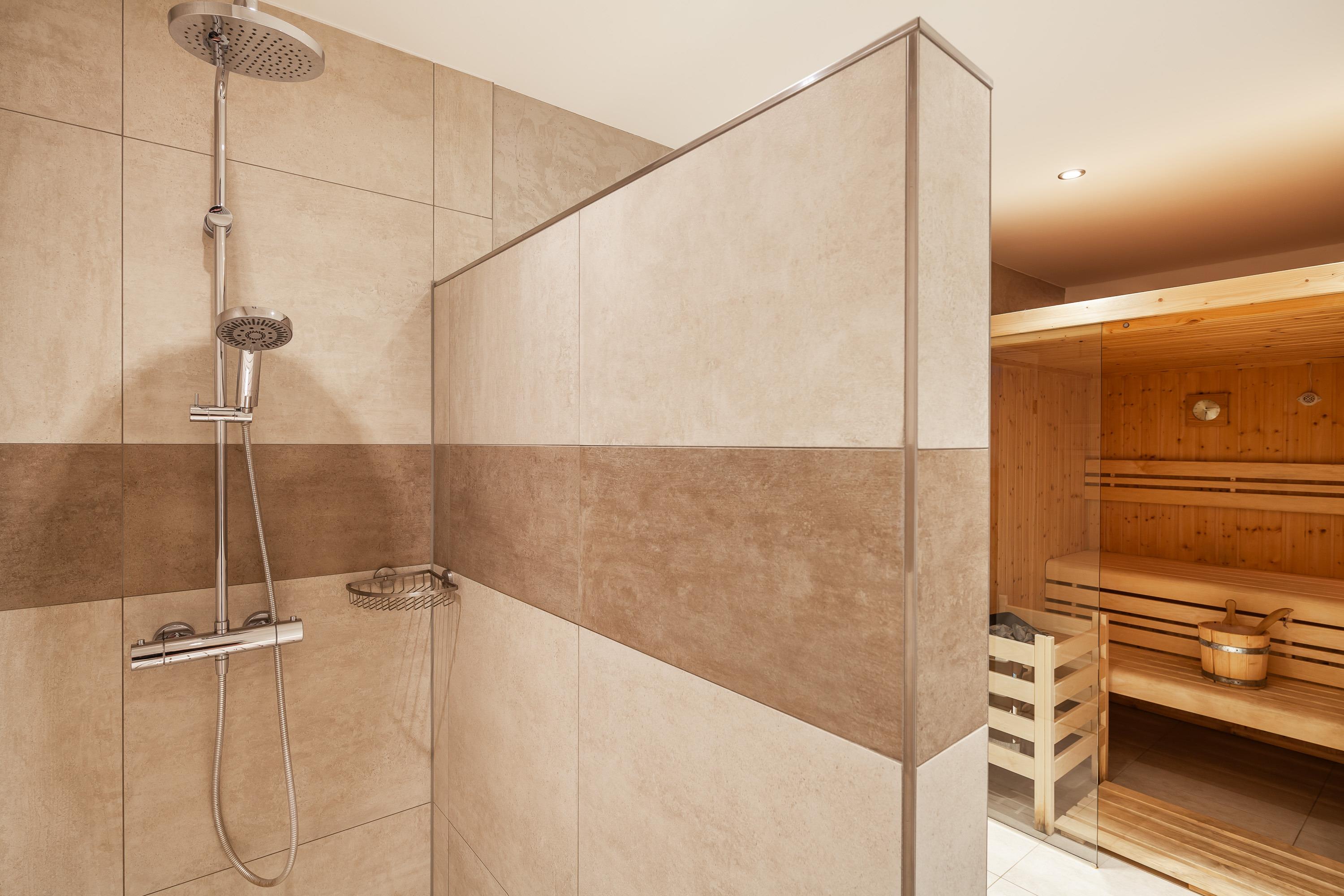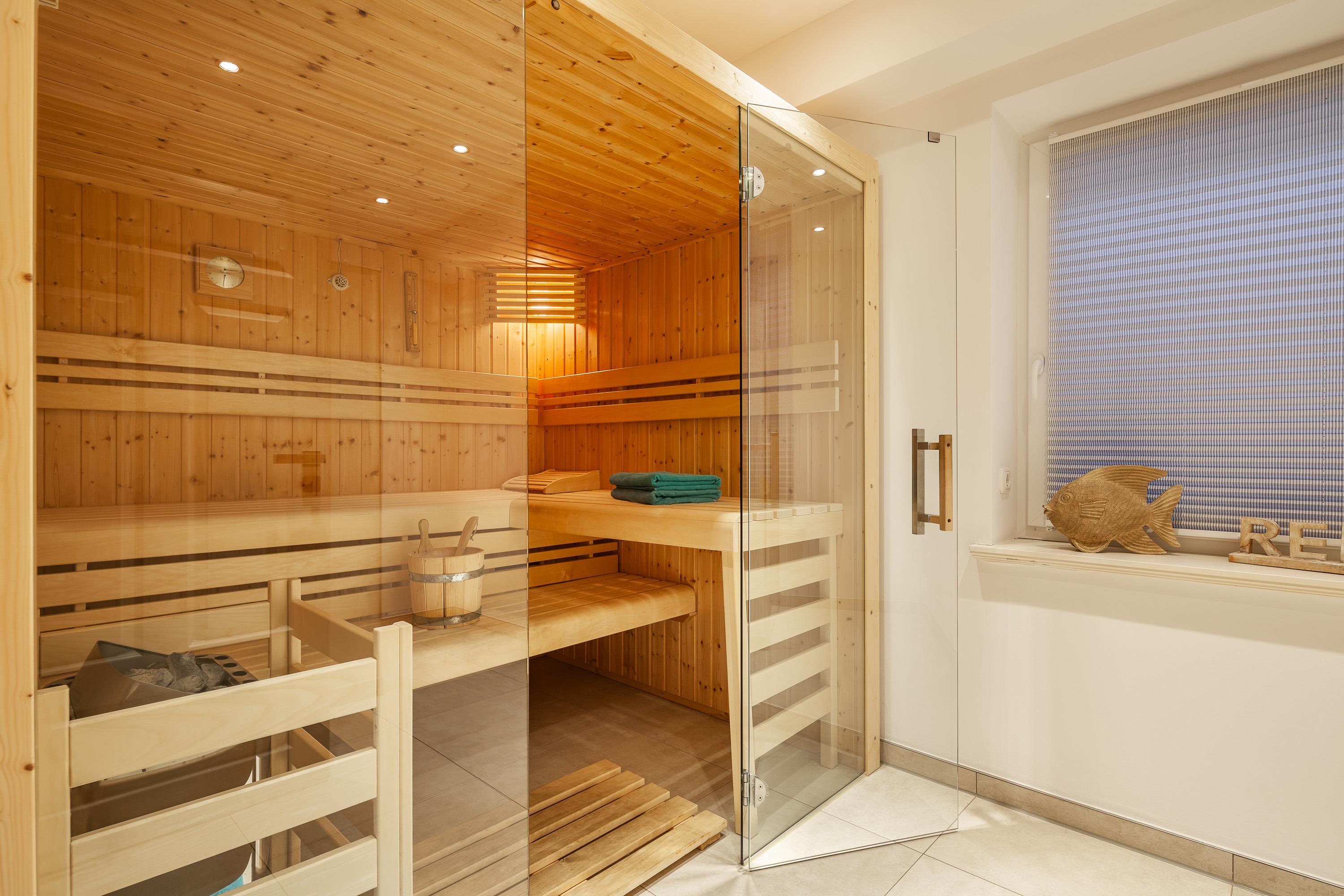 Im Obergeschoss befinden sich zwei Schlafzimmer und ein Duschbad mit Toilette, im Kellergeschoss ist neben der Sauna und dem geräumigen Schlafzimmer mit Doppelbett und großem Flachbildfernseher eine weitere Dusche. Im Erdeschoss ist eine Gästetoilette.