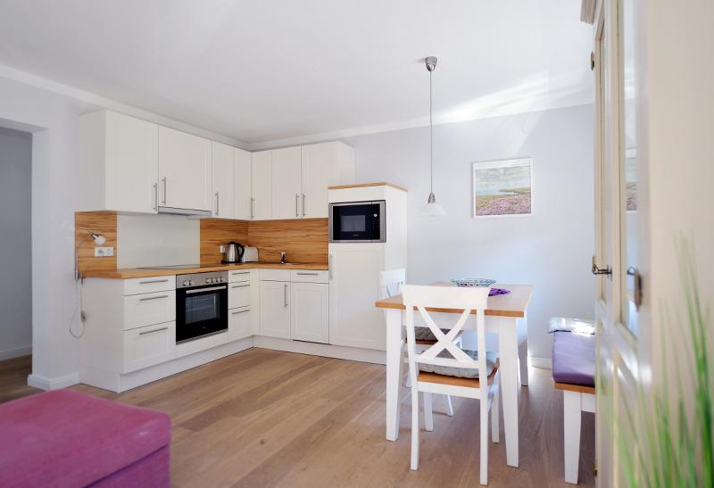 Die Erdgeschosswohnung Nr. 1 bietet Platz für zwei bis vier Personen. Ein großzügiges und helles Wohnzimmer mit bequemen Sofa, ein Essplatz sowie eine moderne Küchenecke lassen keine Wünsche offen. Vom Wohnzimmer aus geht es direkt auf die windgeschützte Südterrasse mit Mobiliar. Ein Schlafzimmer mit Doppelbett sowie ein Duschbad mit Fenster gehören ebenfalls zur Wohnung. Im Souterrain (großes Fenster) befindet sich ein kleines Zimmer mit Etagenbett.