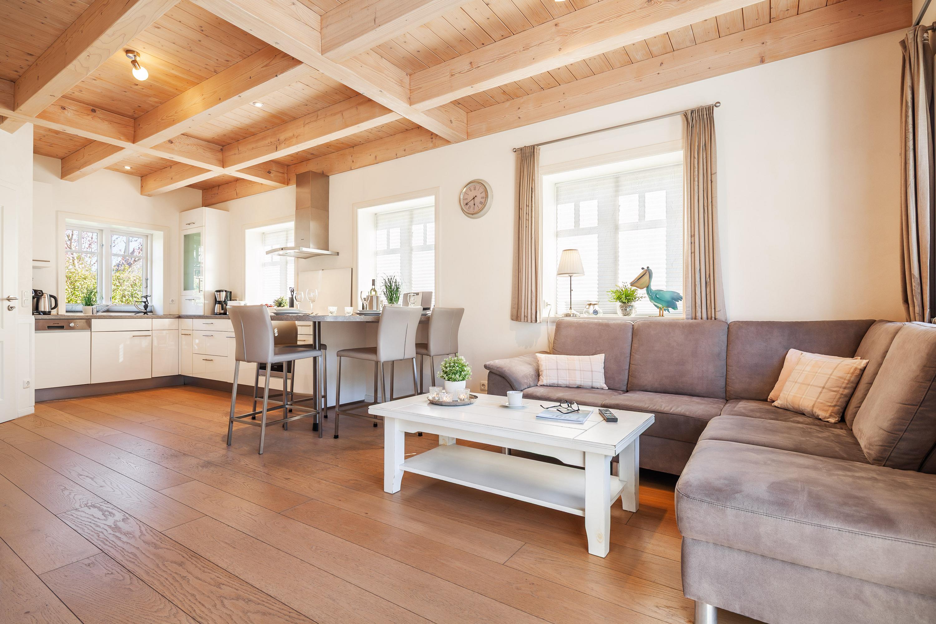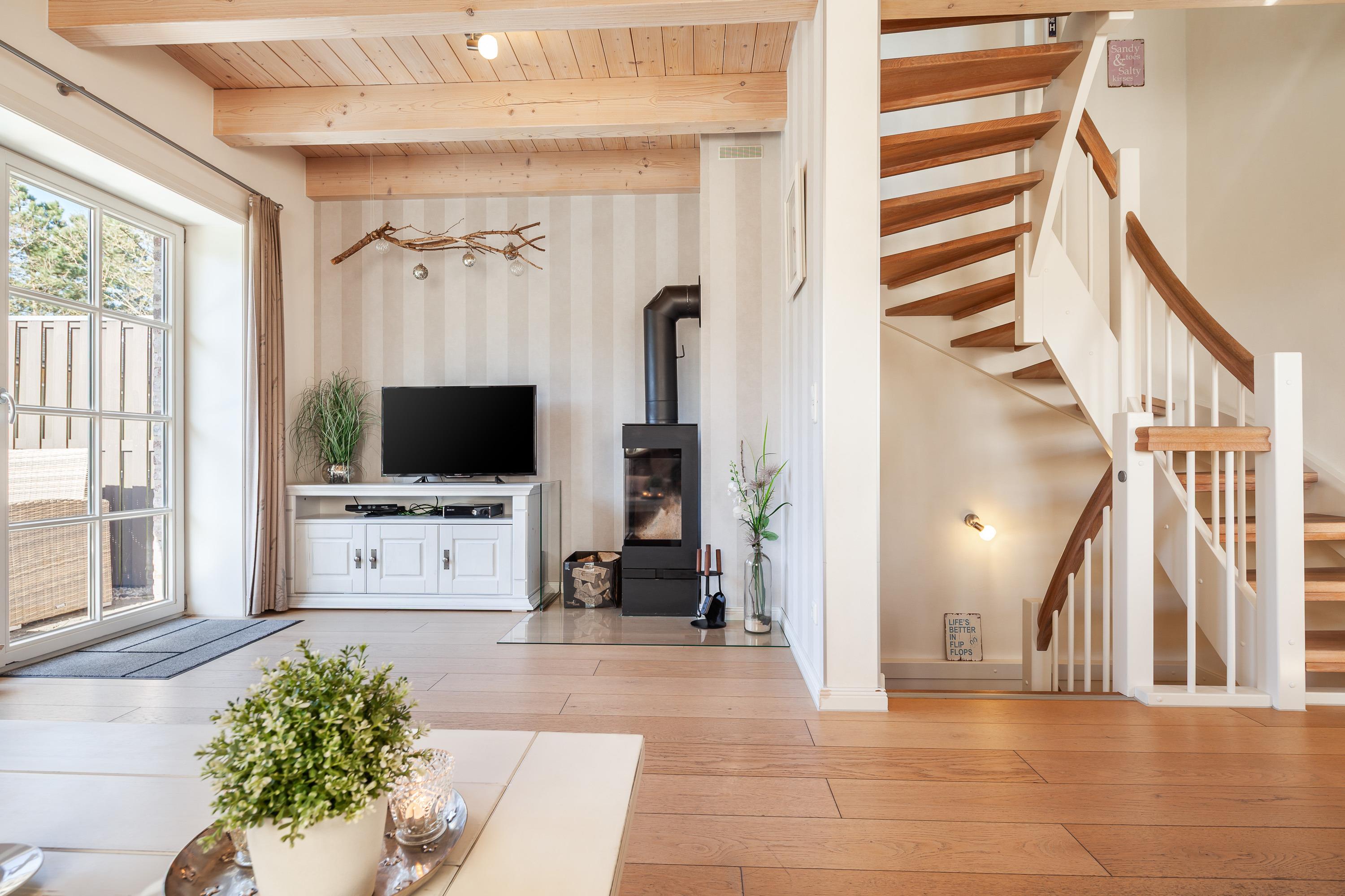 Die moderne Unterkunft wurde im Sommer 2015 fertiggestellt. Eiche-Dielenböden sowie Fliesen in Betonoptik im Erdgeschoss und Design-Böden im Obergeschoss, die moderne Küche und die eigene Sauna zeugen von bester Qualitätsausstattung. Der Tischler leistete hier Glanzarbeiten bis ind Detail: sichtbare Holzdecken im Erdgeschoss, Holzfenster, Einbauschränke.