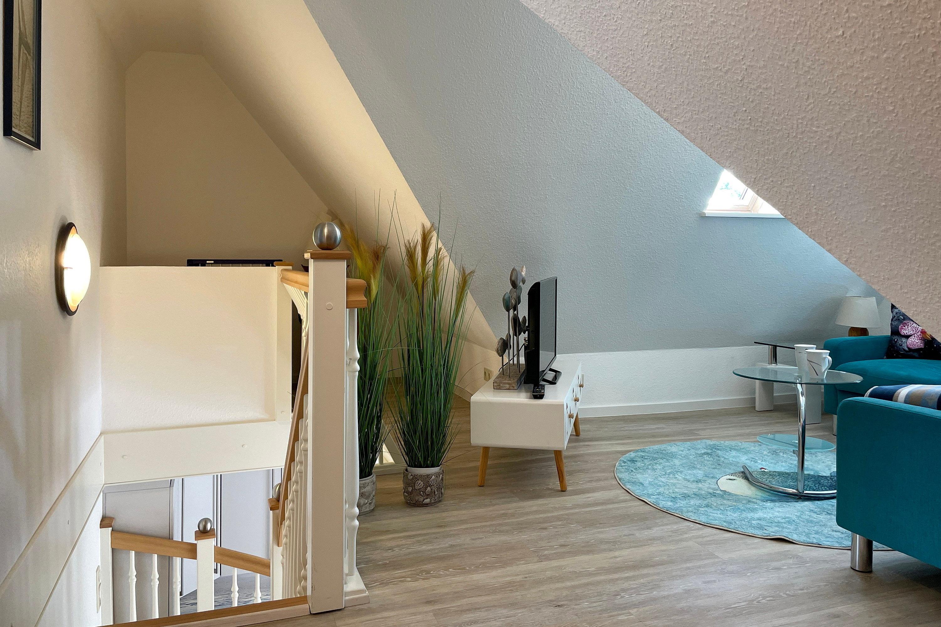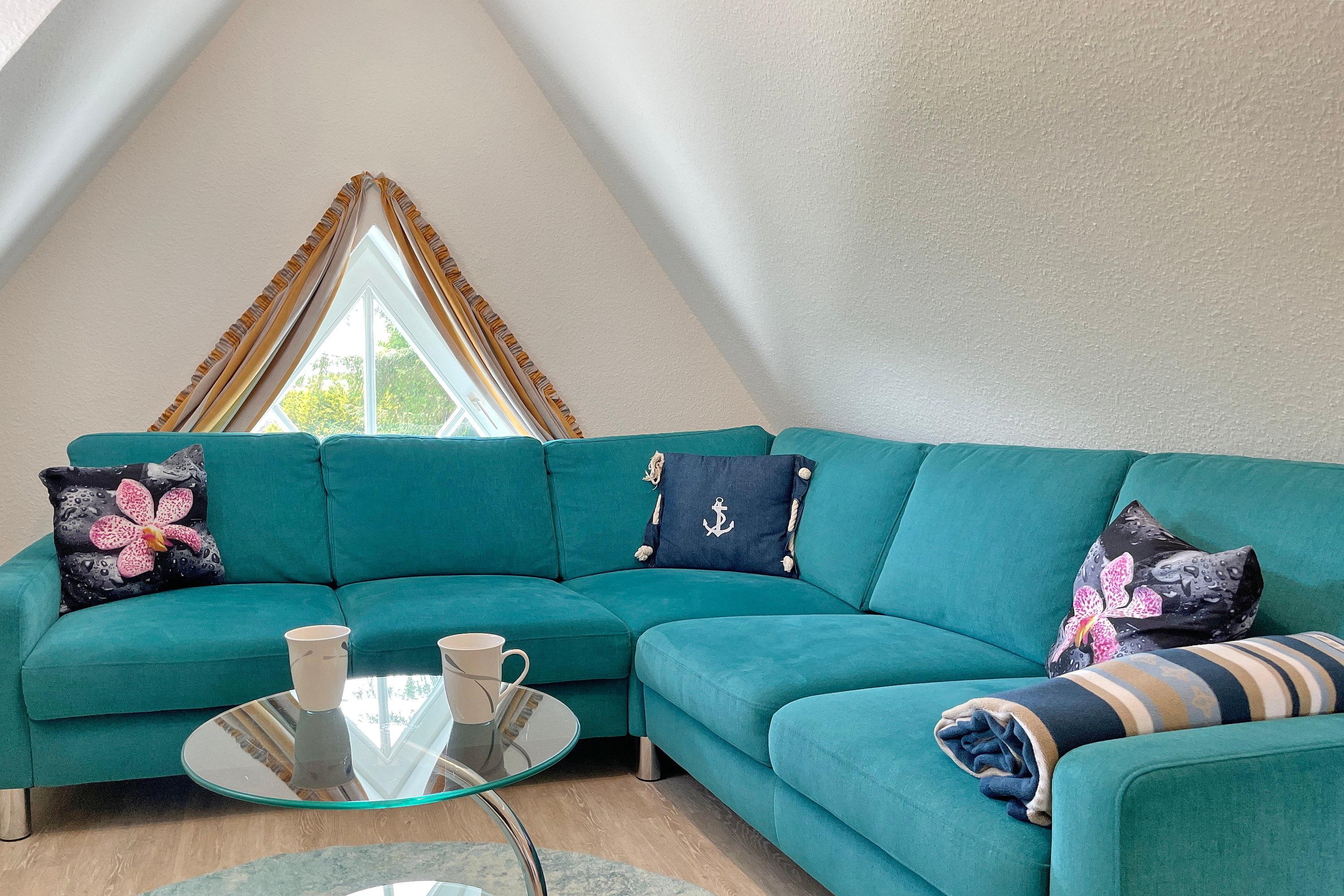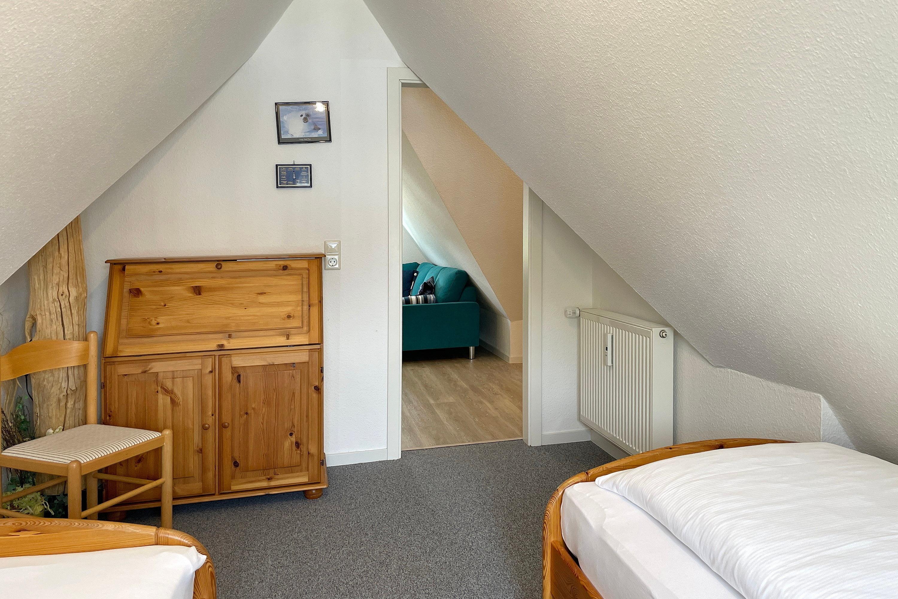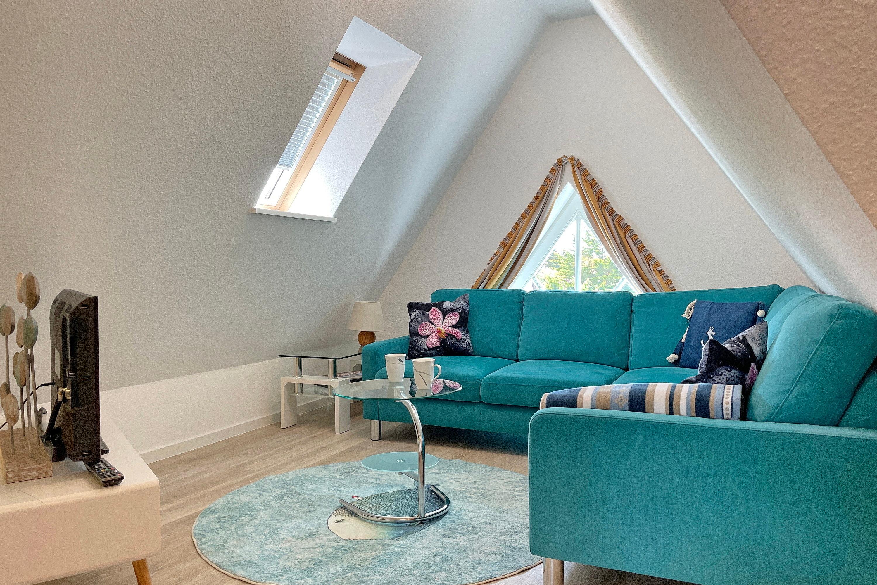 Die schöne Anlage Friesenperle in der Feldstraße 15 a und b besteht aus zwei Häusern mit jeweils 6 Wohneinheiten. Auf dem Grundstück befindet sich eine kleine Grillecke, Abstellmöglichkeiten für Ihre Fahrräder, für jede Wohnung ein eigener Parkplatz sowie für unsere kleinen Gäste eine Doppelschaukel mit Kletterleiter um sich auszutoben. Im vorderen Gebäude steht allen Gästen zur gemeinschaftlichen Nutzung im Keller ein Waschraum mit Waschmaschine und Trockner ( jeweils gegen Gebühr), Wäscheständer und Bügelbrett mit Bügeleisen sowie eine Sauna (gegen Gebühr) mit Duschmöglichkeit und Ruheraum zur Verfügung. Durch die Lage in zweiter Reihe zur Straße ist die Anlage besonders bei befreundeten Familien, die gerne gemeinsam verreisen möchten besonders beliebt, doch auch Pärchen verleben wunderbare Urlaubstage. Die zentrale Lage ermöglicht es in wenigen Minuten das Friesenmuseum, das Wellenbad Aqua Föhr und den Abenteuerspielplatz Löwenhöhle im nahe gelegenen Wald zu besuchen oder einen Spaziergang durch die hübschen Gassen der Wyker Innenstadt zu unternehmen, um die vielen freundlichen Cafés, Geschäfte und Restaurants kennenzulernen. Die gemütliche Obergeschosswohnung Friesenperle 11 (ca. 45 qm) erstreckt sich über das erste Obergeschoss und das Dachgeschoss. Die liebevolle Einrichtung und ausgewählte Accessoires verleihen der Wohnung eine einladende Gemütlichkeit. Im ersten Obergeschoss der Wohnung befindet sich die offene Küche mit dem einladenden Essbereich sowie dem Telefon und einem Fernseher, ein Schlafzimmer mit Doppelbett und das hellgeflieste Bad, welches über eine Dusche und einen Handtuchheizkörper verfügt. Sowohl über den Essbereich als auch über das Schlafzimmer können Sie auf den Südbalkon mit Gartenmöbeln (von ca. April bis Oktober) gelangen. Über eine Treppe zum offenen Dachgeschoss. Hier befindet sich ein gemütlicher Wohnbereich mit WLAN, Flachbild-TV, Stereoanlage, der zum Verweilen einlädt. Das zweite Schlafzimmer ist ausgestattet mit zwei Einzelbetten und mit einer Tür vom restlichen Wohnbereich abgeteilt ist. Verbringen Sie entspannte Urlaubstage in einer Wohnung, die sich ideal für Familie eignet. Wir freuen uns auf Ihren Anruf!