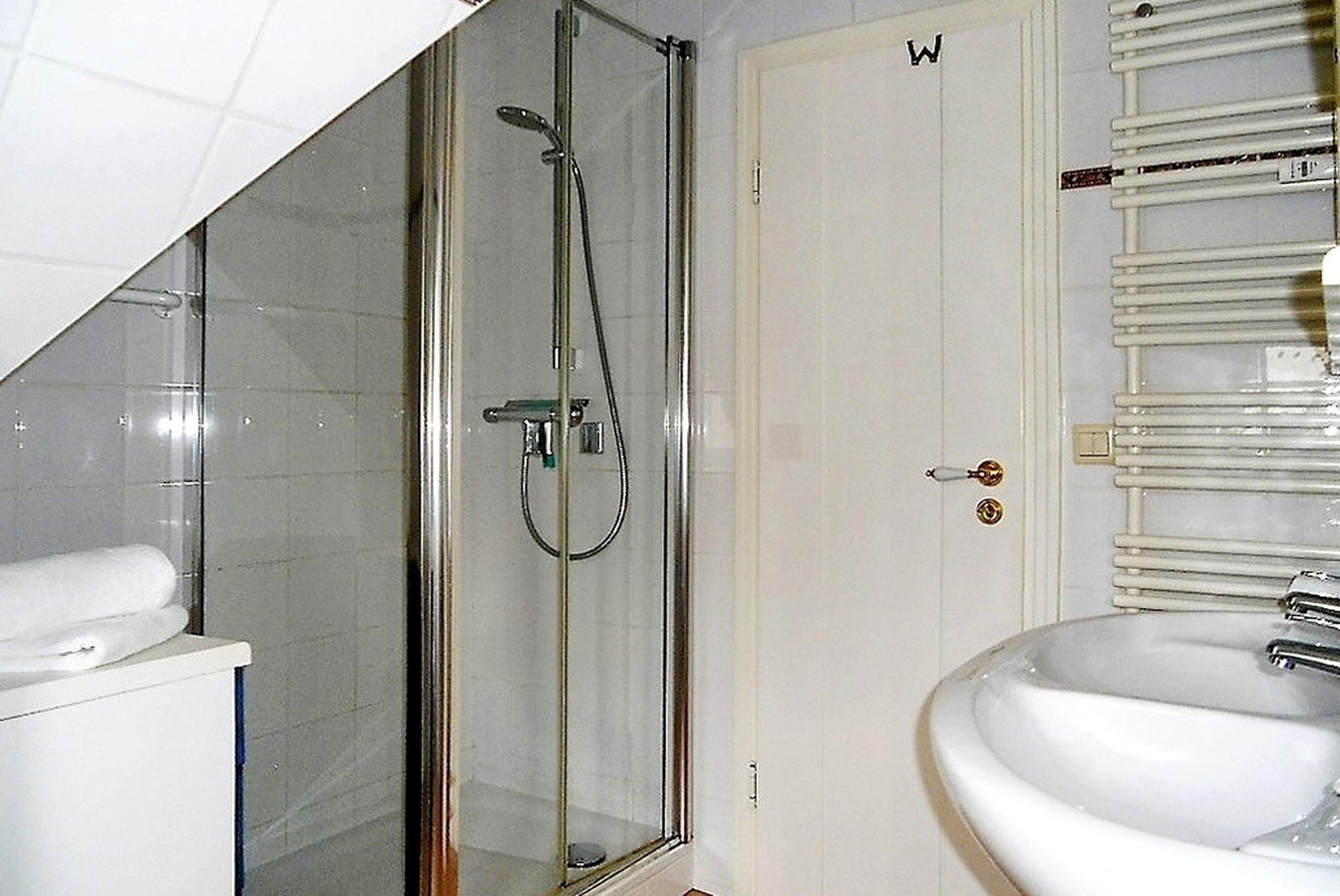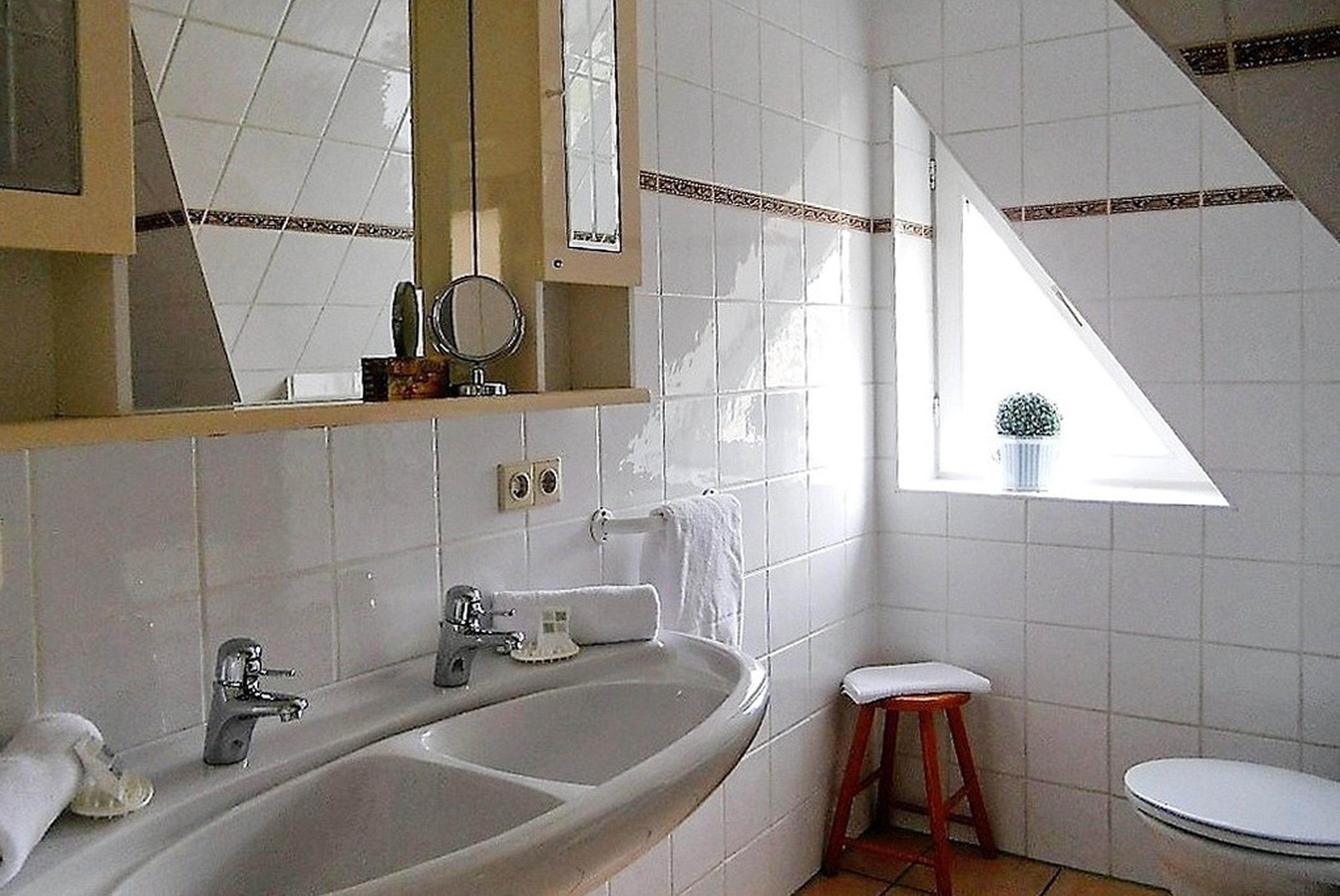 Unsere gemütliche Obergeschosswohnung Friesenperle 6 erstreckt sich über zwei Etagen und bietet 4 Gästen ausreichend Platz erholsame Urlaubstage zu verbringen. Das Bad ist mit Dusche mit flachem Einstieg und Handtuchheizkörper ist, verfügt über einen Doppelwaschtisch und ein Fenster. Der Schlafraum mit Doppelbett (160 x 200 cm) und Dachfenster mit Blick zu den Sternen lädt zum Träumen ein. Der Hauptwohnbereich mit integrierter Küche und Essplatz wirkt einladend und das Wohnzimmer mit zwei hübschen Sofagarnituren, WLAN, Flachbild-TV, DVD-Player, Haustelefon und Stereoanlage eignet sich hervorragend zum Entspannen. Von hier aus gelangen Sie auf den Südbalkon mit Gartenmöbeln (ca. April bis Oktober). Die Küchenzeile mit Ceranfeldherd und Backofen, Geschirrspüler, Kühlschrank mit Gefrierfach, Kaffeemaschine und einer zusätzlichen Senseo Maschine ist vollausgestattet. Im 2. Obergeschoss finden Sie einen weiteren offenen Schlafbereich vor mit zwei Einzelbetten (90 x 200 cm) und einem zweiten Fernseher. Ihr Hund ist hier ebenfalls herzlich Willkommen. Genießen Sie herrliche Urlaubstage in einer Wohnung, die keine Wünsche offen lässt.