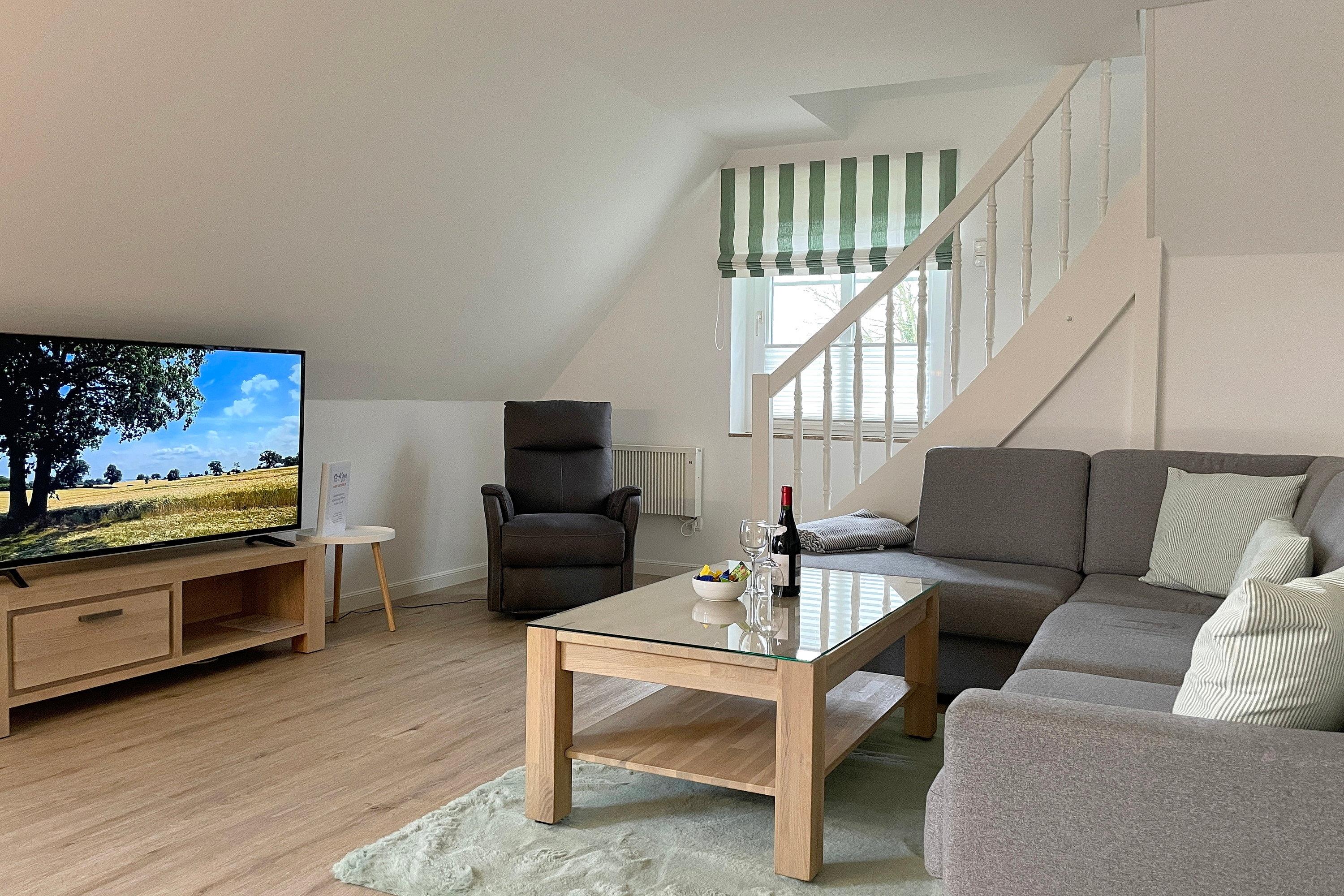 Im 2. Obergeschoss befindet sich ein Spielzimmer für Kinder, welches auch ein gemütlicher Rückzugsort ist um in aller Ruhe ein gutes Buch zu lesen. Der dort befindliche Fernseher ist zur Nutzung von Streamingdiensten gedacht.
