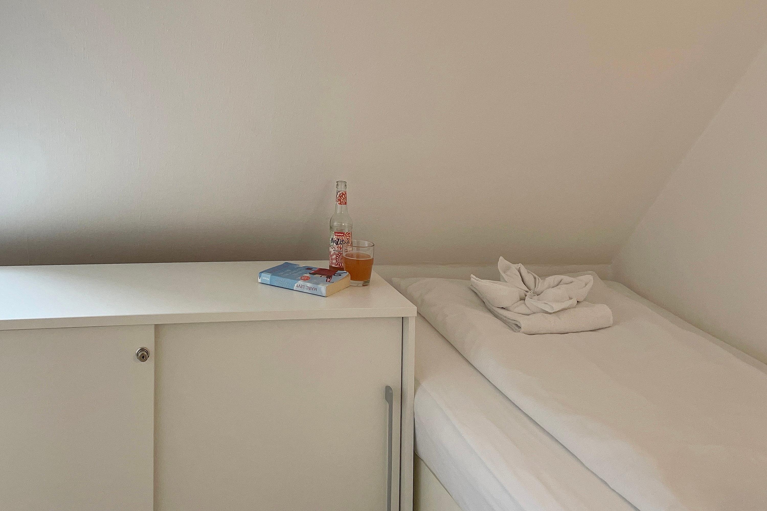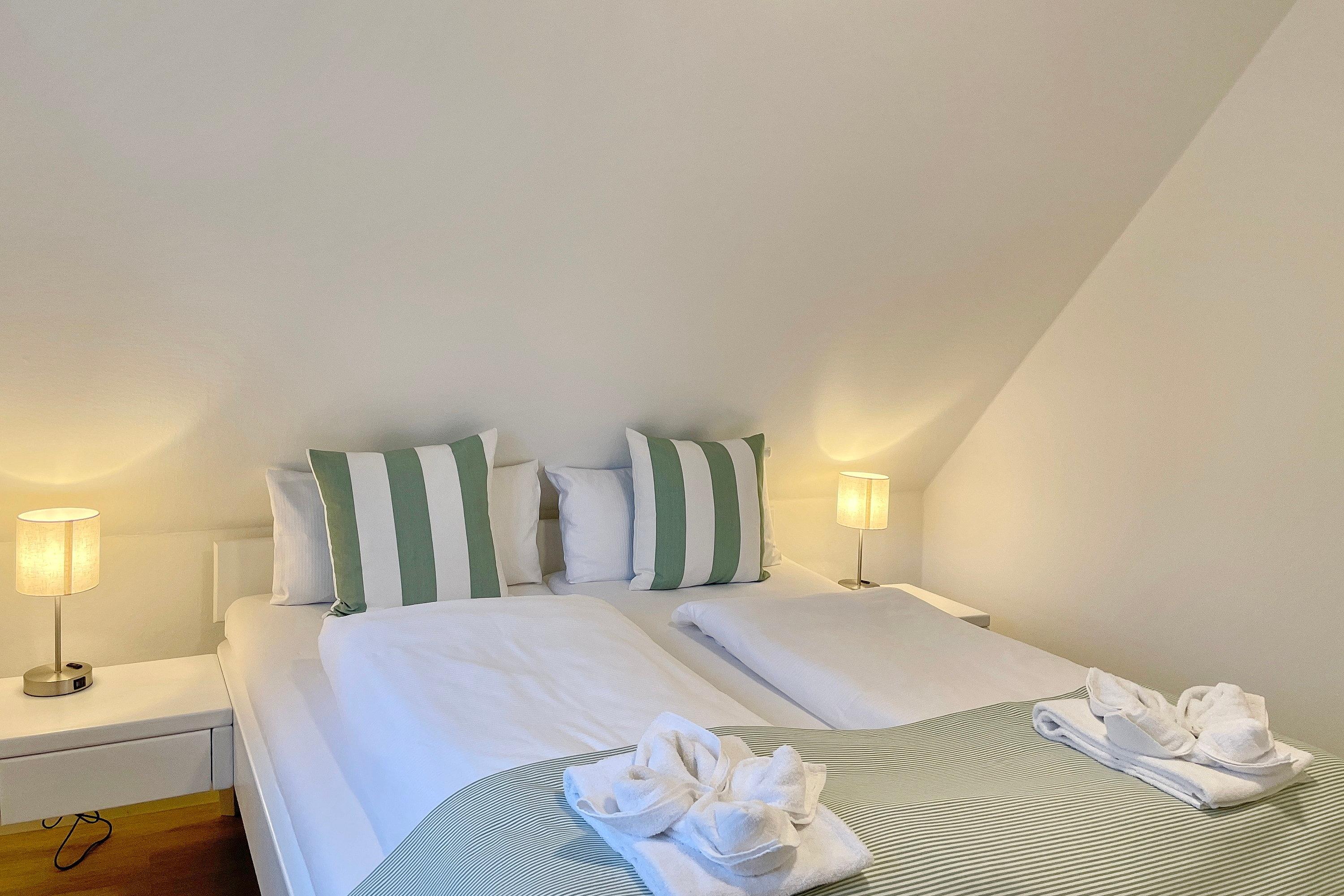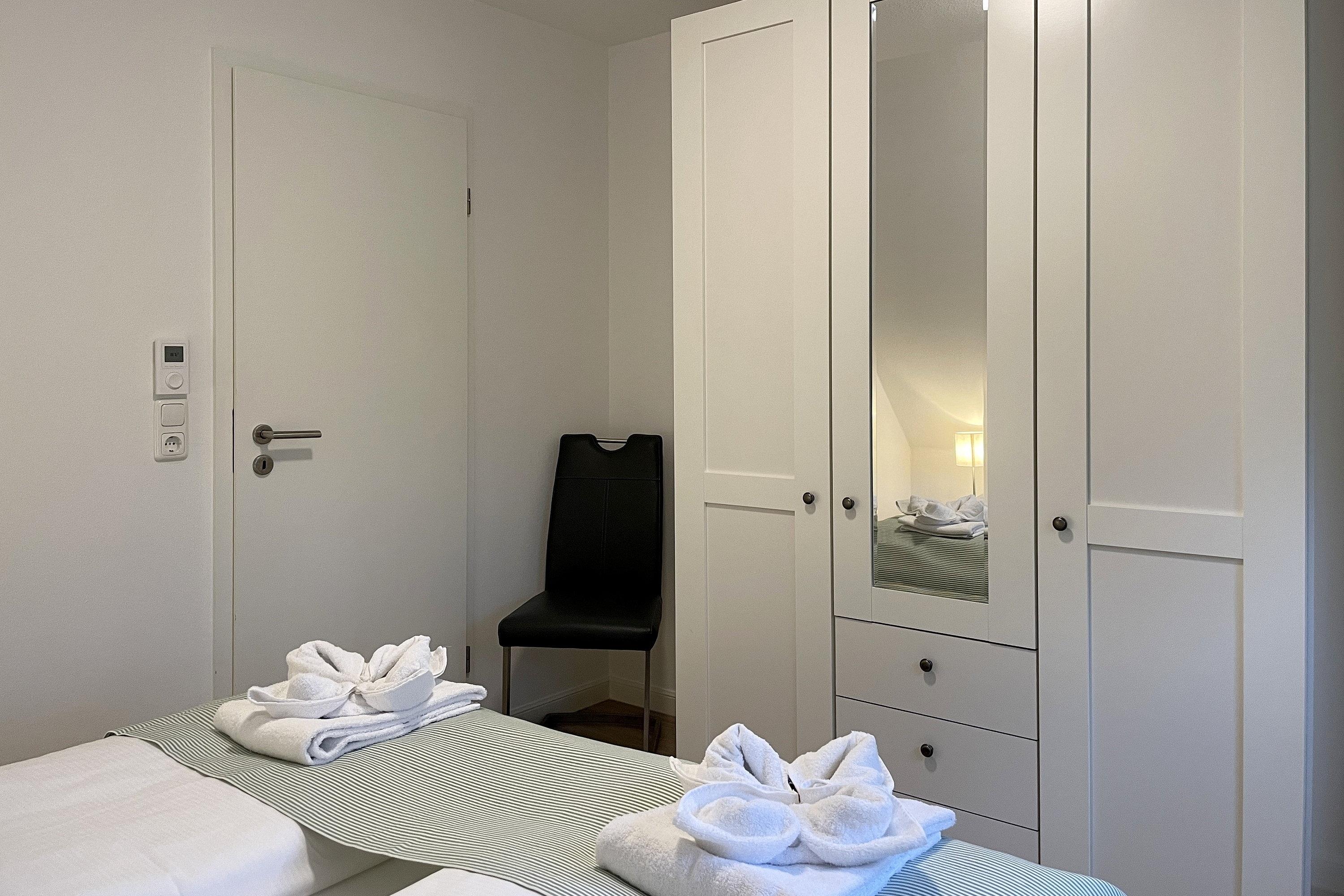 Das Haus am Stadtpark gelegen im Grünstreifen unweit des Stadtparkes mit seinen schönen Waldwegen und dem Abenteuerspielplatz Löwenhöhle ist eine gepflegte Anlage mit einem weitläufigen Grundstück. Hier befindet sich für alle Gäste der Anlage neben einem kleinen Spielplatz und einer Sitzecke auch die Möglichkeit gegen eine geringe Gebühr Waschmaschine und Trockner zu benutzen und die Fahrräder in dem Keller unterzustellen. Eine finnische Dampfsauna (gegen Gebühr) und ein kleiner Fitnessraum laden zum Verweilen ein. Viele Gäste genießen die ruhige Lage, wobei Sie einen Bäcker, einen Schlachter, den kleinen gut sortierten Einkaufsladen und natürlich den Strand und das Meer fußläufig erreichen können. Die Obergeschosswohnung im Haus am Stadtpark ist eine ideale Wohnung für Familien, welche sich über zwei Etagen erstreckt. Im 1. Obergeschoss befindet sich das moderne Badezimmer mit großzügiger Dusche, die beiden Schlafräume und der geräumige Wohnschlafraum mit integrierter Küche und Essplatz. Das Wohnzimmer verfügt über eine Sitzgarnitur (Schlafcouch 170 x 190 cm), einen elektrisch verstellbaren Relax Sessels , Smart-TV, WLAN und auf der anderen Seite des Raumes befindet sich die gut ausgestattete Küche mit einem Essplatz. Von hier aus gelangen Sie auf einen kleinen Balkon, der für 2 bis 3 Personen ausgerichtet ist. Ruhige Nächte verbringen Sie in den beiden Schlafzimmern. Das Elternschlafzimmer ist mit einem Doppelbett (180 x 200 cm) und einem Kleiderschrank ausgestattet, wobei das kleine Kinderzimmer ein Bett (90 x 200 cm) sowie eine Kommode vorweist.