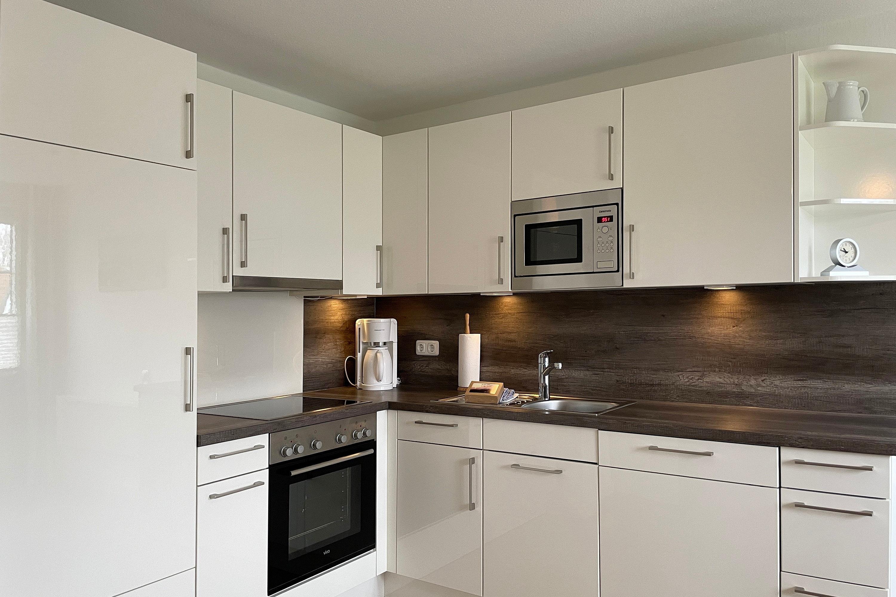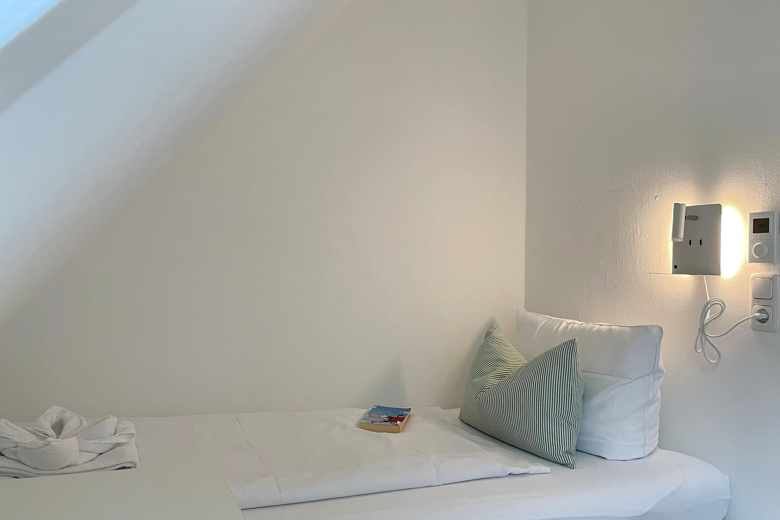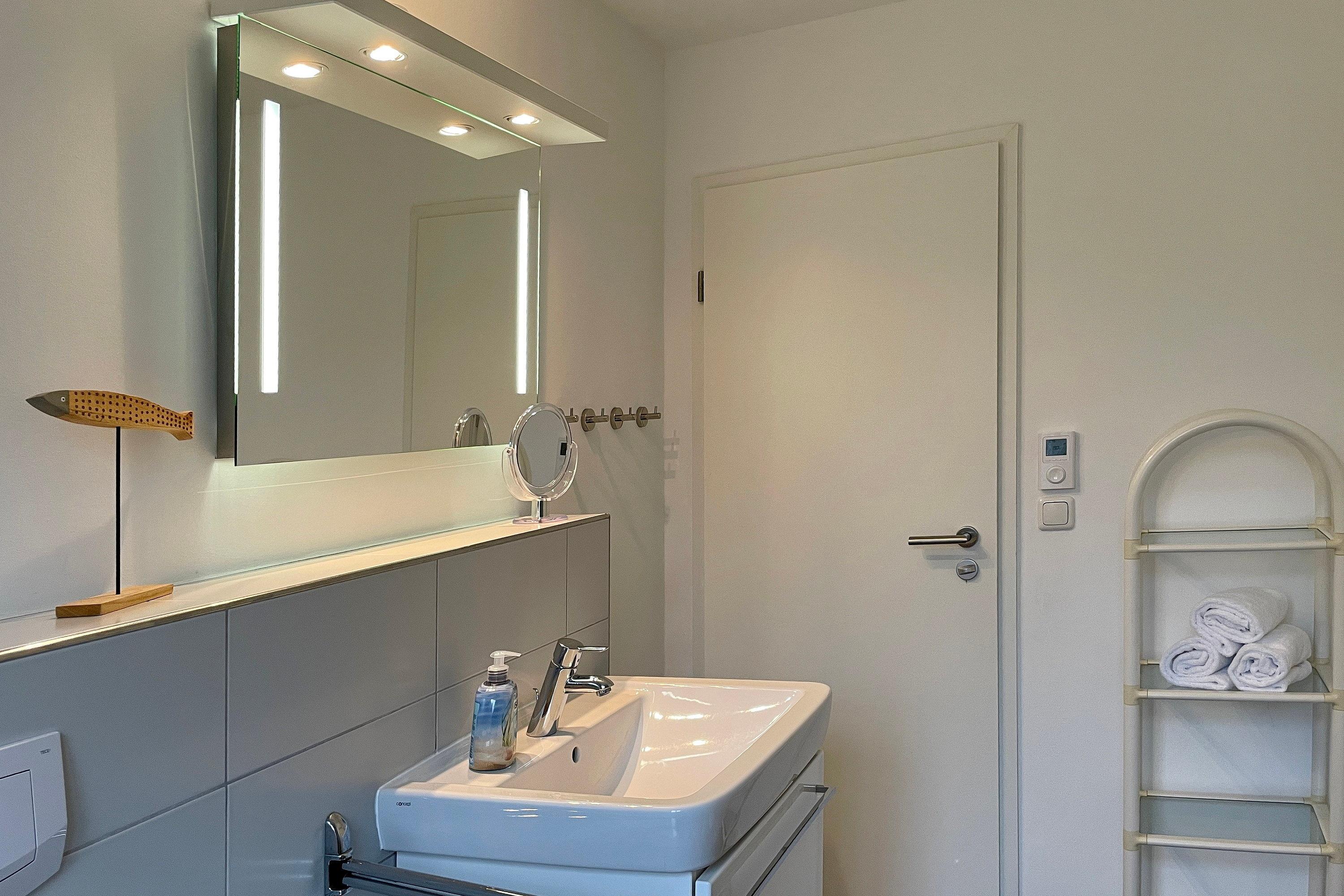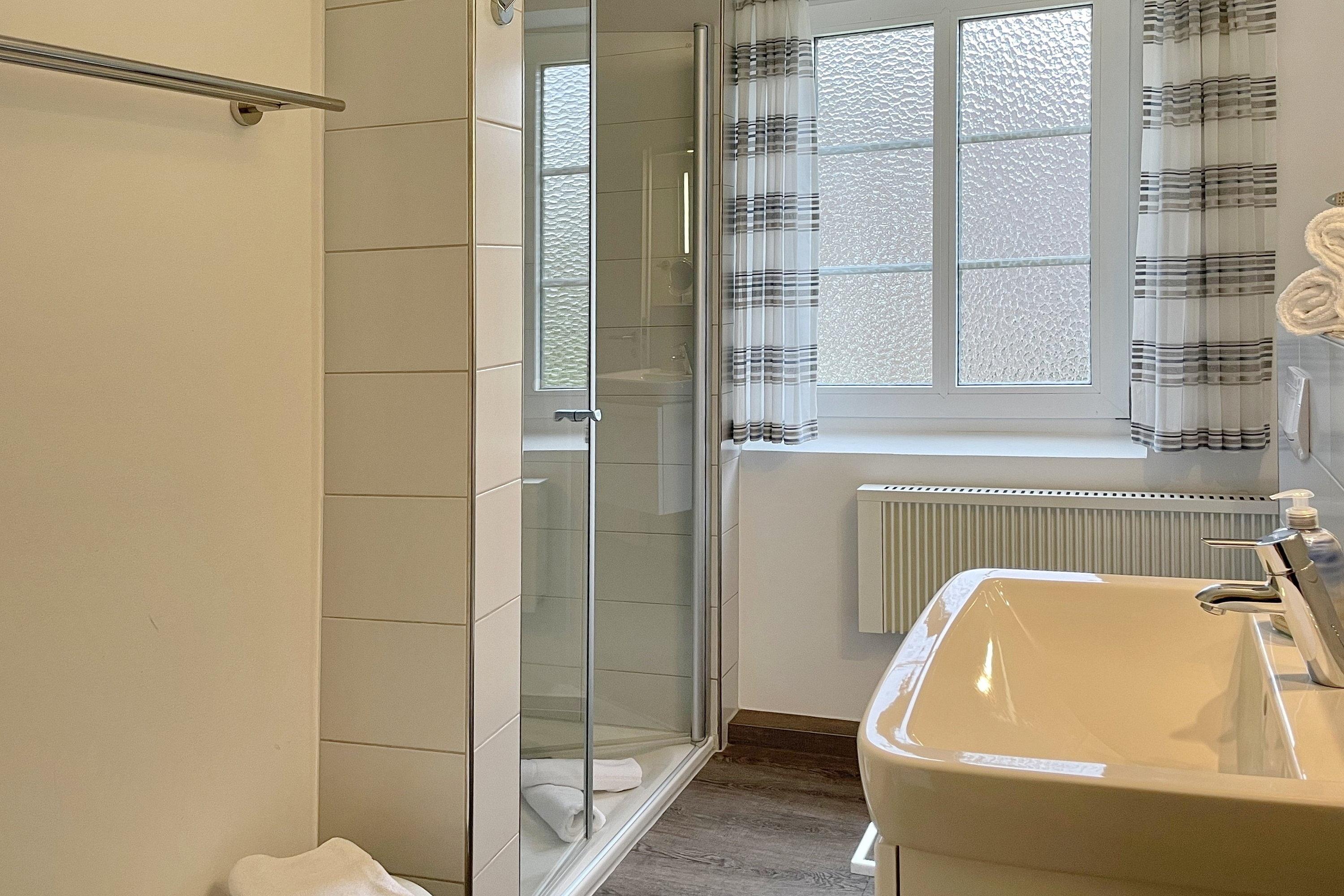 Das Haus am Stadtpark gelegen im Grünstreifen unweit des Stadtparkes mit seinen schönen Waldwegen und dem Abenteuerspielplatz Löwenhöhle ist eine gepflegte Anlage mit einem weitläufigen Grundstück. Hier befindet sich für alle Gäste der Anlage neben einem kleinen Spielplatz und einer Sitzecke auch die Möglichkeit gegen eine geringe Gebühr Waschmaschine und Trockner zu benutzen und die Fahrräder in dem Keller unterzustellen. Eine finnische Dampfsauna (gegen Gebühr) und ein kleiner Fitnessraum laden zum Verweilen ein. Viele Gäste genießen die ruhige Lage, wobei Sie einen Bäcker, einen Schlachter, den kleinen gut sortierten Einkaufsladen und natürlich den Strand und das Meer fußläufig erreichen können. Die Obergeschosswohnung im Haus am Stadtpark ist eine ideale Wohnung für Familien, welche sich über zwei Etagen erstreckt. Im 1. Obergeschoss befindet sich das moderne Badezimmer mit großzügiger Dusche, die beiden Schlafräume und der geräumige Wohnschlafraum mit integrierter Küche und Essplatz. Das Wohnzimmer verfügt über eine Sitzgarnitur (Schlafcouch 170 x 190 cm), einen elektrisch verstellbaren Relax Sessels , Smart-TV, WLAN und auf der anderen Seite des Raumes befindet sich die gut ausgestattete Küche mit einem Essplatz. Von hier aus gelangen Sie auf einen kleinen Balkon, der für 2 bis 3 Personen ausgerichtet ist. Ruhige Nächte verbringen Sie in den beiden Schlafzimmern. Das Elternschlafzimmer ist mit einem Doppelbett (180 x 200 cm) und einem Kleiderschrank ausgestattet, wobei das kleine Kinderzimmer ein Bett (90 x 200 cm) sowie eine Kommode vorweist.
