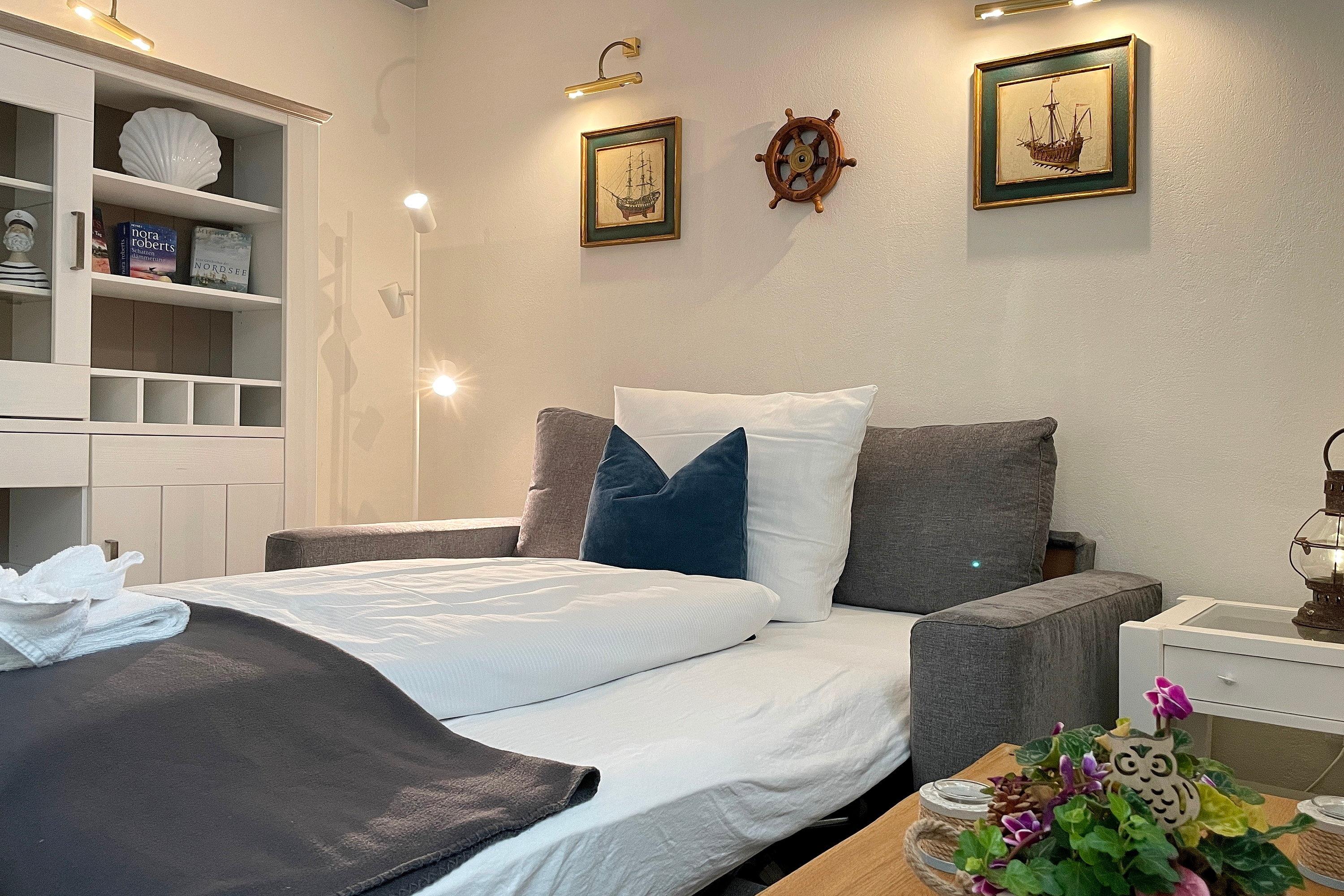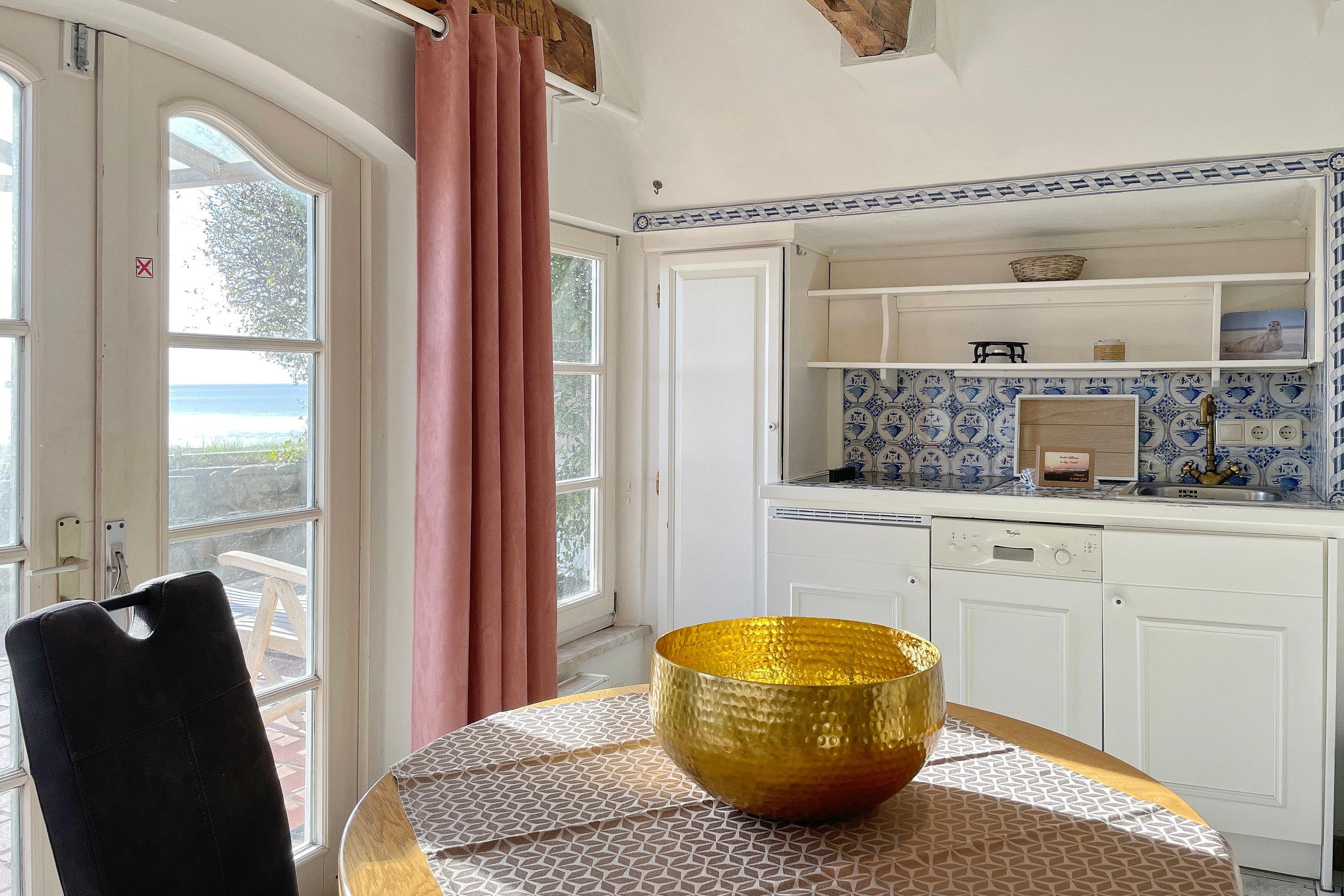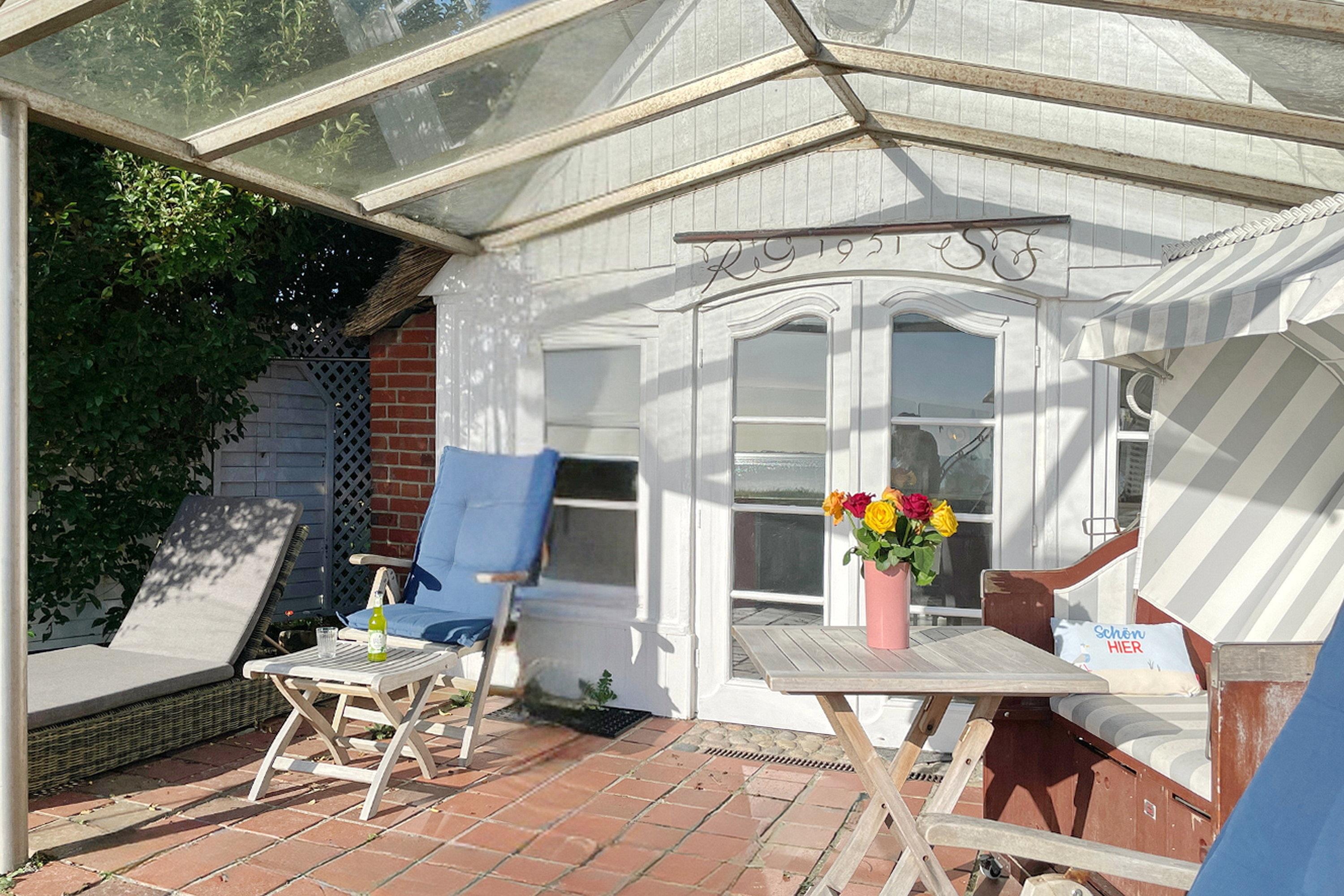 Das charmante Tiny-Reetdach-Häuschen "Seepferdchen" befindet sich neben dem Haupthaus Lüttenblick und bietet einen gemütlichen Urlaubsrückzug für 1 bis 4 Personen direkt am Südstrand. Dieses kompakte Feriendomizil erstreckt sich über zwei Etagen (Erdgeschoß und Souterrain) und verfügt über drei Zimmer. Ebenerdig betreten Sie die Wohnküche durch eine 1,60 hohe Friesentür. Hier erwartet Sie ein heller, einladender Raum (normale Deckenhöhe) mit einem internetfähigen Fernseher und einer Küche mit allem, was Sie brauchen: 4-Plattenherd, Mikrowelle, Filterkaffeemaschine, Wasserkocher, Toaster und Kühlschrank mit Gefrierfach. Der Sitzbereich mit gemütlichem Schlafsofa, Esstisch und Stühlen bietet einen traumhaften Ausblick auf das Meer und hier ist auch der direkte Zugang (ca. 1,80m hoch) zu Ihrer privaten Terrasse. Diese ist windgeschützt durch Glaselemente, so dass entspannte Momente garantiert sind -Relaxen im Strandkorb, Essen am Gartentisch mit Stühlen oder Sonnen auf Liegen, alles so wie Sie es wünschen! Eine Wendeltreppe führt Sie in den Wohnbereich mit einer gemütlichen Schlafcouch, Leseecke und einer kleinen Abseite mit Safe, die Platz für Ihre Koffer bietet. Maritime Accessoires bringen eine heimelige Gemütlichkeit in den Raum. Weiterhin befindet sich hier das Hauptschlafzimmer mit einem komfortablen Doppelbett und einem Kleiderschrank. Das Badezimmer ist mit einer ebenerdigen Dusche und einem WC ausgestattet und verfügt über einen separaten, abschließbaren Ausgang, der über eine Treppe in den Garten führt. Das Glaselement der Tür lässt sich kippen, sodass das Bad gut gelüftet werden kann. Das "Seepferdchen" vereint maritimes Flair mit modernem Komfort und ist der ideale Ausgangspunkt für Ihren Nordsee-Urlaub. Genießen Sie die Nähe zum Strand, die frische Seeluft und die gemütliche Atmosphäre dieses einzigartigen Reetdach-Häuschens.