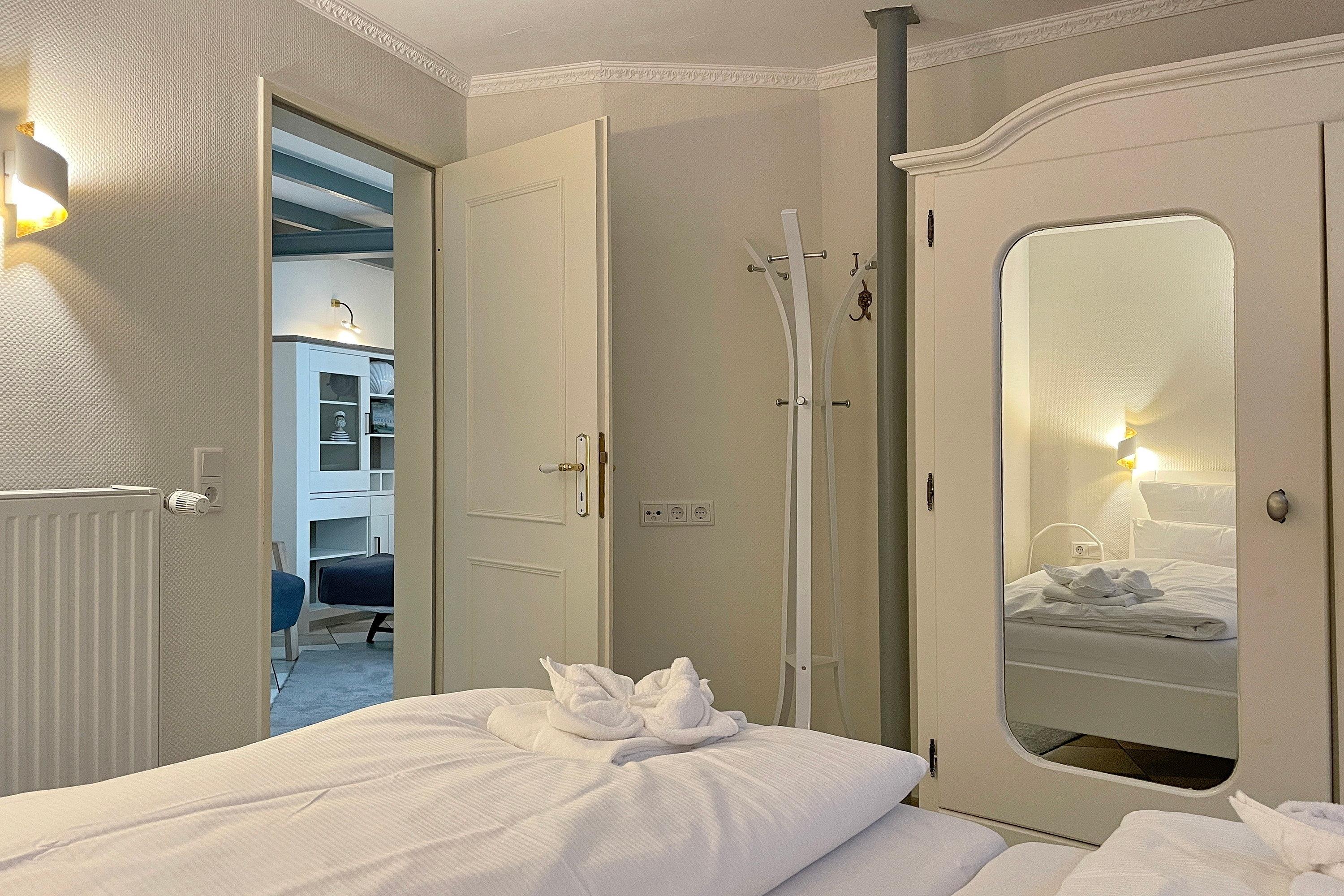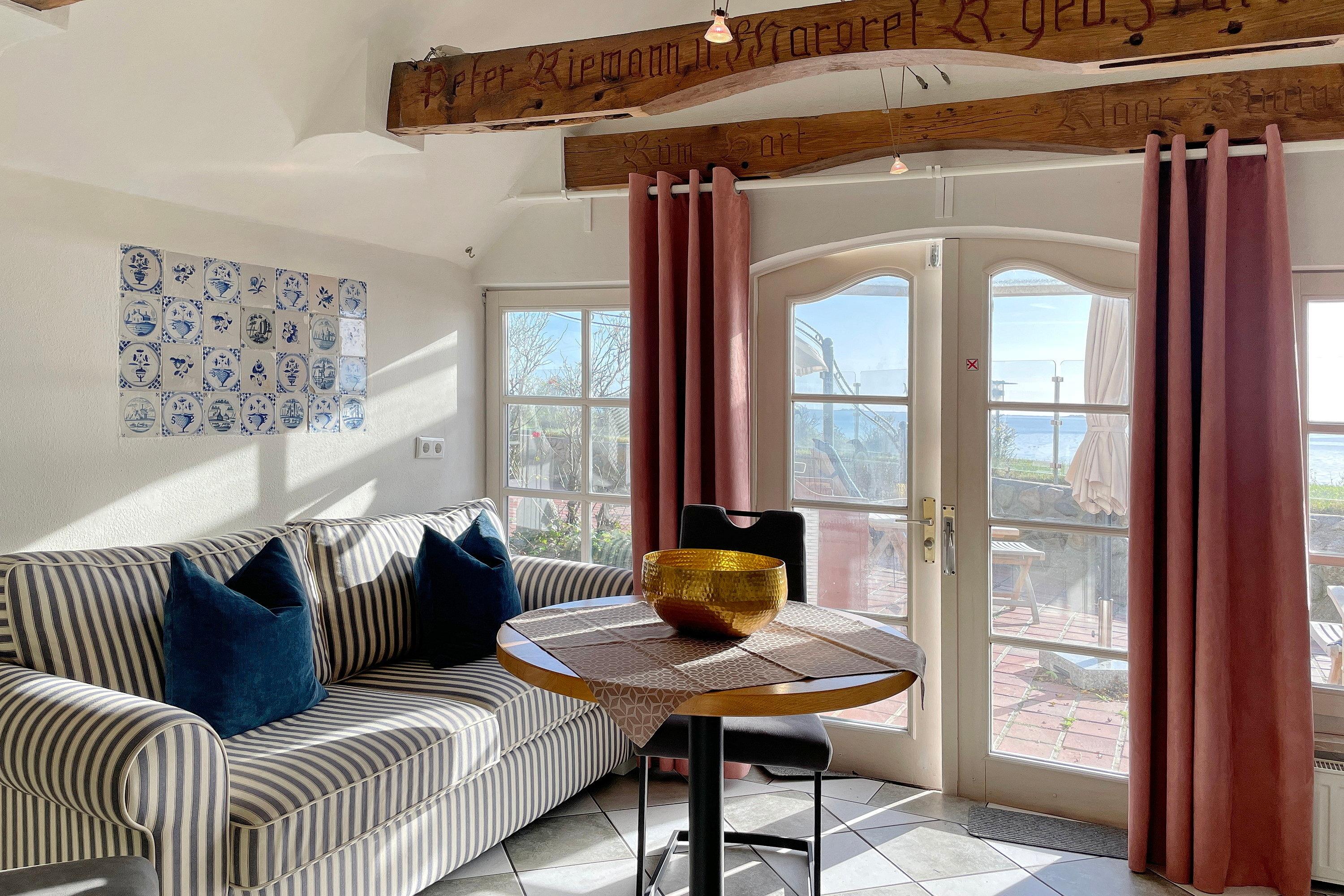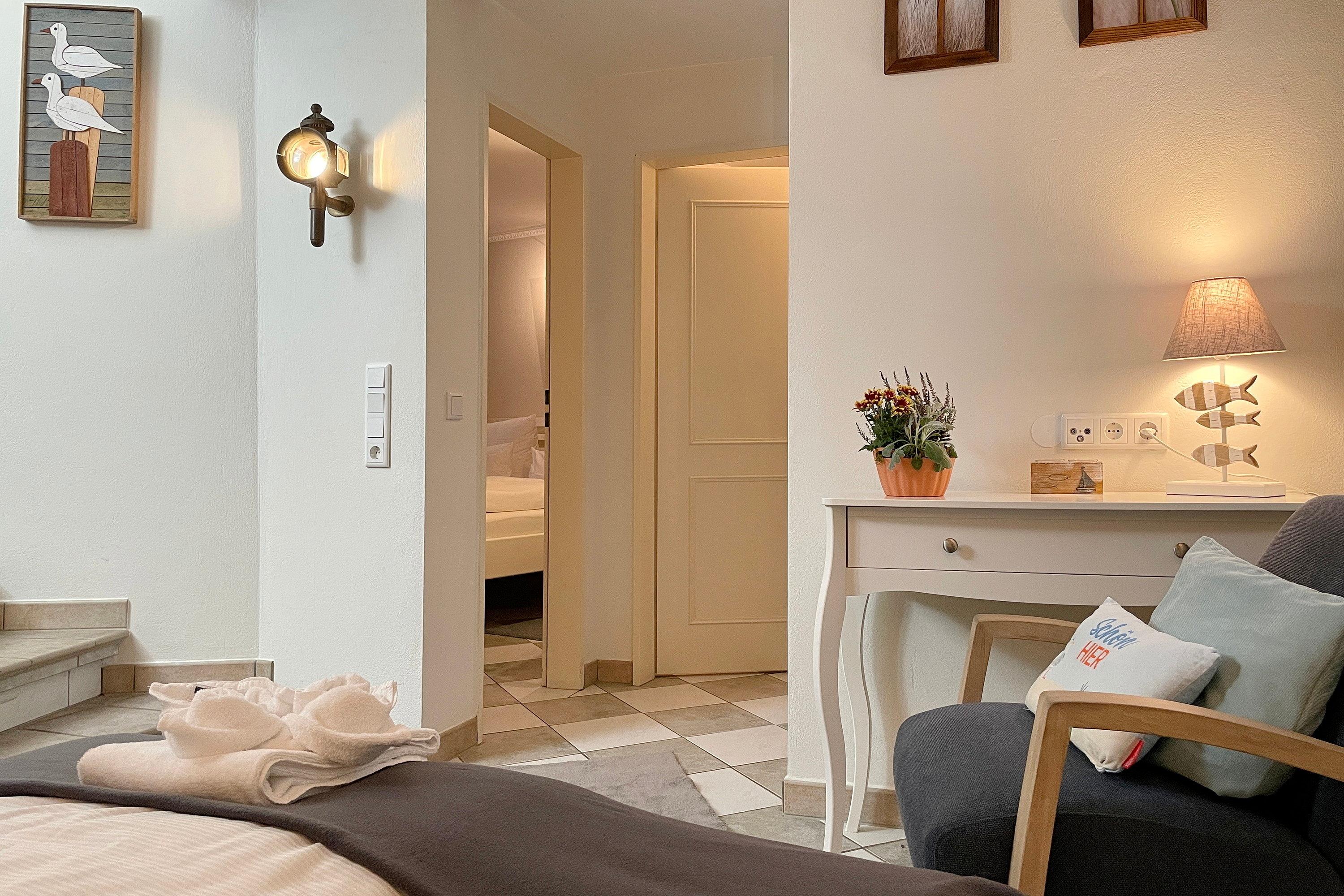 Das charmante Tiny-Reetdach-Häuschen "Seepferdchen" befindet sich neben dem Haupthaus Lüttenblick und bietet einen gemütlichen Urlaubsrückzug für 1 bis 4 Personen direkt am Südstrand. Dieses kompakte Feriendomizil erstreckt sich über zwei Etagen (Erdgeschoß und Souterrain) und verfügt über drei Zimmer. Ebenerdig betreten Sie die Wohnküche durch eine 1,60 hohe Friesentür. Hier erwartet Sie ein heller, einladender Raum (normale Deckenhöhe) mit einem internetfähigen Fernseher und einer Küche mit allem, was Sie brauchen: 4-Plattenherd, Mikrowelle, Filterkaffeemaschine, Wasserkocher, Toaster und Kühlschrank mit Gefrierfach. Der Sitzbereich mit gemütlichem Schlafsofa, Esstisch und Stühlen bietet einen traumhaften Ausblick auf das Meer und hier ist auch der direkte Zugang (ca. 1,80m hoch) zu Ihrer privaten Terrasse. Diese ist windgeschützt durch Glaselemente, so dass entspannte Momente garantiert sind -Relaxen im Strandkorb, Essen am Gartentisch mit Stühlen oder Sonnen auf Liegen, alles so wie Sie es wünschen! Eine Wendeltreppe führt Sie in den Wohnbereich mit einer gemütlichen Schlafcouch, Leseecke und einer kleinen Abseite mit Safe, die Platz für Ihre Koffer bietet. Maritime Accessoires bringen eine heimelige Gemütlichkeit in den Raum. Weiterhin befindet sich hier das Hauptschlafzimmer mit einem komfortablen Doppelbett und einem Kleiderschrank. Das Badezimmer ist mit einer ebenerdigen Dusche und einem WC ausgestattet und verfügt über einen separaten, abschließbaren Ausgang, der über eine Treppe in den Garten führt. Das Glaselement der Tür lässt sich kippen, sodass das Bad gut gelüftet werden kann. Das "Seepferdchen" vereint maritimes Flair mit modernem Komfort und ist der ideale Ausgangspunkt für Ihren Nordsee-Urlaub. Genießen Sie die Nähe zum Strand, die frische Seeluft und die gemütliche Atmosphäre dieses einzigartigen Reetdach-Häuschens.