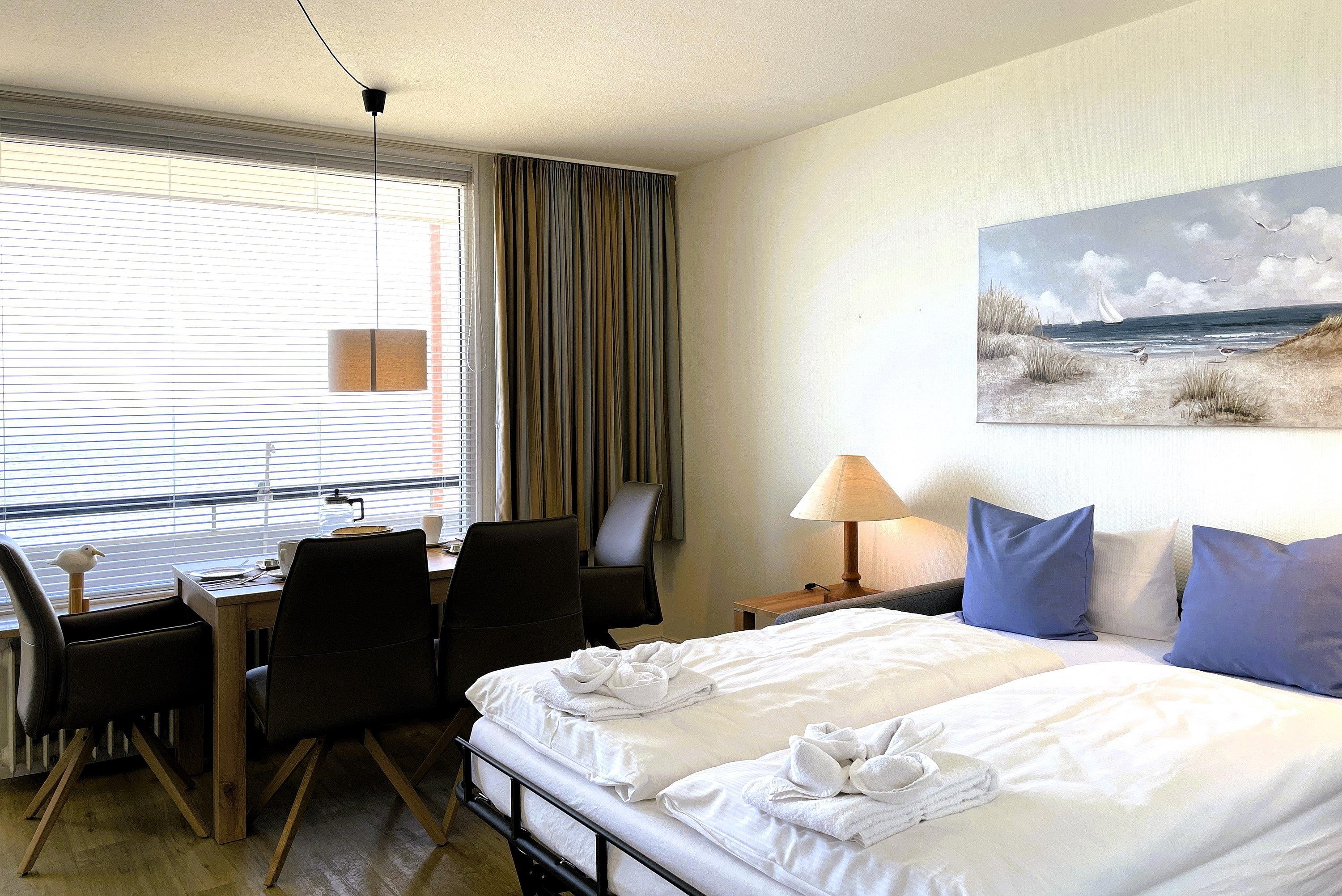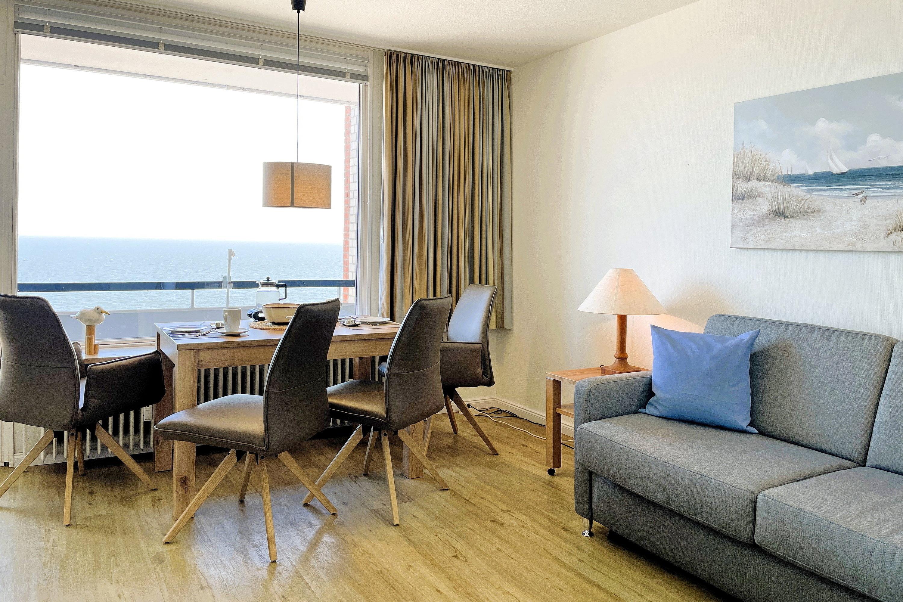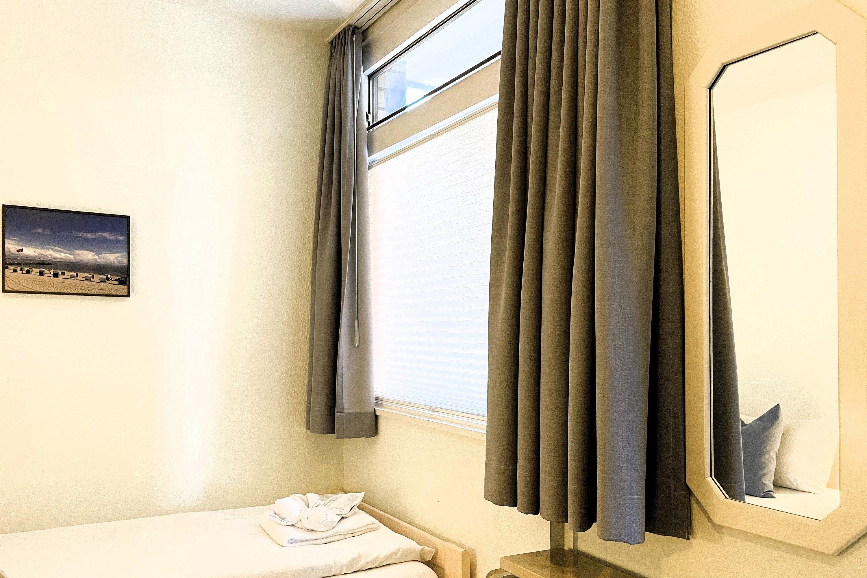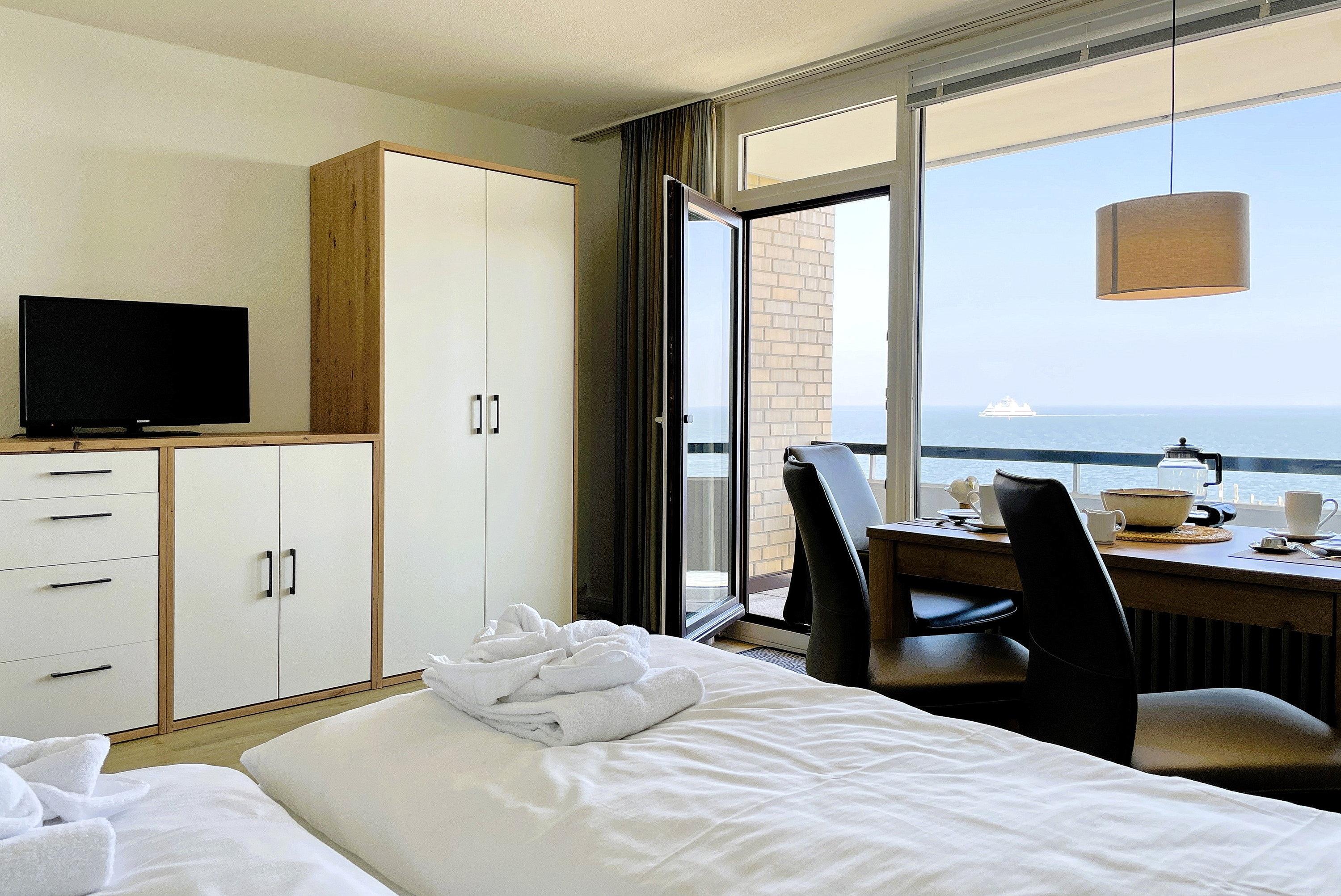 Im Keller des Hauses stehen Waschmaschine und Trockner gegen eine geringe Gebühr zur gemeinschaftlichen Nutzung zur Verfügung. Genießen Sie den herrlichen Blick auf den Strand und das Meer direkt von Ihrem Balkon oder Ihrer Terrasse aus. Genießen Sie Ihre Urlaubstage am Meer im Haus Irma und beobachten Sie das Schauspiel von Ebbe und Flut direkt von dem geschützten Balkon. Im Sommer können Sie bequem noch vor dem Frühstück über direktem Zugang vom Haus aus an den Strand und eine Runde Schwimmen oder nach einem erlebnisreichen Urlaubstag den Abend auf dem Balkon mit einem Glas Wein ausklingen lassen, während Sie den Blick auf die abendliche Nordsee genießen. Unsere Wohnung Irma 24 befindet sich im dritten Stock des Hauses und ist sportlich per Treppe oder auch bequem mit einem Aufzug (4 Stufen bis zum Aufzug) erreichbar. Sie bietet Platz für 2, max. 4 Personen, und verfügt über ein Schlafzimmer mit zwei Einzelbetten (90x190cm) und großzügigem Schiebetürenschrank sowie einem hellgefliesten Bad mit Dusche und kleinem Fenster. Der Wohnbereich mit zweckmäßig eingerichteter Küche mit Ceranfeldherd, Kühlschrank mit Gefrierfach, Mikrowelle mit Grillfunktion, Wasserkocher und Senseo Duo Kaffeemaschine (Pad und Filterkaffee möglich) ist hell und verführt mit der breiten Glasfront, die direkten Blick auf Strand und Meer freigibt. Eine gemütliche Essecke und eine bequeme Sitzgruppe mit Flachbild- TV, WLAN und CD-Player vervollständigen den Wohnbereich. Eine Schlafcouch (140 x190 cm) bietet die weitere Schlafgelegenheiten, wenn Sie mit 4 Personen anreisen. Vom Wohnzimmer gelangen Sie direkt auf den Balkon, welcher im Sommer mit Gartenmöbeln zum Verweilen einlädt. Erleben Sie traumhaft schöne Tage auf Föhr.