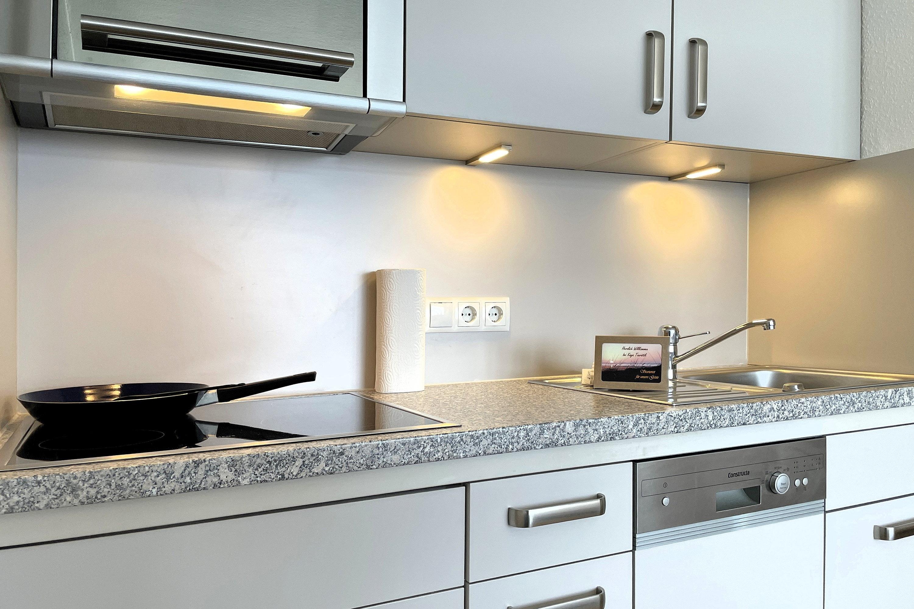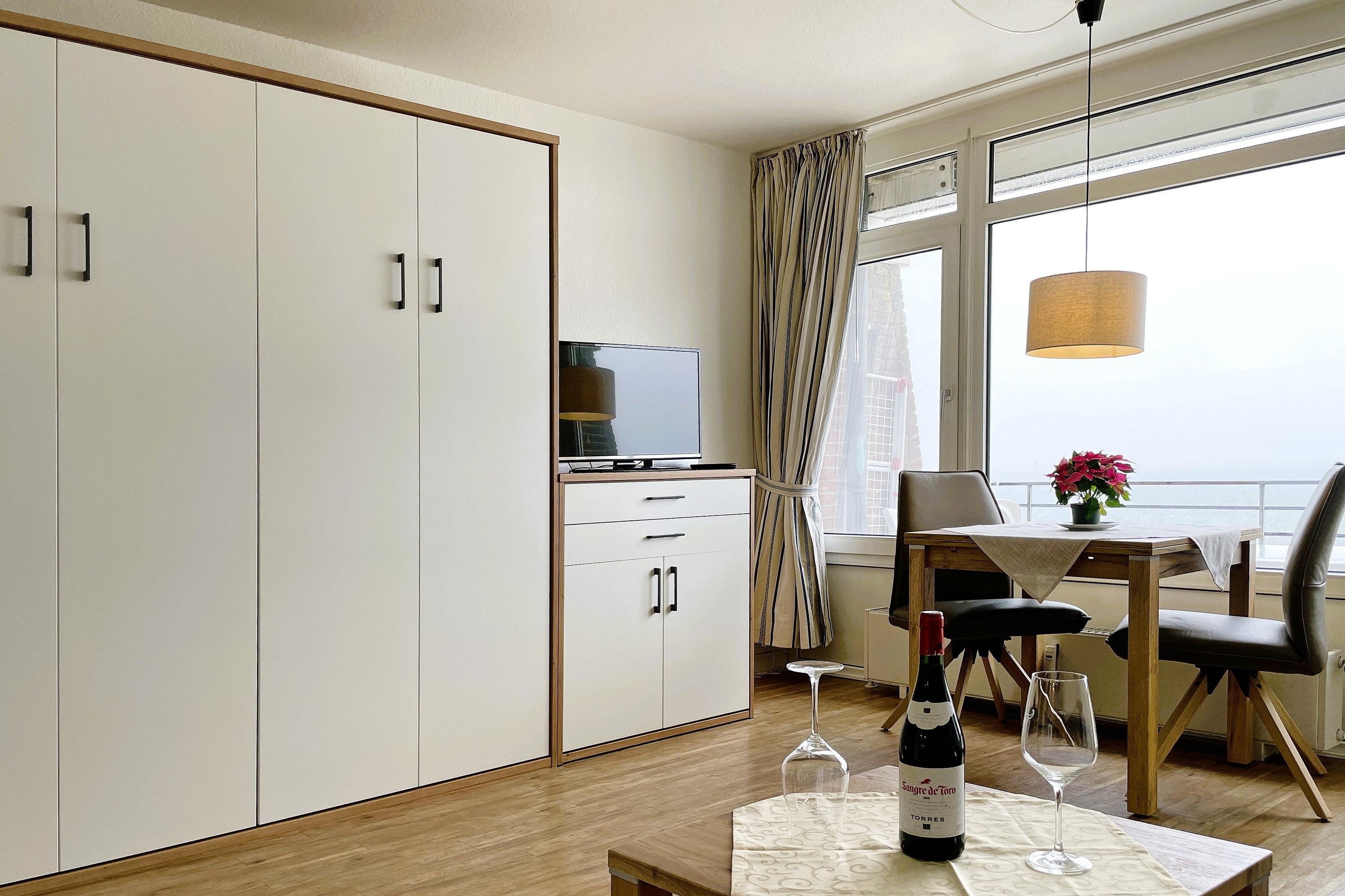 Im ruhigeren Abschnitt des belebten Sandwalls befindet sich das Haus Klaar Kiming direkt vor der Strandpromenade. In wenigen Minuten sind Sie mitten im Geschehen und können die vielen freundlichen Cafés und Restaurants besuchen, in den kleinen Geschäften bummeln gehen oder sich im Aquaföhr vergnügen. Im Haus befindet sich eine Waschmaschine und Trockner, die gegen eine geringe Gebühr zur gemeinschaftlichen Nutzung bereitsteht. Vom Keller aus gelangen Sie durch einen zweiten Eingang (Ostern bis Ende Oktober wetterabhängig) auch direkt an die Promenade und den Strand. Die Wohnungen bieten hier einen herrlichen Blick über das Meer und Sie können die Fähren, die Möwen und Ebbe und Flut vom Balkon oder der Terrasse aus beobachten. Unsere gemütliche Wohnung Klaar Kiming 5b befindet sich im 5. Obergeschoss des Hauses, welche Sie bequem mit dem Aufzug oder sportlich über die Treppe erreichen können. Der lichtdurchflutete Wohnschlafraum mit integrierter Küchenzeile ist ausgestattet mit WLAN, Flachbild-TV, einer bequemen Sitzgruppe und einem Esstisch, der sich direkt vor der Fensterfront befindet und Sie schon beim Frühstück mit dem Anblick des Meeres verwöhnt. Die im Wohnzimmer integrierte Küchenzeile ist ausgestattet mit einem Ceranfeldherd, einer Mikrowelle mit Grillfunktion, Geschirrspüler und einem Kühlschrank mit Gefrierfach. Das Doppelschrankbett (160x190cm) verspricht ruhige Nächte und das kleine Badezimmer mit Dusche ist funktional und freundlich gestaltet. Der Balkon mit Markise bietet Ihnen den unvergleichbaren Blick über den Strand und das Meer, der zum Träumen einlädt. Des Weiteren können Sie direkt durch das Untergeschoss des Hauses auf die Strandpromenade gelangen und zwischen einem erlebnisreichen Arbeitstag und dem Abendessen noch eine Runde in der Nordsee schwimmen. Erleben Sie entspannte Urlaubstage auf unserer herrlichen Insel!