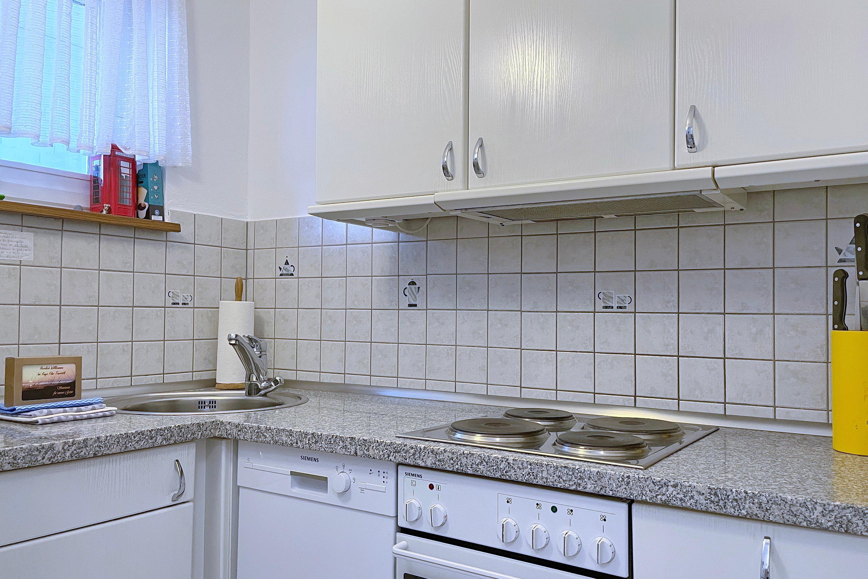 Am Rande von Wyk befindet sich das Matthias-Petersen- Haus mit 30 Wohneinheiten. Die Erdgeschosswohnung Nummer 1 lädt 2-4 Personen zu herrlichen Urlaubstagen ein. Abgehend vom Flur erreichen Sie alle Zimmer. Der helle Wohn- Essbereich mit WLAN, Flachbild-TV, DVD- und Video-Player und einer kleinen Auswahl an Büchern wirkt durch viele maritime Accessoires behaglich und gemütlich. Das neue Schlafsofa mit Bettkasten (1,70 x 190 cm) bietet eine Schlafgelegenheit für eine 3. und 4. Person. Vom Wohnzimmer gelangen Sie auf den überdachten, windgeschützten Balkon und können den Tag gemütlich ausklingen lassen. Das helle Bad mit Dusche und Handtuchheizkörper ist funktional ebenso wie die separate, offene Küche mit Geschirrspüler, Backofen, Kühlschrank mit Gefrierfach, Wasserkocher, Kaffeemaschine und Toaster. Das separate Schlafzimmer mit geräumigem Kleiderschrank, Doppelbett (180x200cm)und Fenster sorgt für erholsame Träume. Genießen Sie entspannte Urlaubstage! Das Haus selbst verfügt über einen gemeinschaftlich nutzbaren Parkplatz und eine große Liegewiese mit Grillhütte und Grill. Fahrradständer stehen zur Verfügung. Im Untergeschoss des Hauses, das Sie mit einem Aufzug oder per Treppe erreichen können, befinden sich neben der Waschküche mit Waschmaschine, Trockner (gegen Gebühr) und Wäscheleine auch ein Angebot an Beschäftigungsmöglichkeiten. So können Sie kostenfrei ein Workout im kleinen Fitnessraum machen. Für Entspannung sorgt die gemeinschaftliche Sauna ( gegen Gebühr), bei der Sie Ihre Wunschzeit in einer Liste reservieren können. Der Bäcker und die Bushaltestelle befinden sich in fußläufiger Entfernung und der Südstrand lockt mit schönen Aussichten.
