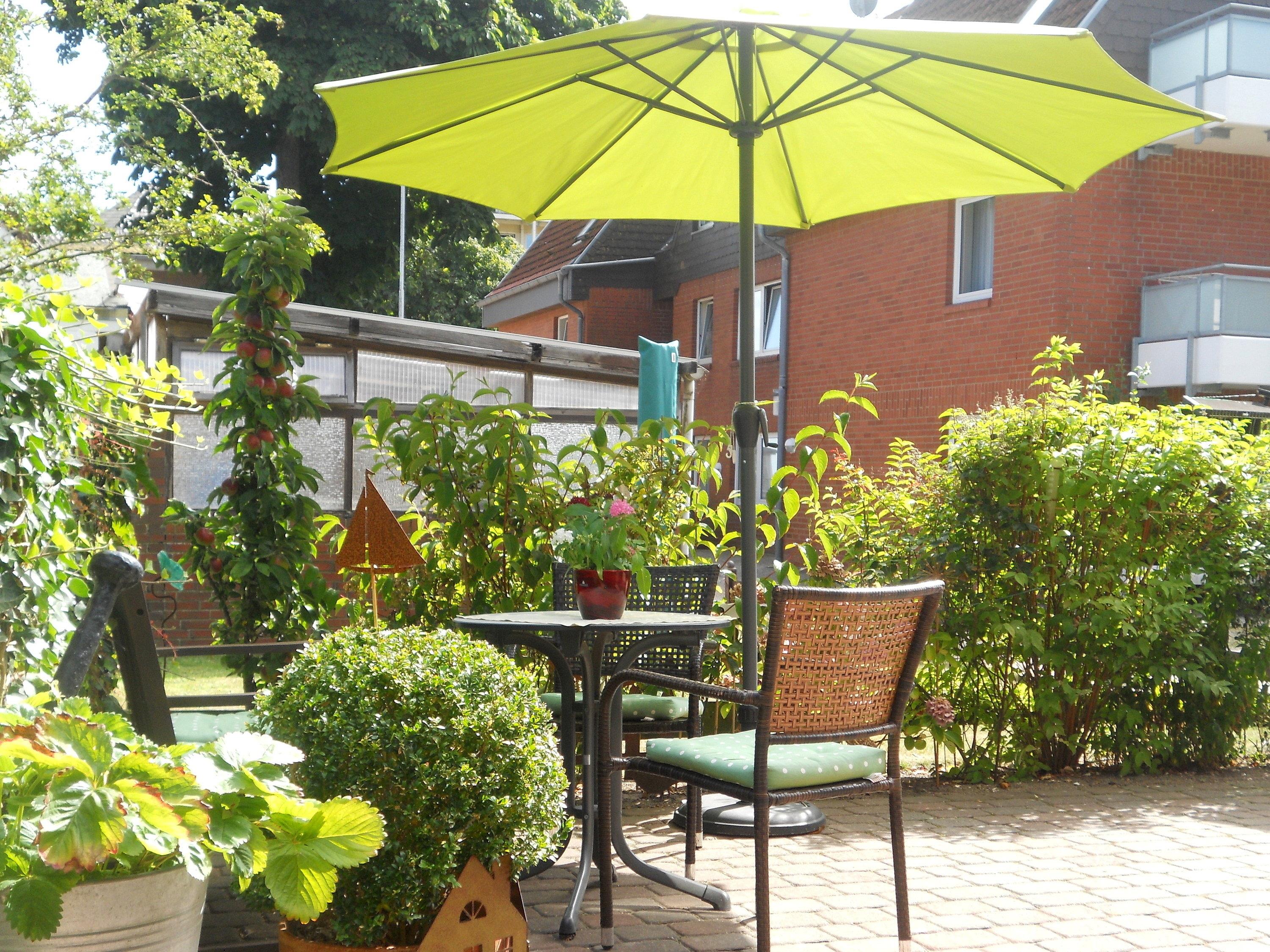 Im Garten befindet sich zur gemeinsamen Nutzung eine Sitzgelegenheit für die Wohnungen Störtebecker und Rungholt.