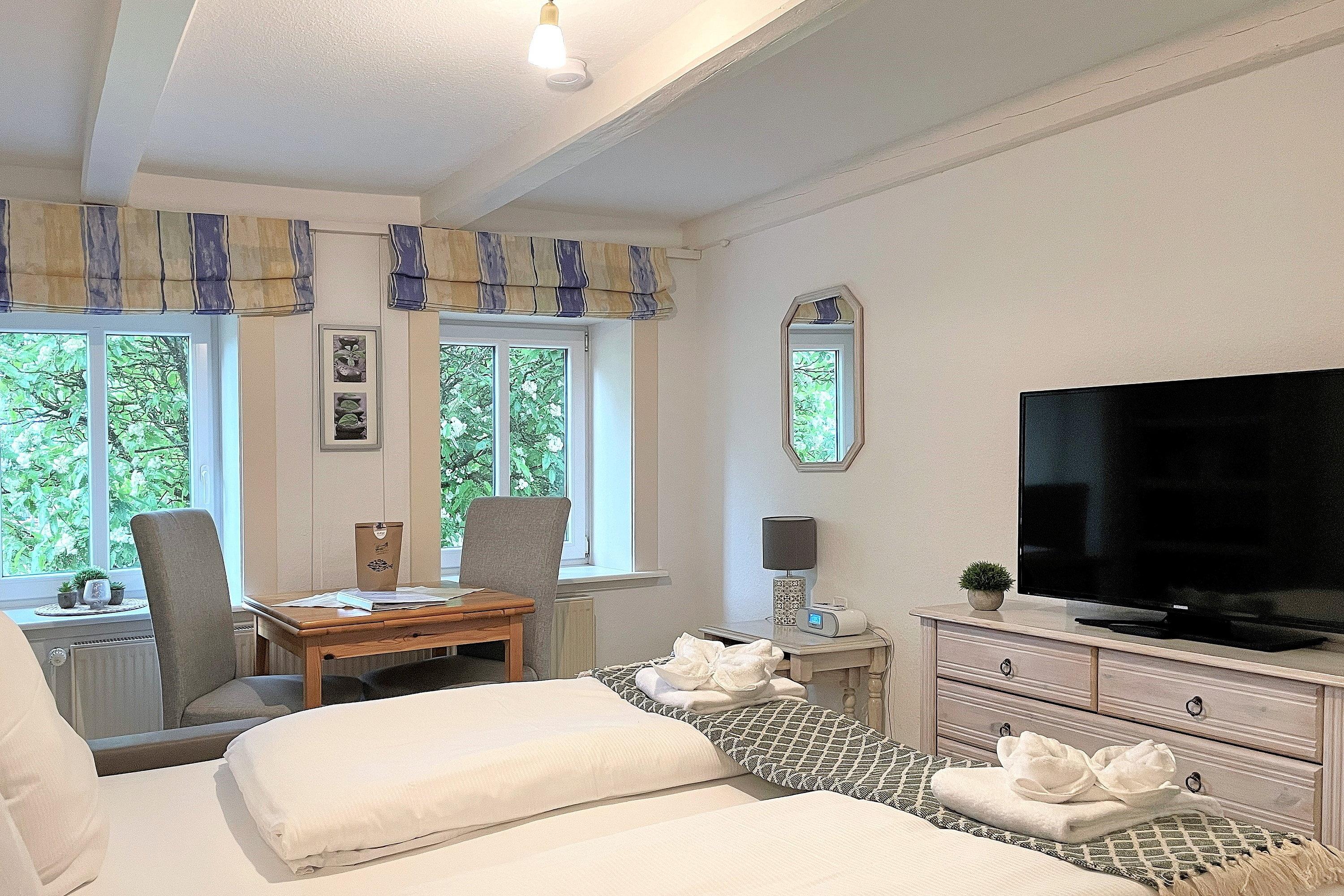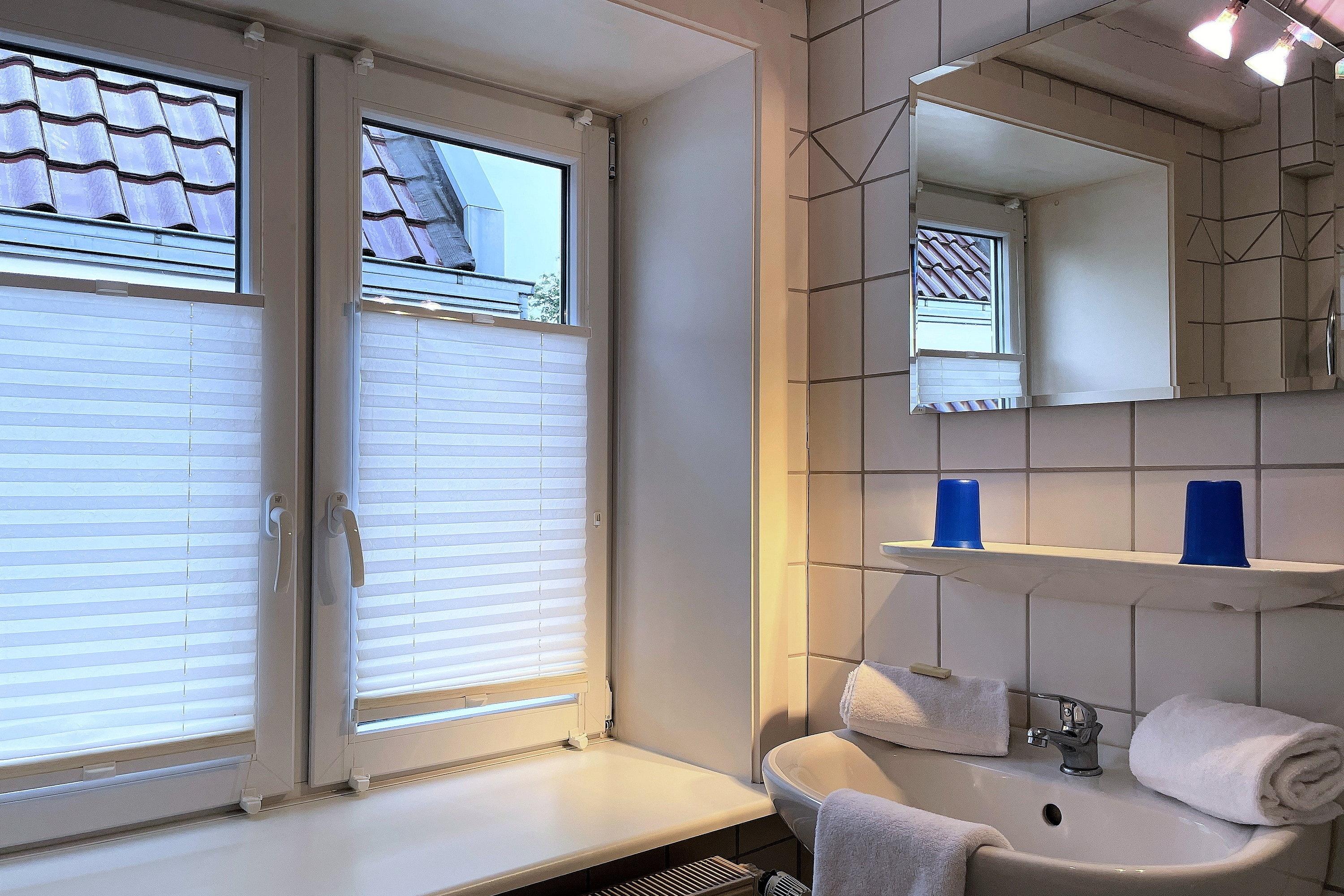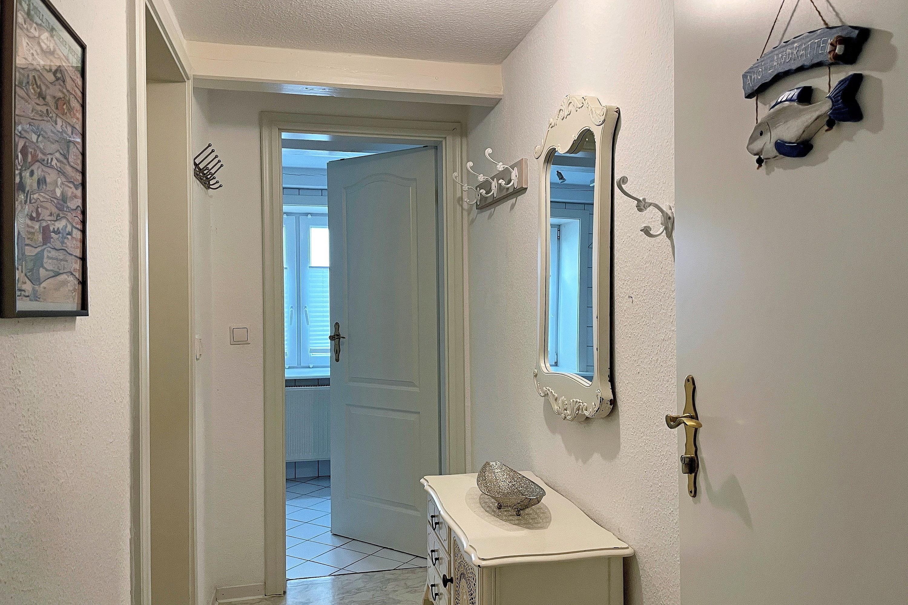 Die kleine, gemütliche Ferienwohnung Nordwind ist ein 1-Raum-Appartement mit Küchennische und einem Wohnschlafraum. Die Couch kann ausgezogen werden (Liegefläche 170cm x 195 cm) und der Essplatz am Fenster lädt zu gemütlichen Stunden ein. Das kleine Duschbad ist funktional und mit einem Fenster ausgestattet. Die Küche mit Mikrowelle, Ceranfeldherd mit zwei Kochplatten (ohne Backofen) und Geschirrspüler ist gut ausgestattet. Die moderne, liebevoll in Stil und Farben abgestimmte Einrichtung verleiht der Wohnung Ihren Charme und lässt Sie herrliche Urlaubstage erleben. Die Bäckerei, das Kino, gemütliche Cafés und Restaurants, der Edeka-Markt und viele kleine und größere Geschäfte befinden sich in unmittelbarer Umgebung genauso wie der Strand und das Meer natürlich..