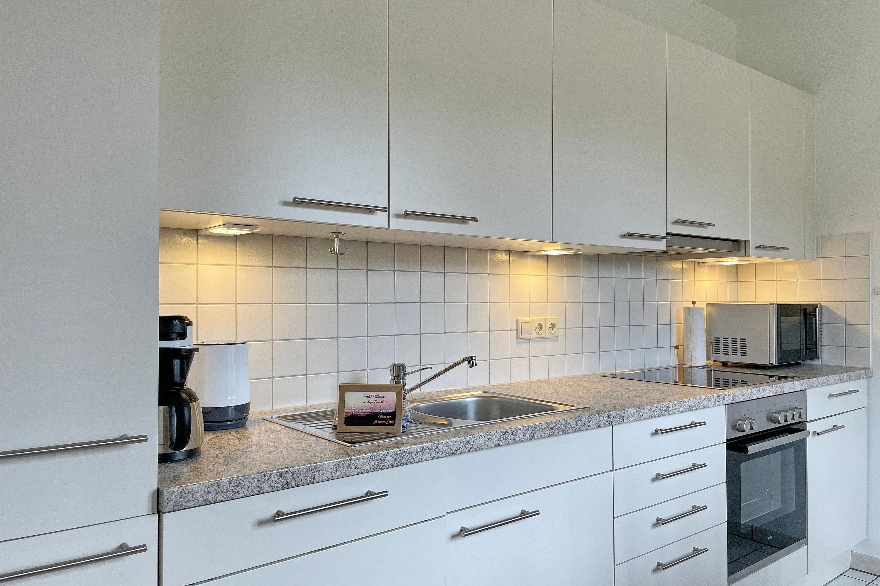 Sie betreten die Wohnung über eine Terrasse. Von einem kleinen Flur kommt man direkt in das gemütliche Wohnzimmer. Die Couch kann mit wenigen Handgriffen in ein Doppelbett (170x190cm) verwandelt werden. Bei einem guten Buch, einer schönen Fernsehsendung oder lustigen Gesellschaftsspielen lassen sich die Abende kurzweilig gestalten. Das großzügige Schlafzimmer ist mit einem geräumigen Wandschrank (mit TV) und einem Doppelbett (zwei Matratzen 90x200 cm) ausgestattet. Ausgeschlafen und gut erholt nehmen Sie Ihren Morgenkaffee am Esstisch in der gut ausgestatteten Küche einschl. Geschirrspüler, Mikrowelle, Backofen, Senseo Duo (Kaffeepad- [&] Filtermaschine) und vieles mehr ein und genießen die ersten Sonnenstrahlen des neuen Tages. Die Wohnung verfügt über ein freundliches, helles Duschbad.