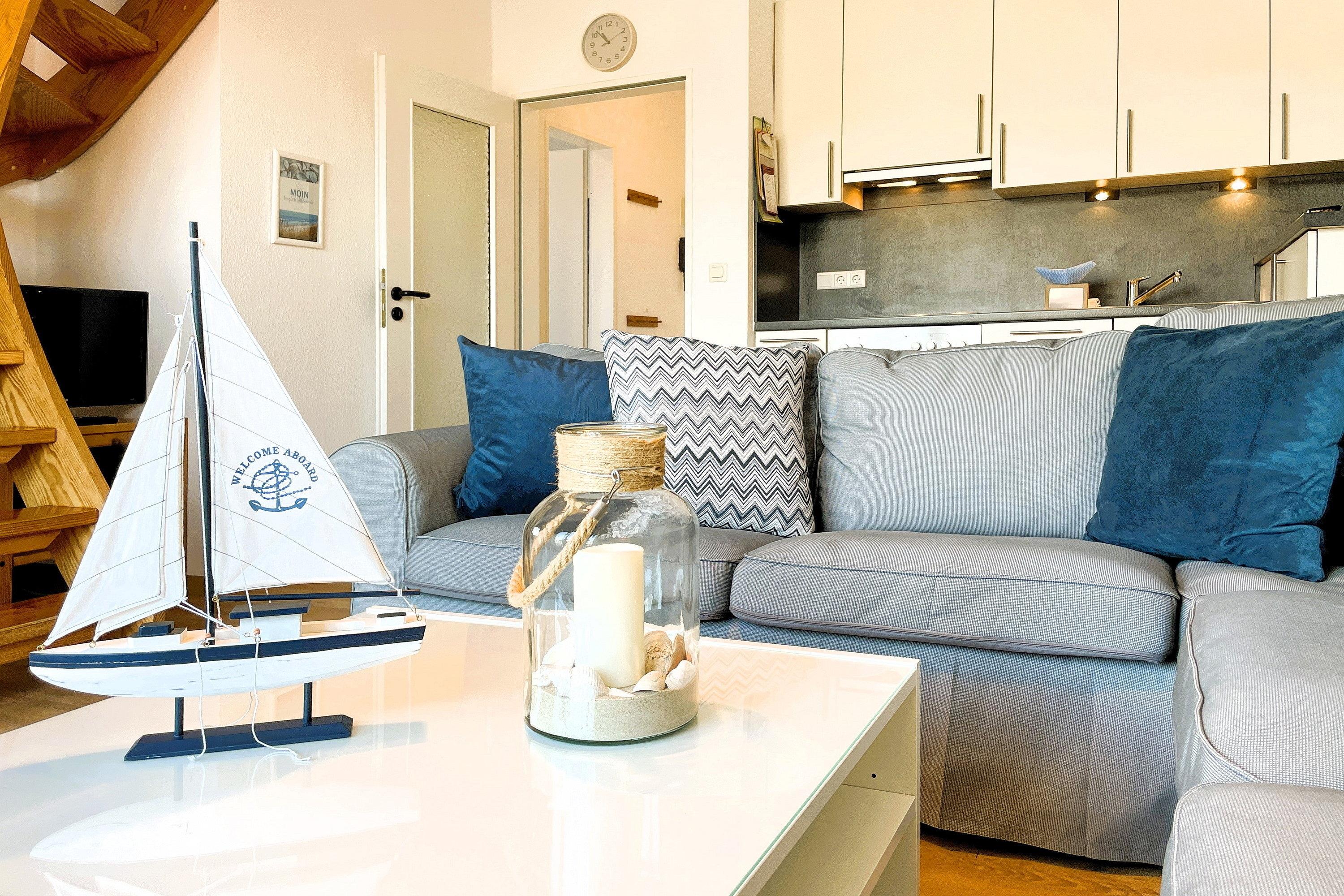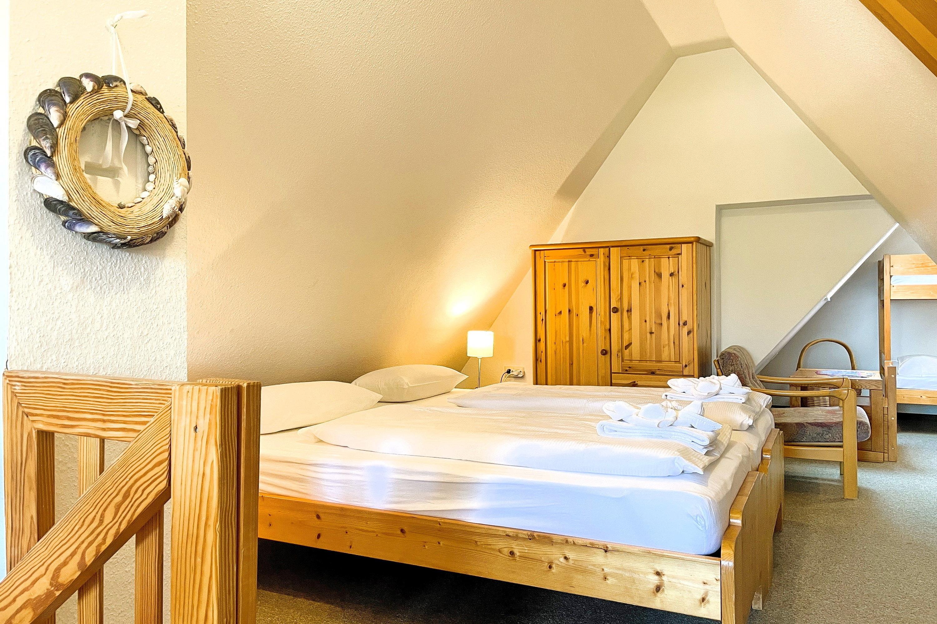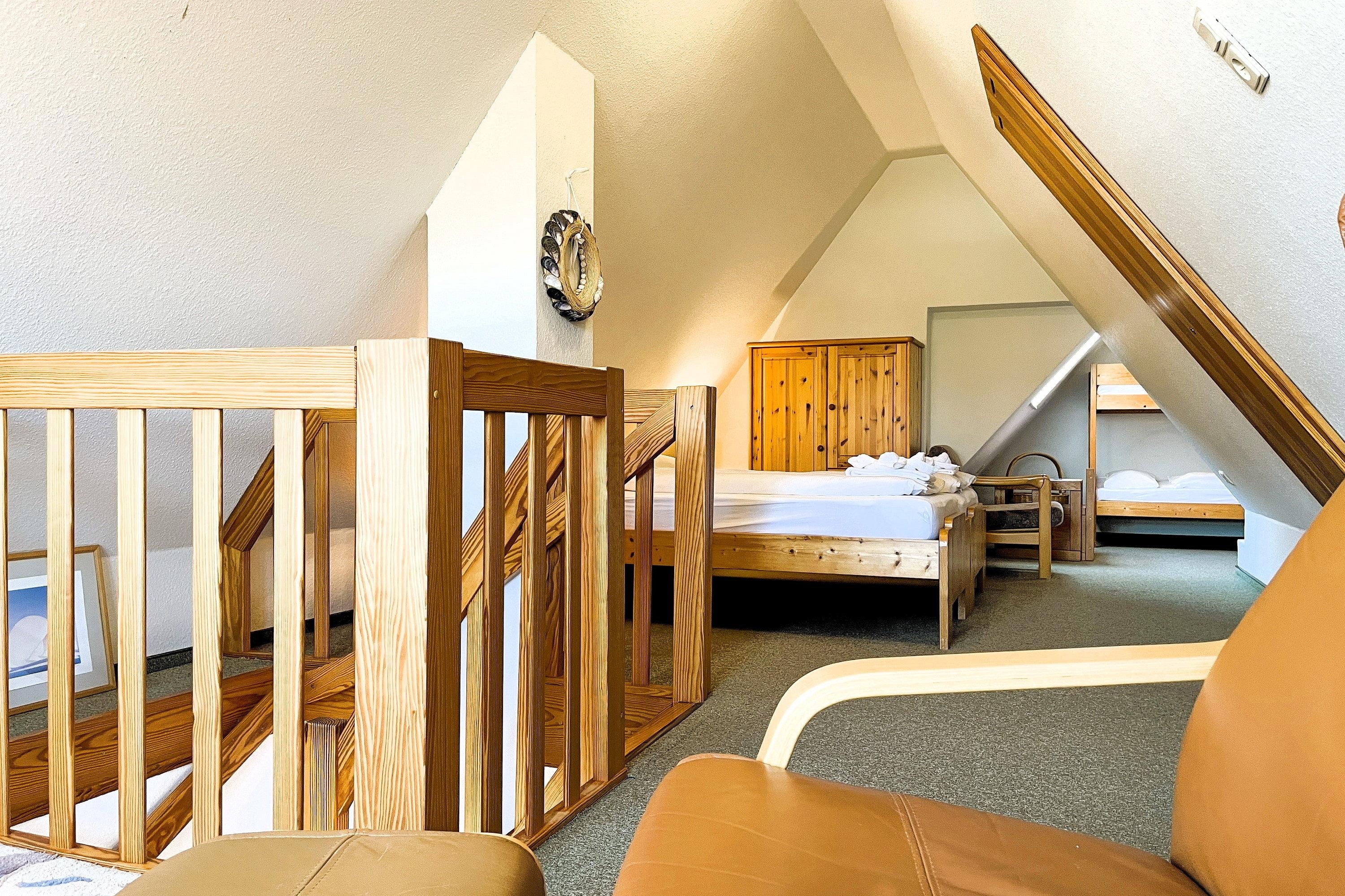 Zentral gelegen eignen sich die Wohnungen im Haus Seeadler ideal für alle Gäste, die gerne schnell mitten im Geschehen sein wollen. In wenigen Schritten sind Sie am Strand, in der Innenstadt oder erreichen die einladenden Restaurants und Cafés. Unser Seeadler 14 ist eine helle Maisonette-Wohnung in der beliebten Anlage Seeadler am Sandwall - unweit der Wyker Innenstadt. Genießen Sie herrliche Urlaubstage in dieser charmanten Wohnung. Maritime Accessoires geben der Wohnung ihren nordfriesischen Charme. Im zweiten Stock befindet sich der Wohnraum mit einer bequemen Couch, einer integrierten Essecke und einer gut ausgestatteten Küchenzeile. Das moderne Bad ist mit Dusche ausgestattet. Im Schlafzimmer laden zwei Einzelbetten zum Ausschlafen ein. Auf der offenen dritten Etage befindet sich neben einer Leseecke mit Blick auf die Wyker Mühle und ein Doppelbett zum Träumen. Direkt angrenzend steht ein Etagenbett und ein Maltisch für die Kleinen bereit. Im Sommer können Sie auf dem Balkon relaxen, der von ca. Mai bis September mit Gartenmöbeln ausgestattet ist. Schauen Sie gleich nach freien Zeiten in unserem Seeadler 14 und buchen Sie Ihre erholsame Föhrer Auszeit!