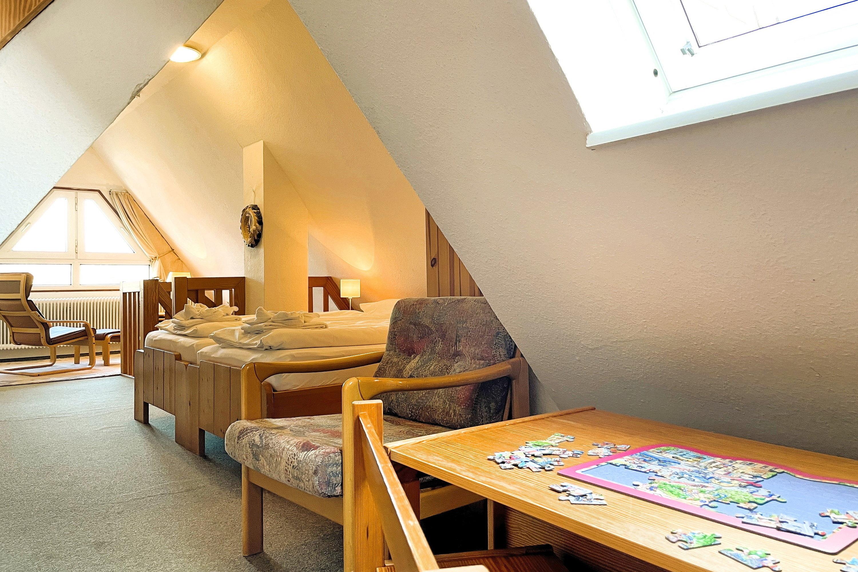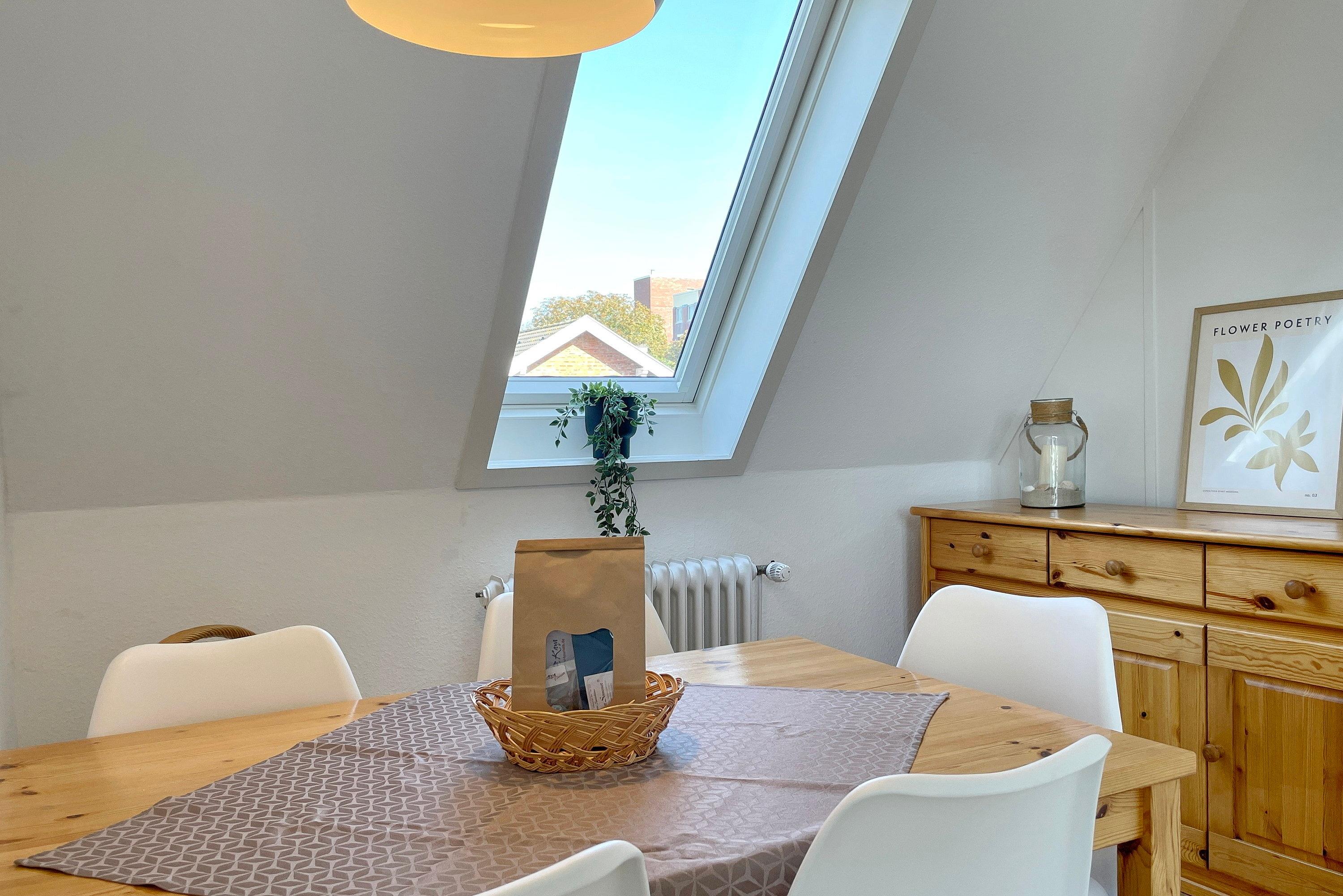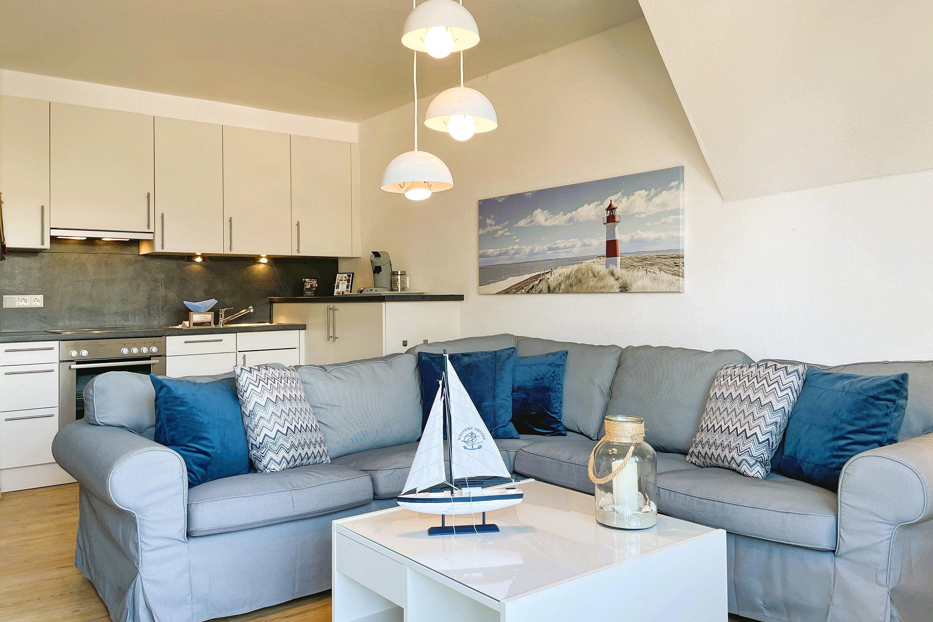 Zentral gelegen eignen sich die Wohnungen im Haus Seeadler ideal für alle Gäste, die gerne schnell mitten im Geschehen sein wollen. In wenigen Schritten sind Sie am Strand, in der Innenstadt oder erreichen die einladenden Restaurants und Cafés. Unser Seeadler 14 ist eine helle Maisonette-Wohnung in der beliebten Anlage Seeadler am Sandwall - unweit der Wyker Innenstadt. Genießen Sie herrliche Urlaubstage in dieser charmanten Wohnung. Maritime Accessoires geben der Wohnung ihren nordfriesischen Charme. Im zweiten Stock befindet sich der Wohnraum mit einer bequemen Couch, einer integrierten Essecke und einer gut ausgestatteten Küchenzeile. Das moderne Bad ist mit Dusche ausgestattet. Im Schlafzimmer laden zwei Einzelbetten zum Ausschlafen ein. Auf der offenen dritten Etage befindet sich neben einer Leseecke mit Blick auf die Wyker Mühle und ein Doppelbett zum Träumen. Direkt angrenzend steht ein Etagenbett und ein Maltisch für die Kleinen bereit. Im Sommer können Sie auf dem Balkon relaxen, der von ca. Mai bis September mit Gartenmöbeln ausgestattet ist. Schauen Sie gleich nach freien Zeiten in unserem Seeadler 14 und buchen Sie Ihre erholsame Föhrer Auszeit!
