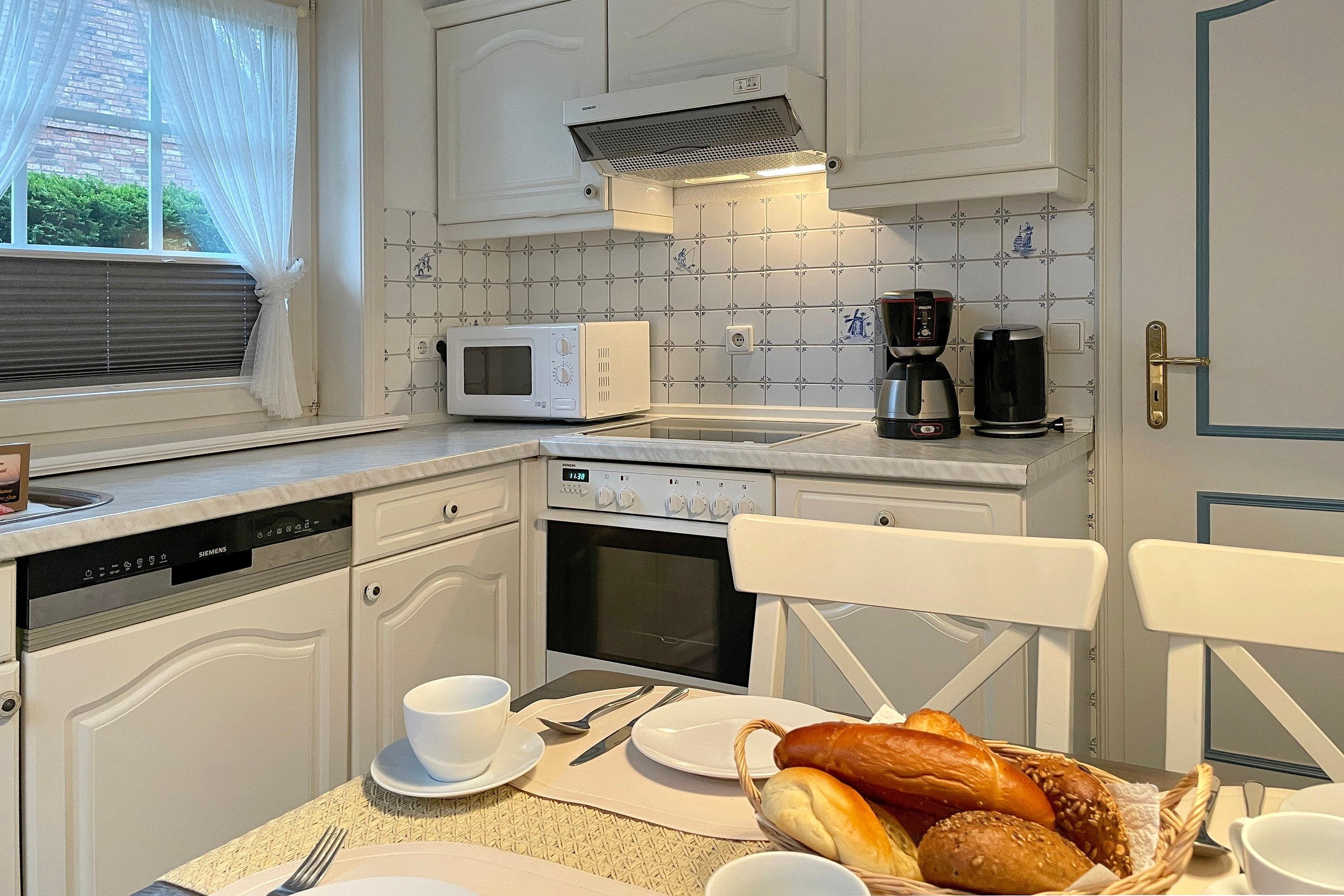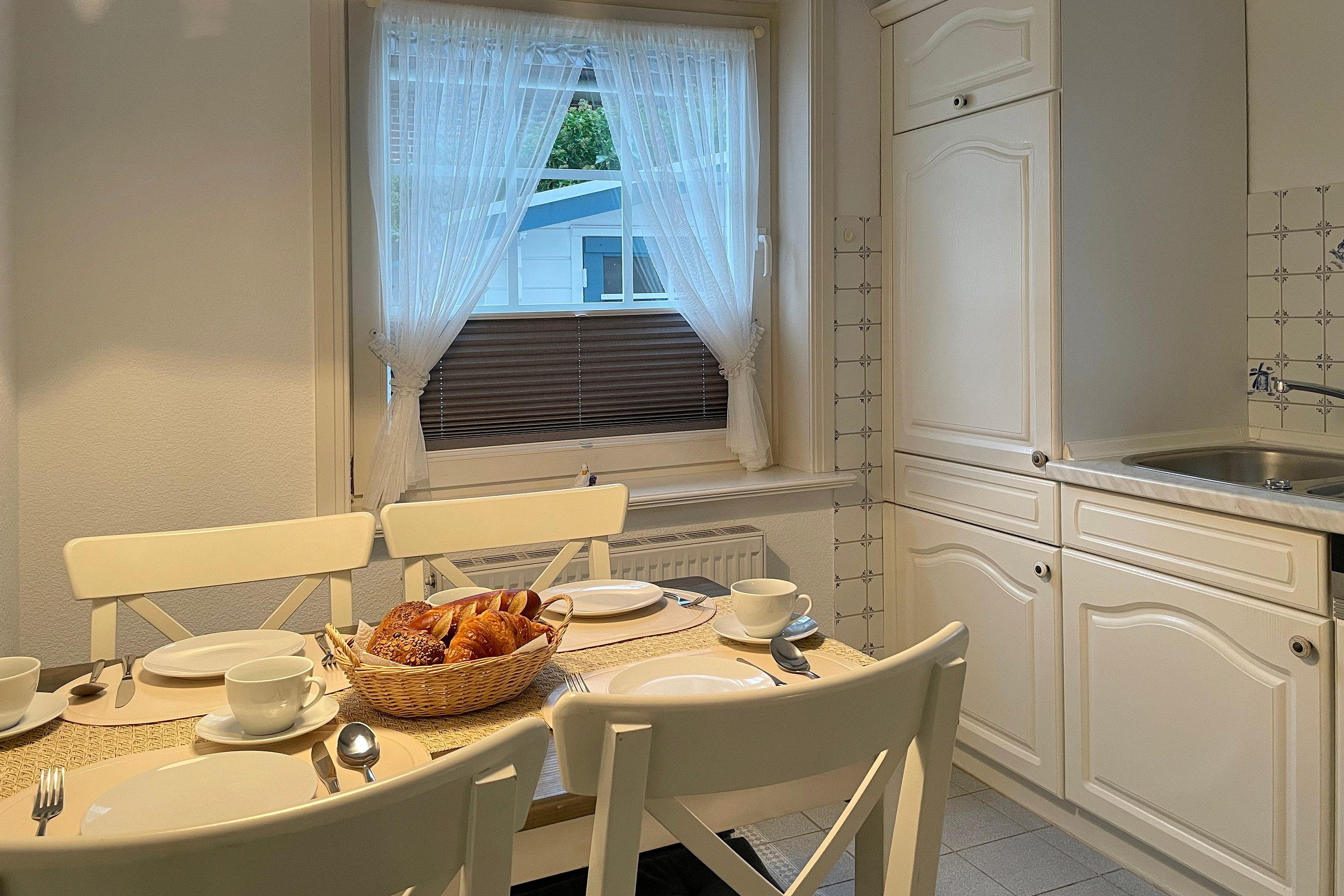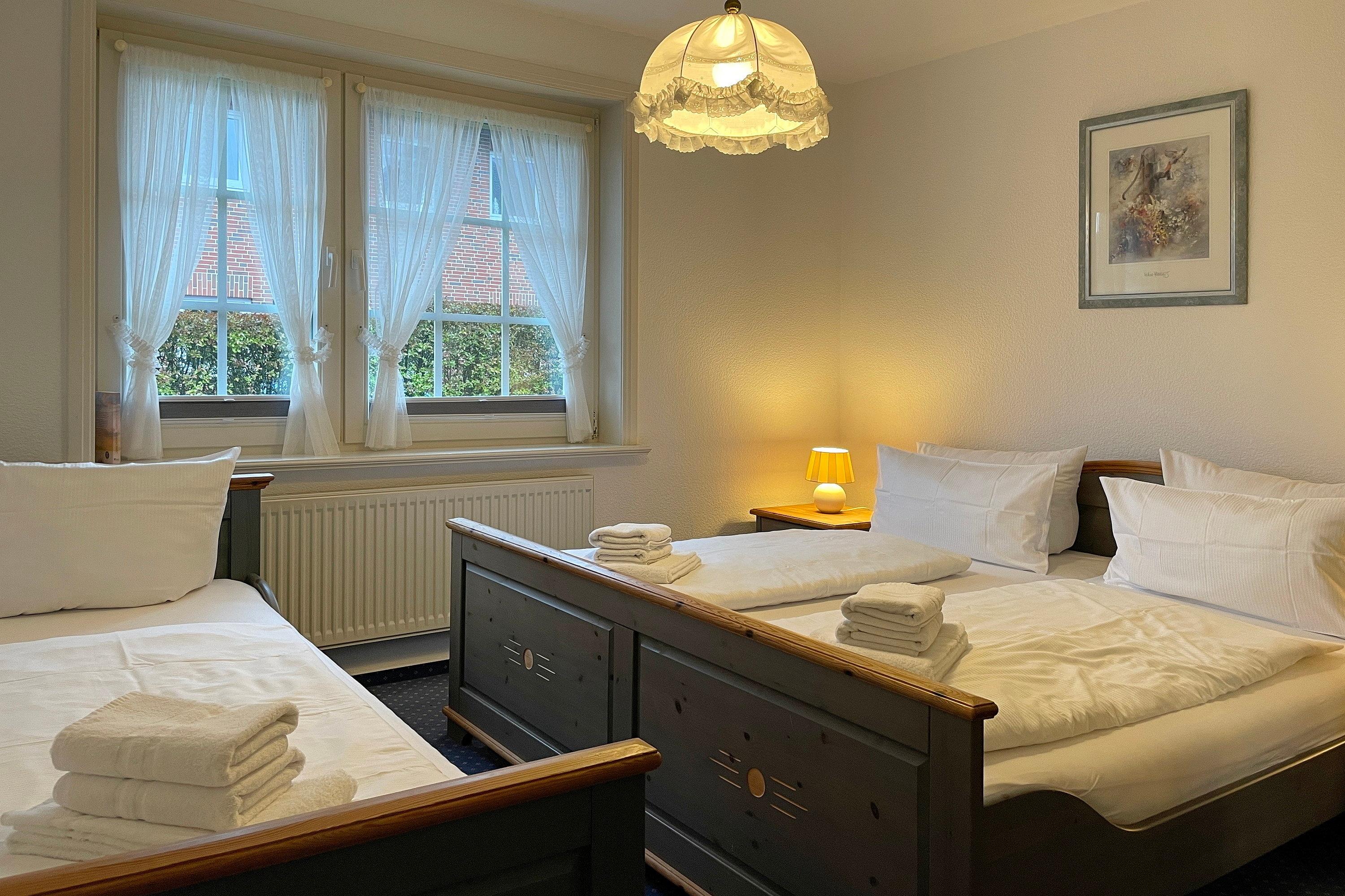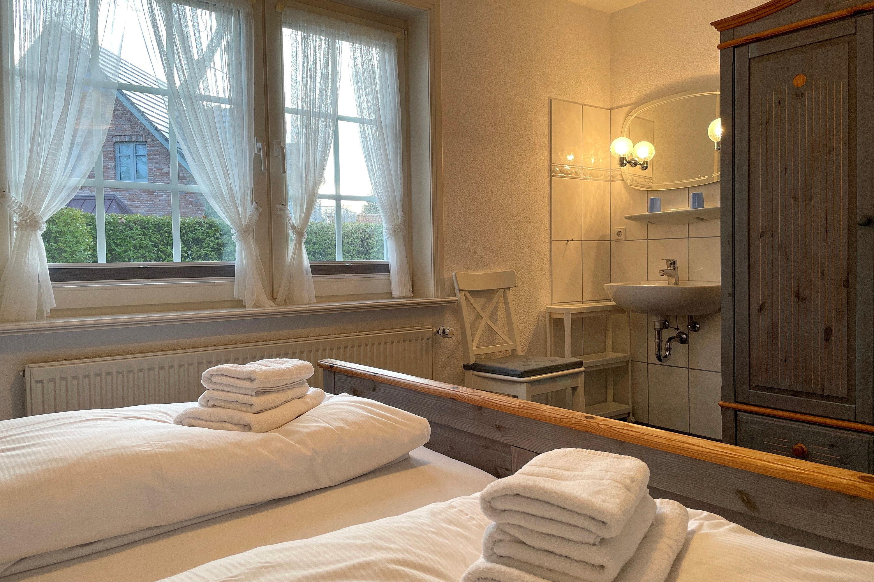 Unsere ca. 66 qm große Erdgeschosswohnung Sieck 01 bietet sich für 4 bis maximal 5 Personen an, um herrliche Urlaubstage zu erleben. Die gepflegte Wohnung wurde liebevoll eingerichtet und alle Zimmer sind vom Flur aus zu erreichen. Lichtdurchflutet und mit W-Lan, Flachbild-TV und CD-Player ausgestattet, können Sie eine gemütliche, gemeinsame Zeit im Wohnzimmer verbringen. Eine bequeme Sitzgruppe lädt zum Relaxen ein. Das Elternschlafzimmer verfügt neben dem Doppelbett und einem Kleiderschrank auch über ein zusätzliches Waschbecken. Im zweiten Schlafraum befinden sich ein Kleiderschrank, ein Doppel- und ein Einzelbett. Das Bad ist hellgefliest und zweckmäßig mit Dusche, Fenster und Handtuchheizkörper gestaltet. In der gut ausgestatteten Küche mit Sitzecke, Ceranfeldherd mit Backofen, Geschirrspüler, Kühlschrank mit Gefrierfach und Kaffeemaschine macht das Kochen auch zu Hause Spaß! Besonders für unsere Gäste, die gerne ruhig und doch zentral wohnen möchten, bietet sich unser Haus Sieck ideal an.