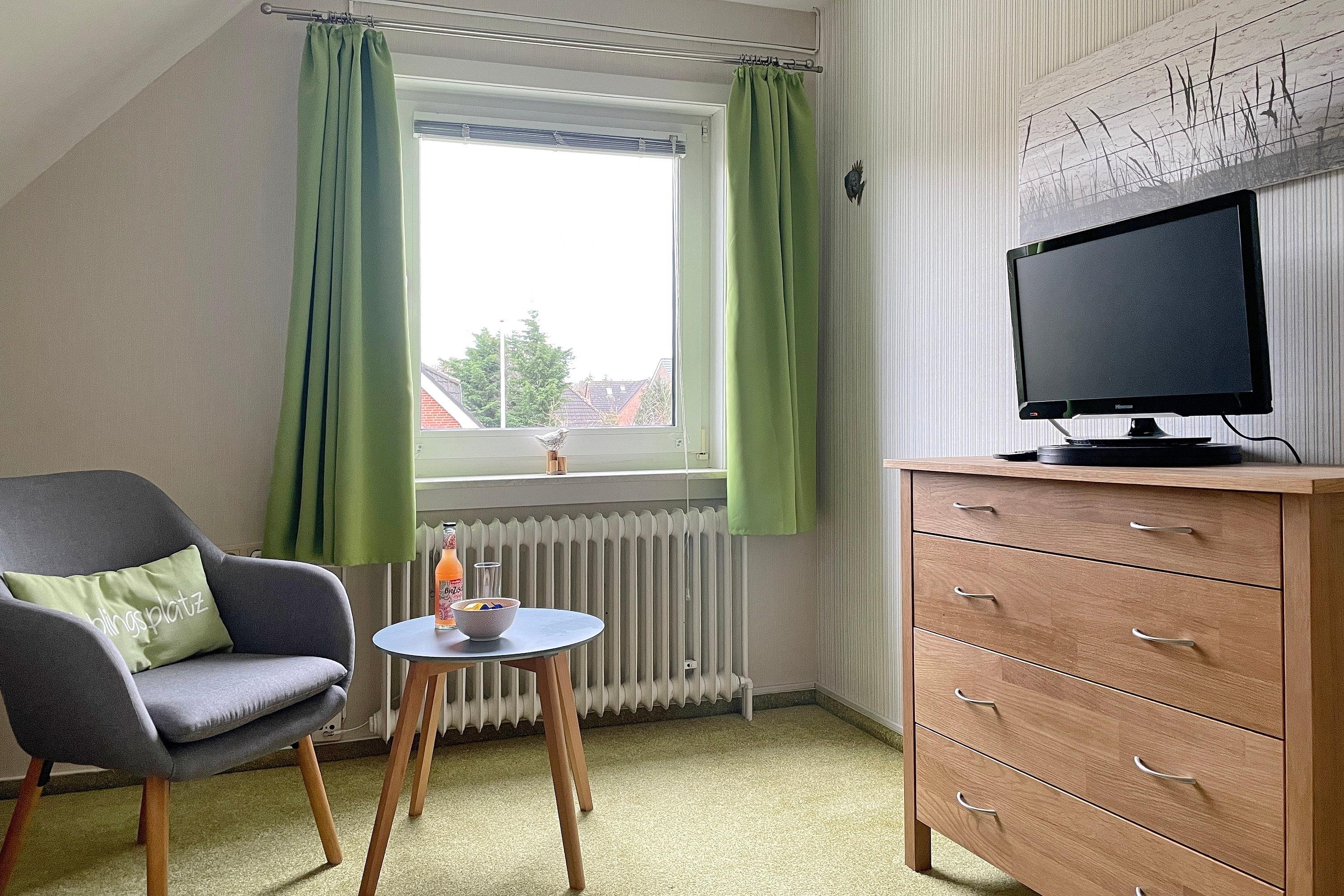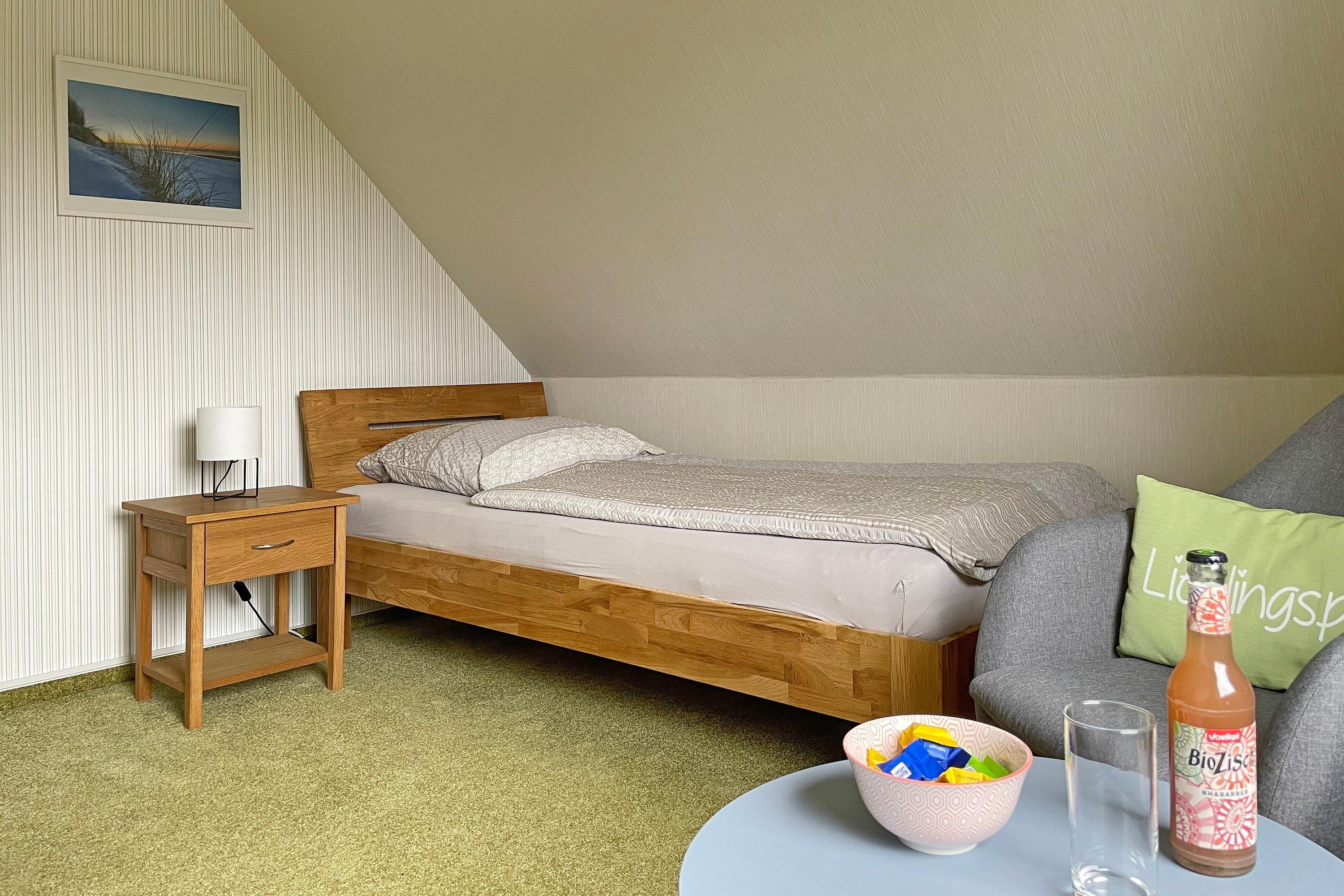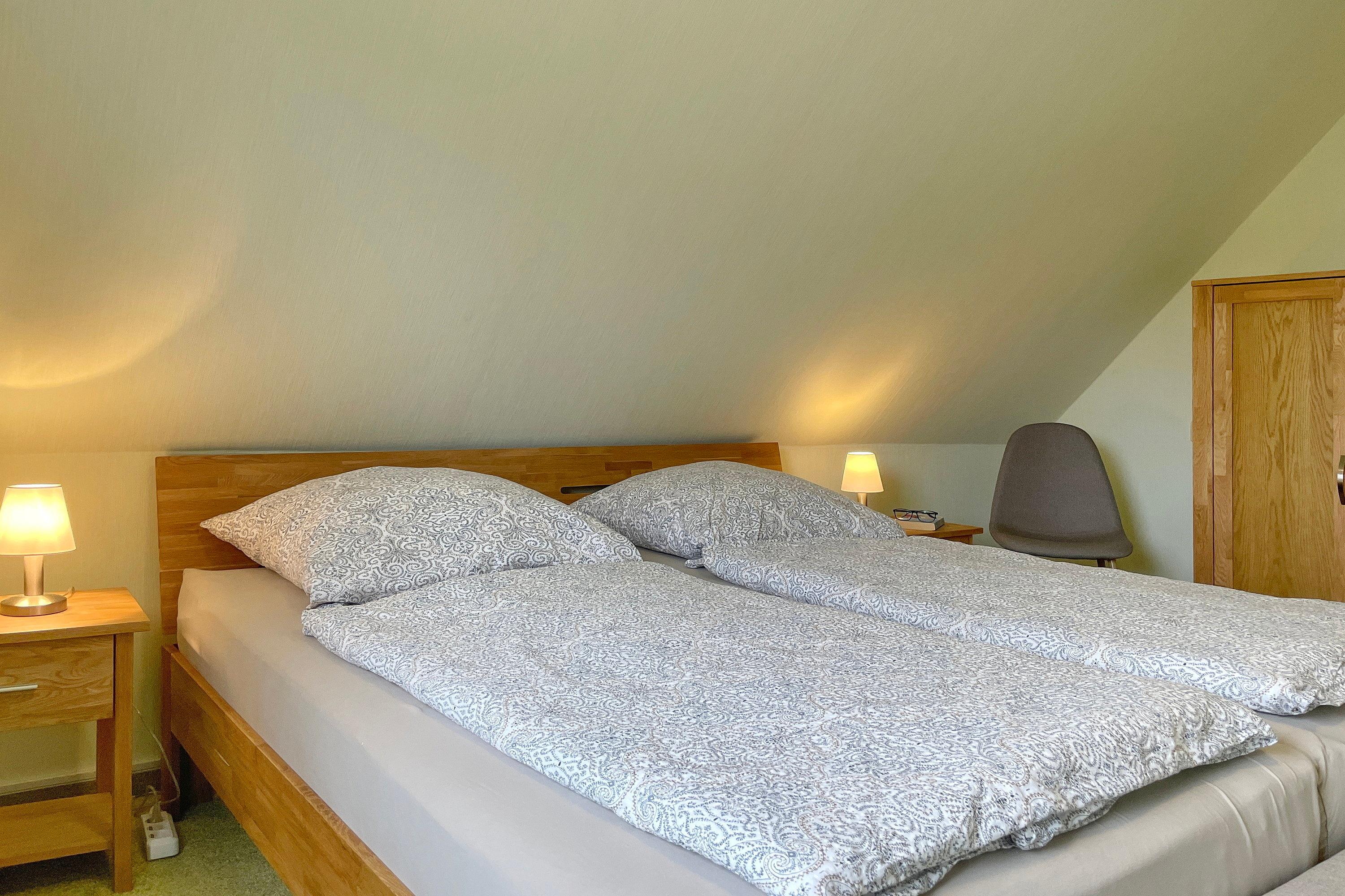 Unser Sonnenblick verfügt über ein geräumiges Wohnzimmer mit WLAN, bequemer Fernsehecke, einem gemütlichem Lesesessel sowie einer kleinen Auswahl an Büchern. Hier integriert finden Sie auch einen Essplatz für drei Personen. Die Küchenzeile mit Kühlschrank, Geschirrspüler, Ceranfeld und Backofen ist funktional hergerichtet und für Ihren Urlaub gut ausgestattet. Das Bad mit Fenster ist hell und die Dusche verfügt über einen niedrigen Einstieg. Das Schlafzimmer mit Doppelbett (180 x 200 cm) und Verdunklungsmöglichkeit lädt zu geruhsamen Nächten ein. Ein weiteres Schlafzimmer verfügt über ein Einzelbett (90 x 200 cm).